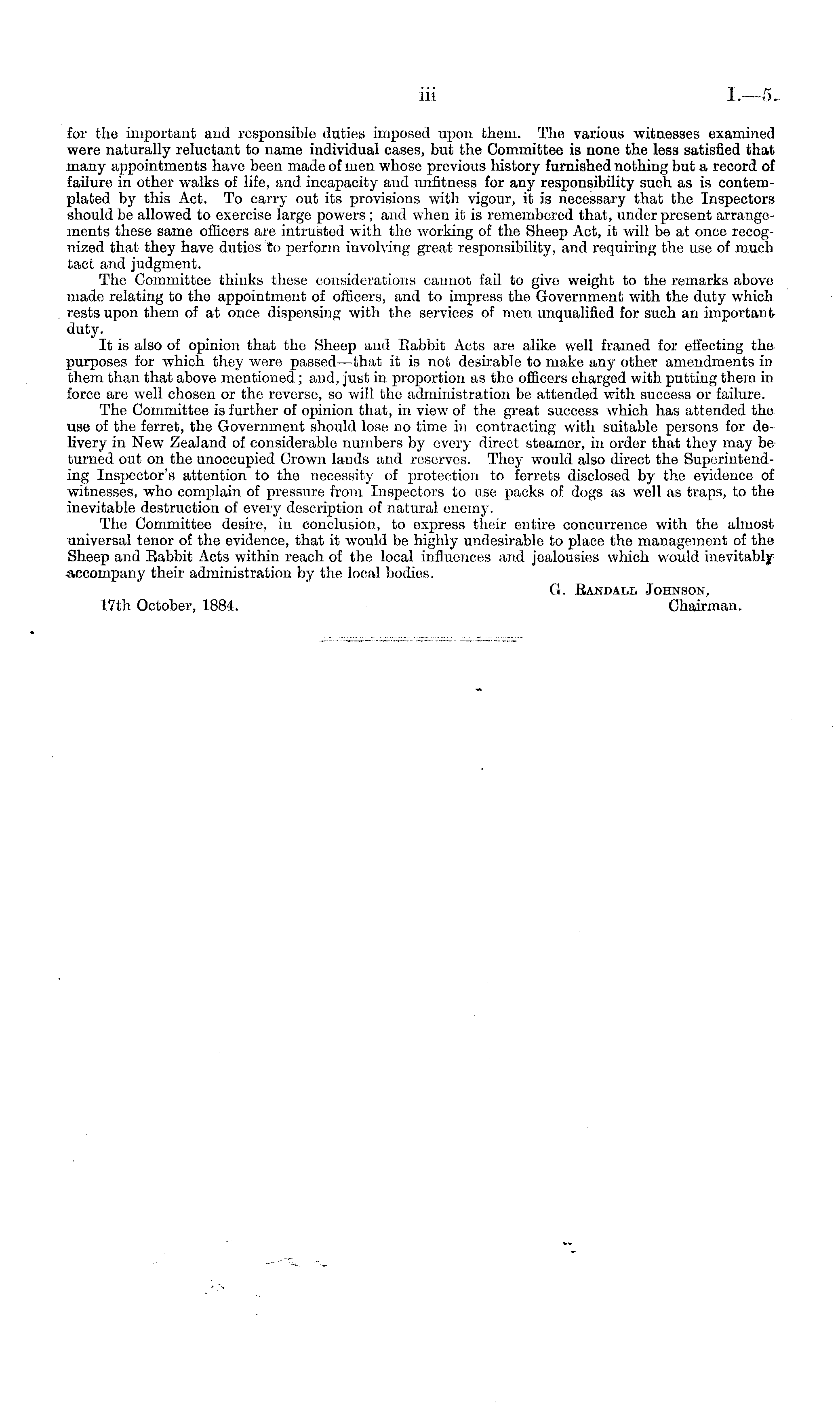 for the important and responsible duties imposed upon them. The various witnesses examined were naturally reluctant to name individual cases, but the Committee is none the less satisfied that many appointments have been made of men whose previous history furnished nothing but a record of failure in other walks of life, and incapacity and unfitness for any responsibility such as is contemplated by this Act. To carry out its provisions with vigour, it is necessary that the Inspectors should be allowed to exercise large powers; and when it is remembered that, under present arrangements these same officers are intrusted with the working of the Sheep Act, it will be at once recognized that they have duties to perform involving great responsibility, and requiring the use of much tact and judgment. The Committee thinks these considerations cannot fail to give weight to the remarks above made relating to the appointment of officers, and to impress the Government with the duty which rests upon them of at once dispensing with the services of men unqualified for such an important duty. It is also of opinion that the Sheep and Rabbit Acts are alike well framed for effecting the purposes for which they wore passed—that it is not desirable to make any other amendments in them than that above mentioned ; and, just in proportion as the officers charged with putting them in force are well chosen or the reverse, so will the administration be attended with success or failure. The Committee is further of opinion that, in view of the great success which has attended the use of the ferret, the Government should lose no time in contracting with suitable persons for delivery in New Zealand of considerable numbers by every direct steamer, in order that they may be turned out on the unoccupied Crown lands and reserves. They would also direct the Superintending Inspector's attention to the necessity of protection to ferrets disclosed by the evidence of witnesses, who complain of pressure from Inspectors to use packs of dogs as well as traps, to the inevitable destruction of every description of natural enemy. The Committee desire, in conclusion, to express their entire concurrence with the almost universal tenor of the evidence, that it would be highly undesirable to place the management of the Sheep and Rabbit Acts within reach of the local influences and jealousies which would inevitably Accompany their administration by the local bodies. G. BandAt.E Johnson, 17th October, 1884. Chairman.