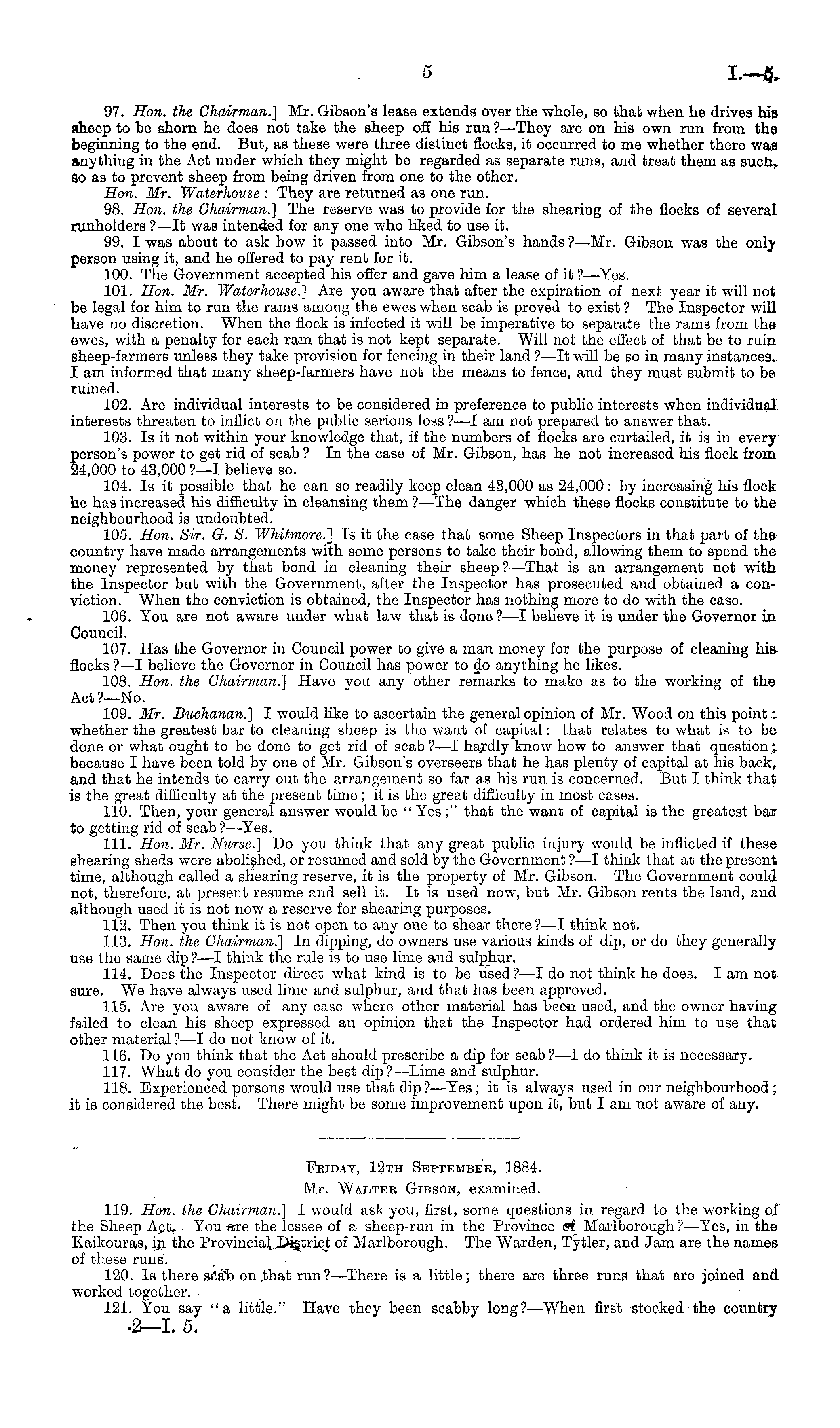 Feidat, 12th Septembee, 1834. Mr. Walteb Gibson, examined. 119. Hon. the Chairman.] I would ask you, first, some questions in regard to the working of the Sheep Act. You are the lessee of a sheep-run in the Province &i Marlborough?—Yes, in the Kaikouras, in the Provincial.District of Marlborough. The Warden, Tytler, and Jam are the names of these runs. 120. Is there scab on that run?— There is a little; there are three runs that are joined and worked together. 121. You say "a little." Have they been scabby long?—-When first stocked the country •2—l. 5.