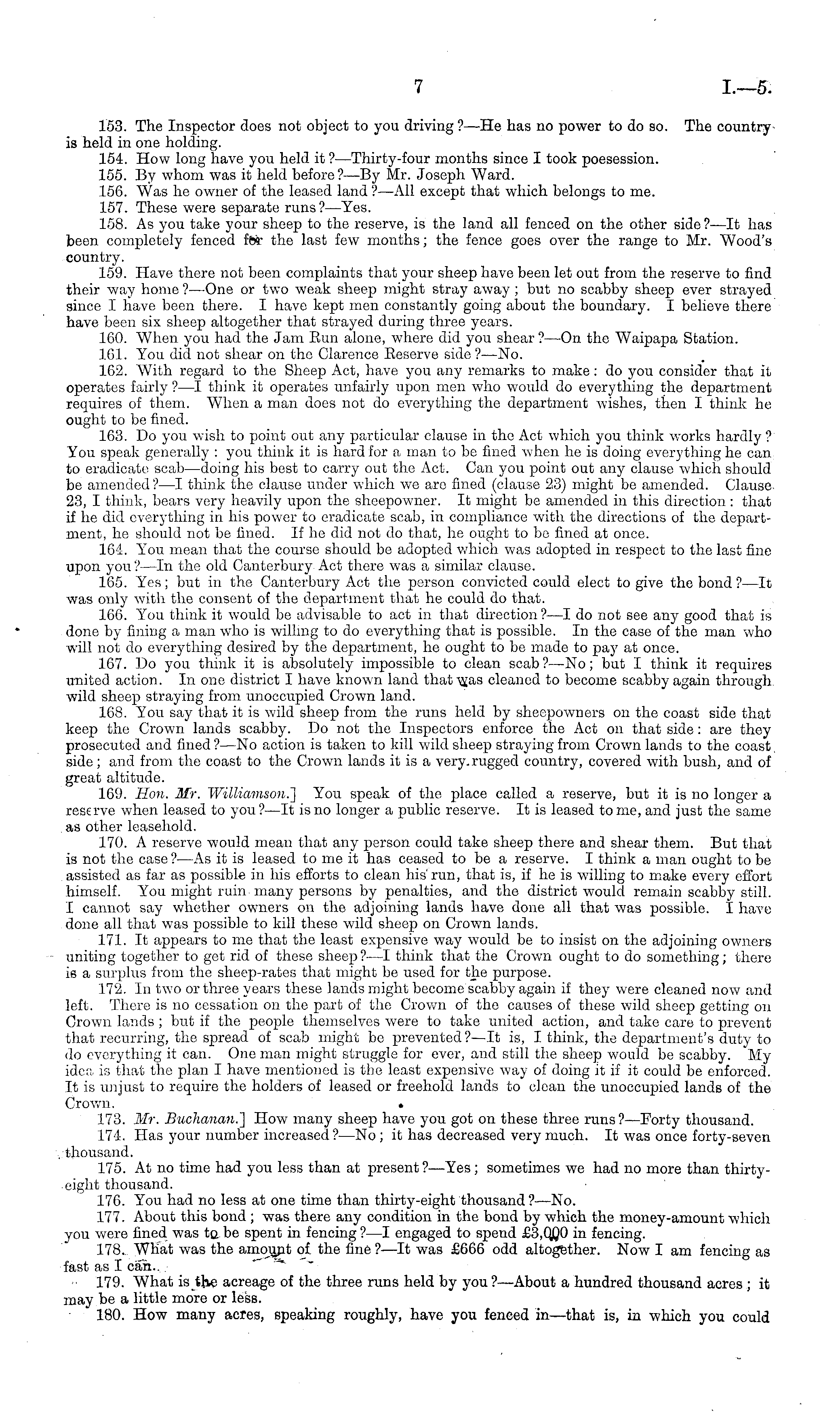 153. The Inspector does not object to you driving ?—He has no power to do so. The country is held in one holding. 154. How long have you held it ? —Thirty-four months since I took poesession. 155. By whom was it held before ?—By Mr. Joseph Ward. 156. Was he owner of the leased land ?—All except that which belongs to me. 157. These were separate runs ? —Yes. 158. As you take your sheep to the reserve, is the land all fenced on the other side ? —lt has been completely fenced for the last few months; the fence goes over the range to Mr. Wood's country. 159. Have there not been complaints that your sheep have been let out from the reserve to find their way home ?—One or two weak sheep might stray away ; but no scabby sheep ever strayed since I have been there. I have kept men constantly going about the boundary. I believe there have been six sheep altogether that strayed during three years. 160. When you had the Jam Bun alone, where did you shear?—On the Waipapa Station. 161. You did not shear on the Clarence Beserve side ? —No. 162. With regard to the Sheep Act, have you any remarks to make: do you consider that it operates fairly ?—I think it operates unfairly upon men who would do everything the department requires of them. When a man does not do everything the department wishes, then I think he ought to be fined. 163. Do you wish to point out any particular clause in the Act which you think works hardly ? You speak generally : you think it is hard for a man to be fined when he is doing everything he can to eradicate scab—doing his best to carry out the Act. Can you point out any clause which should be amended?—l think the clause under which we arc fined (clause 23) might be amended. Clause. 23, I think, bears very heavily upon the shoepowner. It might bo amended in this direction : that if he did everything in his power to eradicate scab, in compliance with the directions of the department, he should not be fined. If he did not do that, he ought to be fined at once. 164. You mean that the course should be adopted which was adopted in respect to the last fine upon you? —In the old Canterbury Act there was a similar clause. 165. Yes; but in the Canterbury Act the person convicted could elect to give the bond ? —lt was only with the consent of the department that he could do that. 166. You think it would be advisable to act in that direction? —I do not see any good that is done by fining a man who is willing to do everything that is possible. In the case of the man who will not do everything desired by the department, he ought to be made to pay at once. 167. Do you think it is absolutely impossible to clean scab?—No; but I think it requires united action. In one district I have known land that vjas cleaned to become scabby again through wild sheep straying from unoccupied Crown land. 168. You say that it is wild sheep from the runs held by sheepowners on the coast side that keep the Crown lands scabby. Do not the Inspectors enforce the Act on that side: are they prosecuted and fined ? —No action is taken to kill wild sheep straying from Crown lands to the coast side; and from the coast to the Crown lands it is a very.rugged country, covered with bush, and of great altitude. 169. Hon. Mr. Williamson.) You speak of the place called a reserve, but it is no longer a reserve when leased to you?—lt is no longer a public reserve. It is leased tome, and just the same as other leasehold. 170. A reserve would mean that any person could take sheep there and shear them. But that is not the case ?—As it is leased to me it has ceased to be a reserve. I think a man ought to be assisted as far as possible in his efforts to clean his' run, that is, if he is willing to make every effort himself. You might ruin many persons by penalties, and the district would remain scabby still. I cannot say whether owners on the adjoining lands have done all that was possible. I have done all that was possible to kill these wild sheep on Crown lands. 171. It appears to me that the least expensive way would be to insist on the adjoining owners uniting together to get rid of these sheep?—l think that the Crown ought to do something; there is a surplus from the sheep-rates that might be used for the purpose. 172. In two or three years these lands might become scabby again if they were cleaned now and left. There is no cessation on the part of the Crown of the causes of these wild sheep getting on Crown lands ; but if the people themselves were to take united action, and take care to prevent that recurring, the spread of scab might be prevented?—lt is, I think, the department's duty to do everything it can. One man might struggle for ever, and still the sheep would be scabby. My idea is that the plan I have mentioned is the least expensive way of doing it if it could be enforced. It is unjust to require the holders of leased or freehold lands to clean the unoccupied lands of the Crown. • 173. Mr. Buchanan.) How many sheep have you got on these three runs ? —Forty thousand. 174. Has your number increased ?—No; it has decreased very much. It was once forty-seven .thousand. 175. At no time had you less than at present ?—Yes; sometimes we had no more than thirtyeight thousand. 176. You had no less at one time than thirty-eight thousand ? —No. 177. About this bond ; was there any condition in the bond by which the money-amount which you were fined was to be spent in fencing ?—I engaged to spend £3,000 in fencing. 178. What was the amount of the fine ? —lt was £666 odd altogether. Now lam fencing as fast as I can. 179. What is the acreage of the three runs held by you?— About a hundred thousand acres ; it may be a little more or less. 180. How many acres, speaking roughly, have you fenced in—that is, in which you could