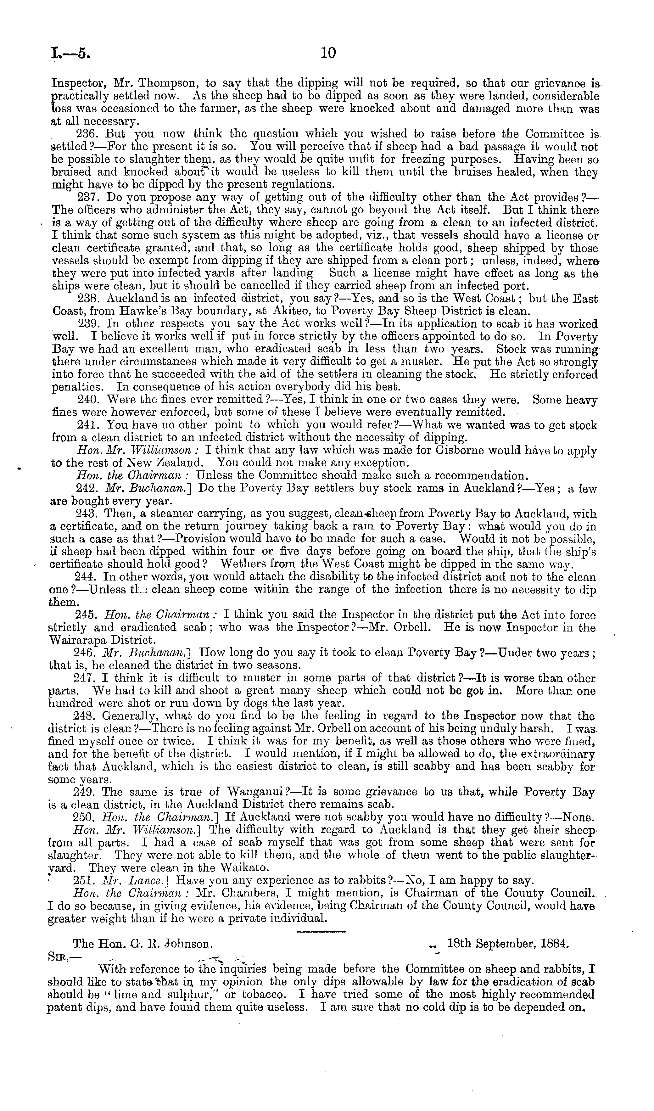 The Hon. G. B. Johnson. „ 18th September, 1884. Sic,— With reference to the inquiries being made before the Committee on sheep and rabbits, I should like to state 'that in my opinion the only dips allowable by law for the eradication of scab should be " lime and sulphur," or tobacco. I have tried some of the most highly recommended patent dips, and have found them quite useless. lam sure that no cold dip is to be depended on.