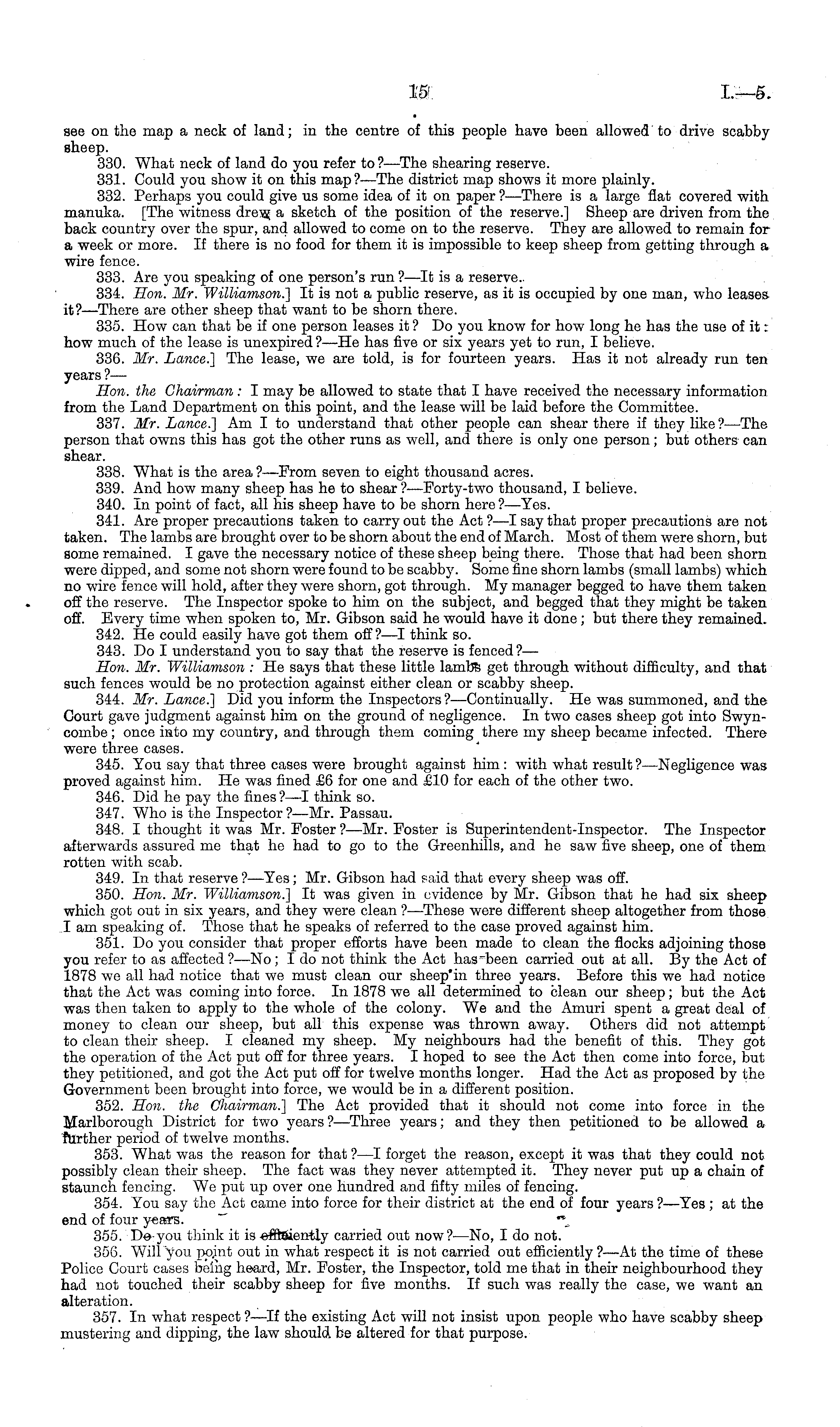 see on the map a neck of land; in the centre of this people have been allowed to drive scabby sheep. 330. What neck of land do you refer to ? —The shearing reserve. 331. Could you show it on this map?— The district map shows it more plainly. 332. Perhaps you could give us some idea of it on paper?— There is a large flat covered with manuka. [The witness drew a sketch of the position of the reserve.] Sheep are driven from the back country over the spur, and allowed to come on to the reserve. They are allowed to remain for a week or more. If there is no food for them it is impossible to keep sheep from getting through a wire fence. 333. Are you speaking of one person's run ?—lt is a reserve.. 334. Hon. Mr. Williamson.) It is not a public reserve, as it is occupied by one man, who leases it? —There are other sheep that want to be shorn there. 335. How can that be if one person leases it ? Do you know for how long he has the use of it:: how much of the lease is unexpired? —He has five or six years yet to run, I believe. 336. Mr. Lance.) The lease, we are told, is for fourteen years. Has it not already run ten years ? — Hon. the Chairman : I may be allowed to state that I have received the necessary information from the Land Department on this point, and the lease will be laid before the Committee. 337. Mr. Lance.) Am I to understand that other people can shear there if they like ?—The person that owns this has got the other runs as well, and there is only one person; but others can shear. 338. What is the area ?—From seven to eight thousand acres. 339. And how many sheep has he to shear ? —Forty-two thousand, I believe. 340. In point of fact, all his sheep have to be shorn here ?—Yes. 341. Are proper precautions taken to carry out the Act ?—I say that proper precautions are not taken. The lambs are brought over to be shorn about the end of March. Most of them were shorn, but some remained. I gave the necessary notice of these sheep being there. Those that had been shorn were dipped, and some not shorn were found to be scabby. Some fine shorn lambs (small lambs) which no wire fence will hold, after they were shorn, got through. My manager begged to have them taken off the reserve. The Inspector spoke to him on the subject, and begged that they might be taken off. Every time when spoken to, Mr. Gibson said he would have it done ; but there they remained. 342. fie could easily have got them off?—l think so. 343. Do I understand you to say that the reserve is fenced?— Hon. Mr. Williamson : He says that these little lambs get through without difficulty, and that such fences would be no protection against either clean or scabby sheep. 344. Mr. Lance.] Did you inform the Inspectors ? —Continually. He was summoned, and the Court gave judgment against him on the ground of negligence. In two cases sheep got into Swyncombe ; once into my country, and through them coming there my sheep became infected. There were three cases. 345. You say that three cases were brought against him : with what result ?—Negligence was proved against him. He was fined £6 for one and £10 for each of the other two. 346. Did he pay the fines?—l think so. 347. Who is the Inspector?— Mr. Passau. 348. I thought it was Mr. Foster ?—Mr. Foster is Superintendent-Inspector. The Inspector afterwards assured me that he had to go to the Greenhills, and he saw five sheep, one of them rotten with scab. 349. In that reserve ? —Yes; Mr. Gibson had said that every sheep was off. 350. Hon. Mr. Williamson.] It was given in evidence by Mr. Gibson that he had six sheep which got out in six years, and they were clean ? —These were different sheep altogether from those lam speaking of. Those that he speaks of referred to the case proved against him. 351. Do you consider that proper efforts have been made to clean the flocks adjoining those you refer to as affected ?—No; Ido not think the Act has been carried out at all. By the Act of 1878 we all had notice that we must clean our sheep'in three years. Before this we had notice that the Act was coming into force. In 1878 we all determined to clean our sheep; but the Act was then taken to apply to the whole of the colony. We and the Amuri spent a great deal of money to clean our sheep, but all this expense was thrown away. Others did not attempt to clean their sheep. I cleaned my sheep. My neighbours had the benefit of this. They got the operation of the Act put off for three years. I hoped to see the Act then come into force, but they petitioned, and got the Act put off for twelve months longer. Had the Act as proposed by the Government been brought into force, we would be in a different position. 352. Hon. the Chairman.) The Act provided that it should not come into force in the Marlborough District for two years ?—Three years; and they then petitioned to be allowed a further period of twelve months. 353. What was the reason for that ?—I forget the reason, except it was that they could not possibly clean their sheep. The fact was they never attempted it. They never put up a chain of staunch fencing. We put up over one hundred and fifty miles of fencing. 354. You say the Act came into force for their district at the end of four years ? —Yes ; at the end of four years. 355. Do you think it is efficiently carried out now? —No, I do not. 356. WilUyou point out in what respect it is not carried out efficiently ? —At the time of these Police Court cases being heard, Mr. Foster, the Inspector, told me that in their neighbourhood they had not touched their scabby sheep for five months. If such was really the case, we want an alteration. 357. In what respect ?—lf the existing Act will not insist upon people who have scabby sheep mustering and dipping, the law should be altered for that purpose.