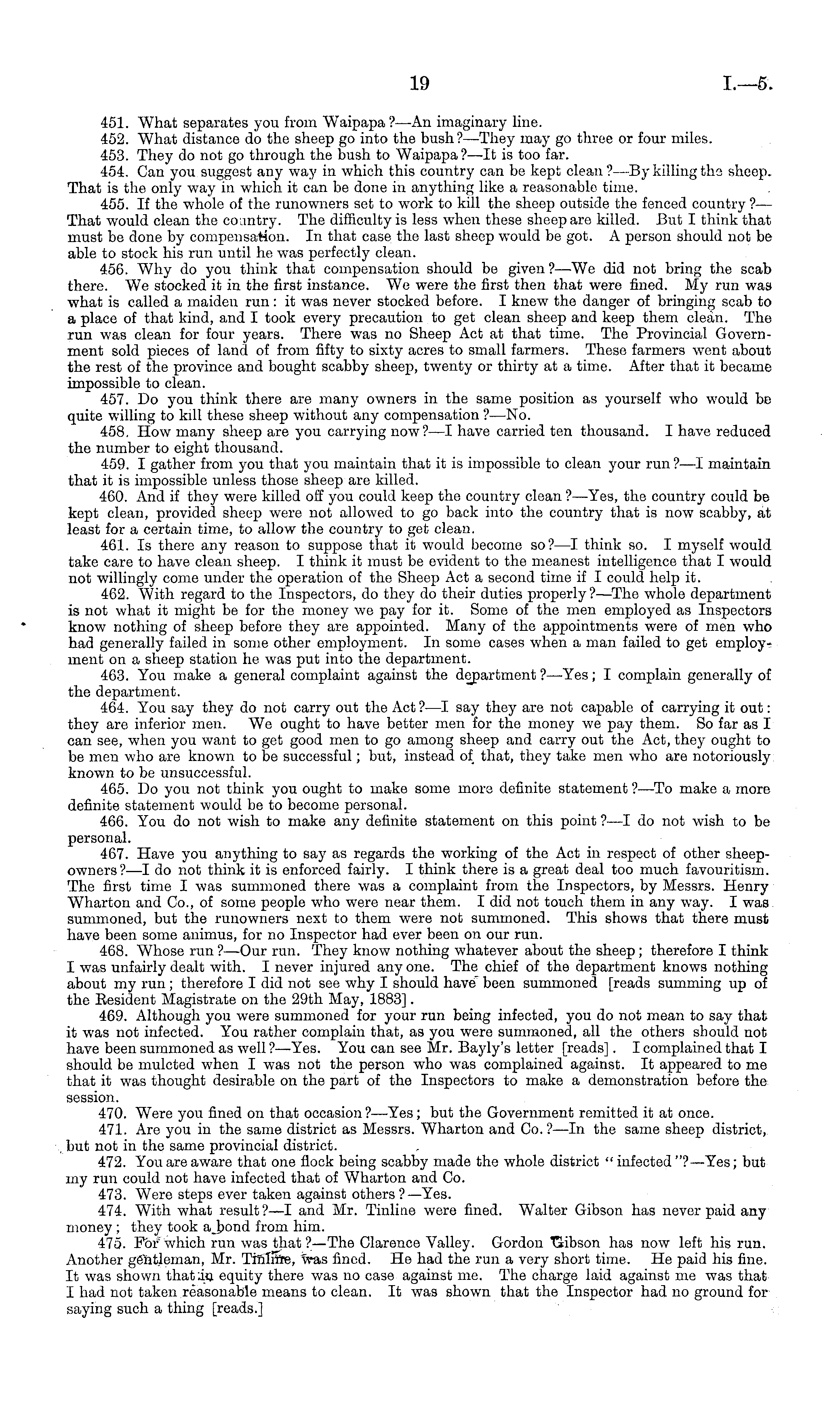 451. What separates you from Waipapa?—An imaginary line. 452. What distance do the sheep go into the bush? —They may go three or four miles. 453. They do not go through the bush to Waipapa ? —lt is too far. 454. Can you suggest any way in which this country can be kept clean ?—By killing the sheep. That is the only way in which it can be done in anything like a reasonable time. 455. If the whole of the runowners set to w-ork to kill the sheep outside the fenced country ?— That would clean the country. The difficulty is less when these sheep are killed. But I think that must be done by compensation. In that case the last sheep would be got. A person should not be able to stock his run until he was perfectly clean. 456. Why do you think that compensation should bo given ? —We did not bring the scab there. We stocked it in the first instance. We were the first then that were fined. My run was what is called a maiden run: it was never stocked before. I knew the danger of bringing scab to a place of that kind, and I took every precaution to get clean sheep and keep them clean. The run was clean for four years. There was no Sheep Act at that time. The Provincial Government sold pieces of land of from fifty to sixty acres to small farmers. These farmers went about the rest of the province and bought scabby sheep, twenty or thirty at a time. After that it became impossible to clean. 457. Do you think there are many owners in the same position as yourself w-ho would be quite willing to kill these sheep without any compensation ?—No. 458. How many sheep are you carrying now?—l have carried ten thousand. I have reduced the number to eight thousand. 459. I gather from you that you maintain that it is impossible to clean your run ?—I maintain that it is impossible unless those sheep are killed. 460. And if they were killed off you could keep the country clean ?—Yes, the country could be kept clean, provided sheep were not allowed to go back into the country that is now scabby, at least for a certain time, to allow the country to get clean. 461. Is there any reason to suppose that it would become so? —I think so. I myself would take care to have clean sheep. I think it must be evident to the meanest intelligence that I would not willingly come under the operation of the Sheep Act a second time if I could help it. 462. With regard to the Inspectors, do they do their duties properly ?—The whole department is not what it might be for the money we pay for it. Some of the men employed as Inspectors know nothing of sheep before they are appointed. Many of the appointments were of men who had generally failed in some other employment. In some cases when a man failed to get employment on a sheep station he was put into the department. 463. You make a general complaint against the department ? —Yes; I complain generally of the department. 464. You say they do not carry out the Act?—l say they are not capable of carrying it out: they are inferior men. We ought to have better men for the money we pay them. So far as I can see, when you want to get good men to go among sheep and carry out the Act, they ought to be men who are known to be successful; but, instead of that, they take men who are notoriouslyknown to be unsuccessful. 465. Do you not think you ought to make some more definite statement ?—To make a more definite statement would be to become personal. 466. You do not wish to make any definite statement on this point ?—I do not wish to be personal. 467. Have you anything to say as regards the working of the Act in respect of other sheepowners? —I do not think it is enforced fairly. I think there is a great deal too much favouritism. The first time I was summoned there was a complaint from the Inspectors, by Messrs. Henry Wharton and Co., of some people who were near them. I did not touch them in any way. I was summoned, but the runowners next to them were not summoned. This shows that there must have been some animus, for no Inspector had ever been on our run. 468. Whose run ?—Our run. They know nothing whatever about the sheep ; therefore I think I was unfairly dealt with. I never injured any one. The chief of the department knows nothing about my run; therefore I did not see why I should have been summoned [reads summing up of the Besident Magistrate on the 29th May, 1883]. 469. Although you were summoned for your run being infected, you do not mean to say that it was not infected. You rather complain that, as you were summoned, all the others should not have been summoned as well ? —Yes. You can see Mr. Bayly's letter [reads]. I complained that I should be mulcted when I was not the person who was complained against. It appeared to me that it was thought desirable on the part of the Inspectors to make a demonstration before the session. 470. Were you fined on that occasion?—-Yes; but the Government remitted it at once. 471. Are you in the same district as Messrs. Wharton and Co. ?—ln the same sheep district, but not in the same provincial district. 472. You are aware that one flock being scabby made the whole district " infected "?— Yes; but my run could not have infected that of Wharton and Co. 473. Were steps ever taken against others ? —Yes. 474. With what result?—l and Mr. Tinliue were fined. Walter Gibson, has never paid any money ; they took a bond from him. 475. For which run was that ?—The Clarence Valley. Gordon Gibson has now left his run. Another gentleman, Mr. Tinline, was fined. He had the run a very short time. He paid his fine. It was shown that in equity there was no case against me. The charge laid against me was that I had not taken reasonable means to clean. It was shown that the Inspector had no ground for saying such a thing [reads.]