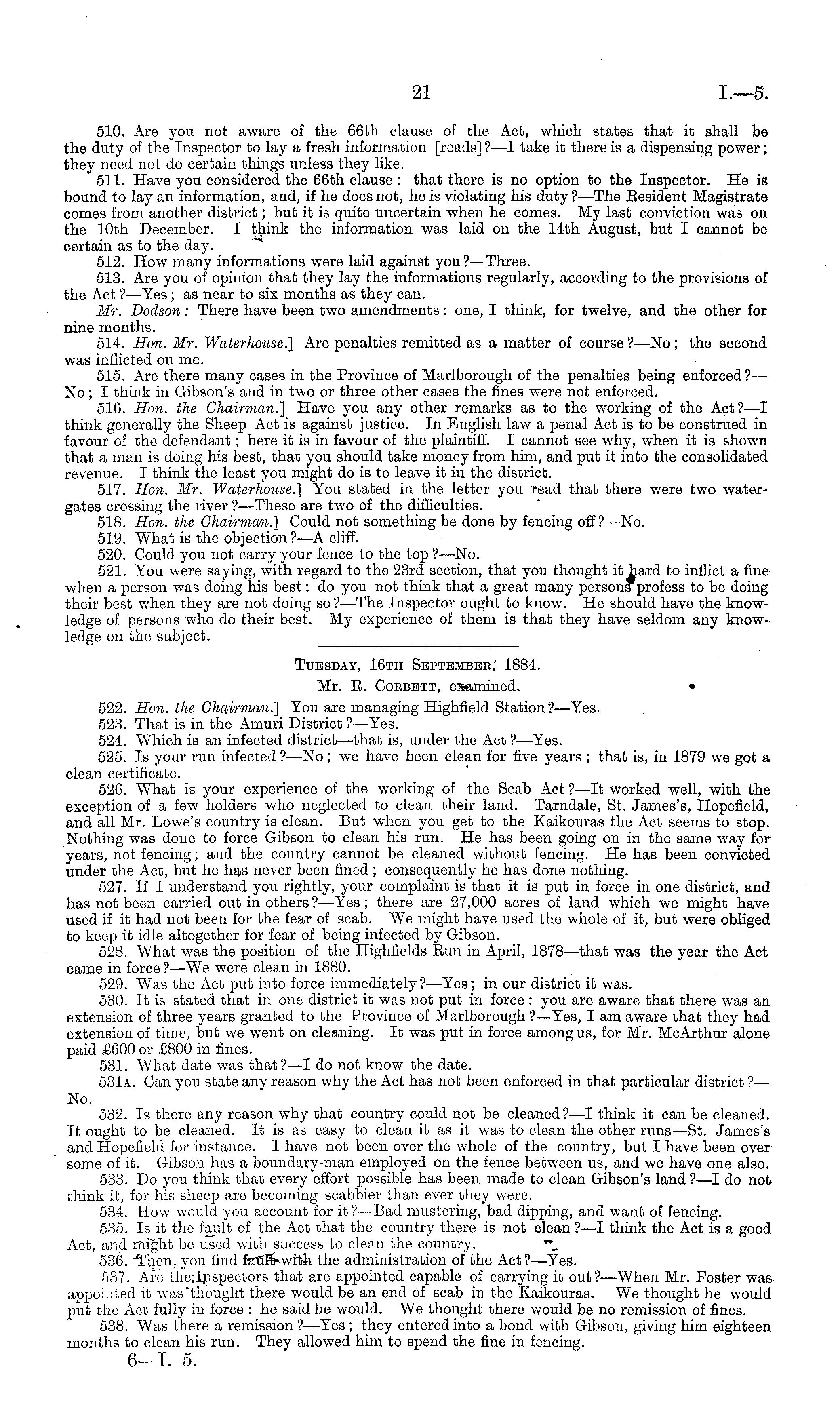 510. Are you not aware of the 66th clause of the Act, which states that it shall be the duty of the Inspector to lay a fresh information [reads] ?—I take it there is a dispensing power; they need not do certain things unless they like. 511. Have you considered the 66th clause : that there is no option to the Inspector. He is bound to lay an information, and, if he does not, he is violating his duty ? —The Besident Magistrate comes from another district; but it is quite uncertain when he comes. My last conviction was on the 10th December. I think the information was laid on the 14th August, but I cannot be certain as to the day. 512. How many informations were laid against you?— Three. 513. Are you of opinion that they lay the informations regularly, according to the provisions of the Act ?—Yes; as near to six months as they can. Mr. Dodson: There have been two amendments: one, I think, for twelve, and the other for nine months. 514. Hon. Mr. Waterhouse.) Are penalties remitted as a matter of course ?—No; the second was inflicted on me. 515. Are there many cases in the Province of Marlborough of the penalties being enforced ? — No; I think in Gibson's and in two or three other cases the fines were not enforced. 516. Hon. the Chairman!) Have you any other remarks as to the w-orking of the Act?—l think generally the Sheep Act is against justice. In English law a penal Act is to be construed in favour of the defendant; here it is in favour of the plaintiff. I cannot see why, when it is shown that a man is doing his best, that you should take money from him, and put it into the consolidated revenue. I think the least you might do is to leave it in the district. 517. Hon. Mr. Waterhouse.) You stated in the letter you read that there were two watergates crossing the river ?—These are two of the difficulties. 518. Hon. the Chairman.) Could not something be done by fencing off?— No. 519. What is the objection ?—A cliff. 520. Could you not carry your fence to the top ? —No. 521. You were saying, with regard to the 23rd section, that you thought it hard to inflict a fine when a person was doing his best: do you not think that a great many persons profess to be doing their best when they are not doing so?— The Inspector ought to know. He should have the knowledge of persons who do their best. My experience of them is that they have seldom any knowledge on the subject.