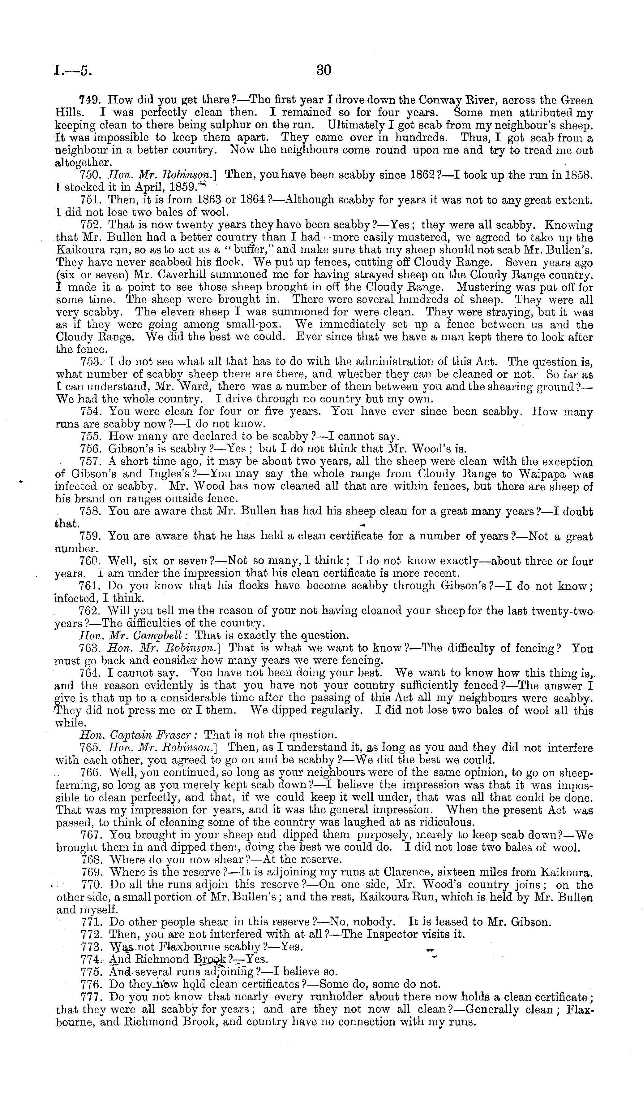 749. How did you get there ? —The first year I drove down the Conway River, across the Green Hills. I was perfectly clean then. I remained so for four years. Some men attributed my keeping clean to there being sulphur on the run. Ultimately I got scab from my neighbour's sheep. It was impossible to keep them apart. They came over in hundreds. Thus, I got scab from a neighbour in a better country. Now the neighbours come round upon me and try to tread me out altogether. 750. Hon. Mr. Robinson.) Then, you have been scabby since 1862 ?—I took up the run in 1858. I stocked it in April, 1859. * 751. Then, it is from 1863 or 1864 ?—Although scabby for years it was not to any great extent. I did not lose two bales of wool. 752. That is now twenty years they have been scabby ?—Yes; they were all scabby. Knowing that Mr. Bullen had a better country than I had —more easily mustered, we agreed to take up the Kaikoura run, so as to act as a " buffer," and make sure that my sheep should not scab Mr. Bullen's. They have never scabbed his flock. We put up fences, cutting off Cloudy Range. Seven years ago (six or seven) Mr. Caverhill summoned me for having strayed sheep on the Cloudy Range country. I made it a point to see those sheep brought in off the Cloudy Range. Mustering was put off for some time. The sheep were brought in. There were several hundreds of sheep. They were all very scabby. The eleven sheep I was summoned for were clean. They were straying, but it was as if they were going among small-pox. We immediately set up a fence between us and the Cloudy Range. We did the best we could. Ever since that we have a man kept there to look after the fence. 753. Ido not see what all that has to do with the administration of this Act. The question is, what number of scabby sheep there are there, and whether they can be cleaned or not. So far as I can understand, Mr. Ward, there was a number of them between you and the shearing ground?— We had the whole country. I drive through no country but my own. 754. You were clean for four or five years. You have ever since been scabby. How many runs are scabby now ?—I do not know. 755. How many are declared to be scabby ? —I cannot say. 756. Gibson's is scabby ?—Yes ; but I do not think that Mr. Wood's is. 757. A short time ago, it may be about two years, all the sheep were clean with the exception of Gibson's and Ingles's ? —You may say the whole range from Cloudy Range to Waipapa was infected or scabby. Mr. Wood has now cleaned all that are within fences, but there are sheep of his brand on ranges outside fence. 758. You are aware that Mr. Bullen has had his sheep clean for a great many years?—l doubt that. 759. You are aware that he has held a clean certificate for a number of years ?—Not a great number. 760. Well, six or seven?— Not so many, I think ; Ido not know exactly—about three or four years. lam under the impression that his clean certificate is more recent. 761. Do you know that his flocks have become scabby through Gibson's?—l do not know; infected, I think. 762. Will you tell me the reason of your not having cleaned your sheep for the last twenty-two years? —The difficulties of the country. Hon. Mr. Campbell: That is exactly the question. 763. Hon. Mr. Robinson.) That is what we want to know?— The difficulty of fencing? You must go back and consider how many years we were fencing. 764. I cannot say. You have not been doing your best. We want to know how this thing is, and the reason evidently is that you have not your country sufficiently fenced ?—The answer I give is that up to a considerable time after the passing of this Act all my neighbours were scabby. They did not press me or I them. We dipped regularly. I did not lose two bales of wool all this while. Hon. Captain Eraser : That is not the question. 765. Hon. Mr. Robinson.) Then, as I understand it, as long as you and they did not interfere with each other, you agreed to go on and be scabby ?—We did the best we could. 766. Well, you continued, so long as your neighbours were of the same opinion, to go on sheepfarming, so long as you merely kept scab down ? —I believe the impression was that it was impossible to clean perfectly, and that, if we could keep it well under, that was all that could be done. That was my impression for years, and it was the general impression. When the present Act was passed, to think of cleaning some of the country was laughed at as ridiculous. 767. You brought in your sheep and dipped them purposely, merely to keep scab down?—We brought them in and dipped them, doing the best we could do. I did not lose two bales of wool. 768. Where do you now shear?—At the reserve. 769. Where is the reserve ? —lt is adjoining my runs at Clarence, sixteen miles from Kaikoura. 770. Do all the runs adjoin this reserve ?—On one side, Mr. Wood's country joins; on the other side, a small portion of Mr. Bullen's ; and the rest, Kaikoura Run, which is held by Mr. Bullen and myself. 771. Do other people shear in this reserve ?—No, nobody. It is leased to Mr. Gibson. 772. Then, you are not interfered with at all ? —The Inspector visits it. 773. Was not Flaxbourne scabby ?—Yes. „ 774. And Bichmond Brook?— Yes. 775. And several runs adjoining ?—I believe so. 776. Do they.now hold clean certificates? —Some do, some do not. 777. Do you not know that nearly every runholder about there now holds a clean certificate; that they were all scabby for years; and are they not now all clean ? —Generally clean ; Flaxbourne, and Bichmond Brook, and country have no connection with my runs.