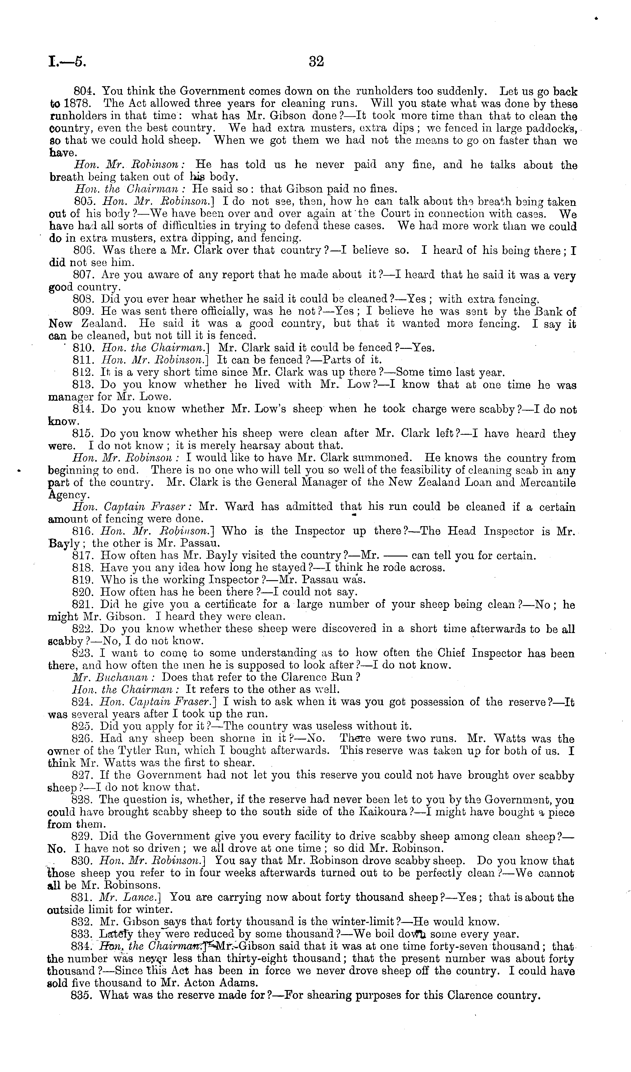 804. You think the Government comes down on the runholders too suddenly. Let us go back to 1878. The Act allowed three years for cleaning runs. Will you state what was done by these runholders in that time : what has Mr. Gibson done ? —lt took more time than that to clean the Country, even the best country. We had extra musters, extra dips ; wo fenced in large paddocks, So that we could hold sheep. When we got them we had not the means to go on faster than we have. Hon. Mr. Robinson: He has told us he never paid any fine, and he talks about the breath being taken out of his body. Hon. the Chairman : He said so : that Gibson paid no fines. 805. Hon. Mr. Robinson.] I do not see, then, how he can talk about the breath being taken out of his body ?—We have been over and over again at the Court in connection with cases. We have had all sorts of difficulties in trying to defend these cases. We had more work than we could do in extra musters, extra dipping, and fencing. 806. Was there a Mr. Clark over that country ? —I believe so. I heard of his being there; I did not see him. 807. Are you aware of any report that he made about it?—l heard that he said it was a very good country. 803. Did you ever hear whether he said it could be cleaned?— Yes ; with extra fencing. 809. He was sent there officially, was he not ?—Yes ; I believe he was sent by the Bank of New Zealand. He said it was a good country, but that it wanted more fencing. I say it can be cleaned, but not till it is fenced. 810. Hon. the Chairman.] Mr. Clark said it could be fenced ?—Yes. 811. Hon. Air. Robinson.) It can be fenced ? —Parts of it. 812. It is a very short time since Mr. Clark was up there ?—Some time last year. 813. Do you know whether he lived with Mr. Low ?—I know that at oue time he was manager for Mr. Lowe. 814. Do you know whether Mr. Low's sheep when ho took charge wore scabby ? —I do not know. 815. Do you know whether his sheep were clean after Mr. Clark left ?—I have heard they were. Ido not know ;it is merely hearsay about that. Hon. Mr. Robinson : I would like to have Mr. Clark summoned. He knows the country from beginning to end. There is no one who will tell you so well of the feasibility of cleaning scab in any part of the counti-y. Mr. Clark is the General Manager of the New Zealand Loan and Mercantile Agency. Hon. Captain Fraser: Mr. Ward has admitted that his run could be cleaned if a certain amount of fencing were done. 816. Hon. Mr. Robinson.) Who is the Inspector up there?— The Head Inspector is Mr. Bayly ; the other is Mr. Passau. 817. How often has Mr. Bayly visited the country? —Mr. can tell you for certain. 818. Have you any idea how long he stayed ? —I think he rode across. 819. Who is the working Inspector ? —Mr. Passau was. 820. How often has he been there ?—I could not say. 821. Did he give you a certificate for a large number of your sheep being clean?—No; he might Mr. Gibson. I heard they were clean. 822. Do you know whether these sheep were discovered in a short time afterwards to be all scabby ?—No, I do not know. 823. I want to come to some understanding as to how often the Chief Inspector has been there, and how often the men he is supposed to look after ?—I do not know. Mr. Buchanan : Does that refer to the Clarence Bun ? Hon. the Chairman : It refers to the other as wall. 824. Hon. Captain Fraser.) I wish to ask when it was you got possession of the reserve?—lt was several years after I took up the run. 825. Did. you apply for it ?—The country was useless without it. 826. Had any sheep been shorne in it ? —No. There were two runs. Mr. Watts was the owner of the Tytler Bun, which I bought afterwards. This reserve was taken up for both of us. I think Mr. Watts was the first to shear. 827. If the Government had not let you this reserve you could not have brought over scabby sheep ? —I do not know that. 828. The question is, whether, if the reserve had never been let to you by the Government, you could have brought scabby sheep to the south side of the Kaikoura ?—I might have bought a piece from them. 829. Did the Government give you every facility to drive scabby sheep among clean sheep?— No. I have not so driven; we all drove at one time ; so did Mr. Robinson. 830. Hon. Mr. Bobinson.) You say that Mr. Robinson drove scabby sheep. Do you know that those sheep you refer to in four weeks afterwards turned out to be perfectly clean ?—We cannot all be Mr. Robinsons. 831. Mr. Lance.) You are carrying now about forty thousand sheep?— Yes; that is about the outside limit for winter. 832. Mr. Gibson says that forty thousand is the winter-limit ?—He would know. 833. Lately they were reduced by some thousand ? —We boil down some every year. 834. Hon. the Chairman.] Mr.-Gibson said that it was at one time forty-seven thousand; that the number was ney^r less than thirty-eight thousand; that the present number was about forty thousand ?—Since this Act has been in force we never drove sheep off the country. I could have sold five thousand to Mr. Acton Adams. 835. What was the reserve made for?— For shearing purposes for this Clarence country.