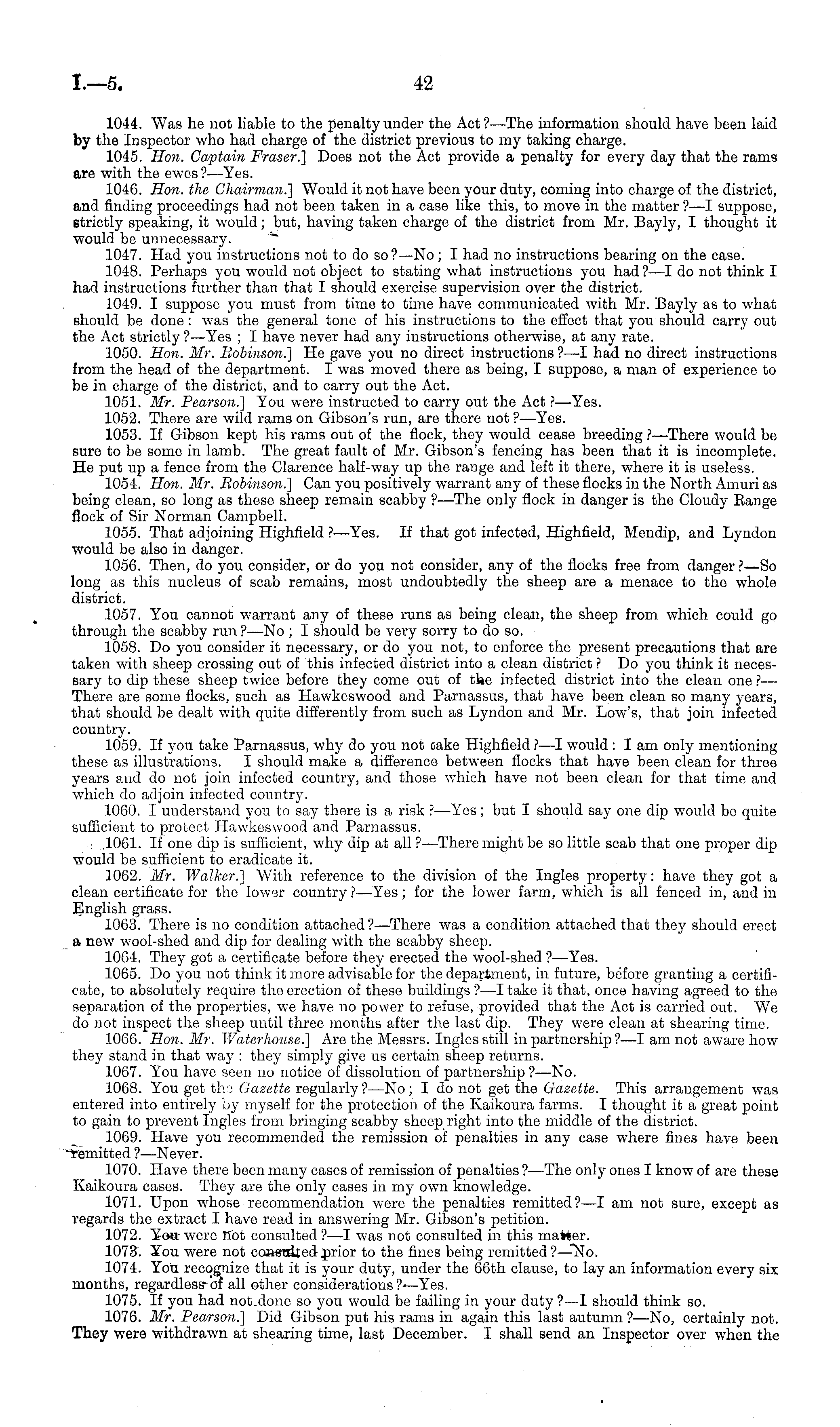 1044. Was he not liable to the penalty under the Act?— The information should have been laid by the Inspector who had charge of the district previous to my taking charge. 1045. Hon. Captain Fraser.) Does not the Act provide a penalty for every day that the rams are with the ewes?-—Yes. 1046. Hon. the Chairman.) Would it not have been your duty, coming into charge of the district, and finding proceedings had not been taken in a case like this, to move in the matter ? —I suppose, strictly speaking, it would; but, having taken charge of the district from Mr. Bayly, I thought it would be unnecessary. 1047. Had you instructions not to do so?—No; I had no instructions bearing on the case. 1048. Perhaps you would not object to stating what instructions you had? —I do not think I had instructions further than that I should exercise supervision over the district. 1049. I suppose you must from time to time have communicated with Mr. Bayly as to what should be done : w-as the general tone of his instructions to the effect that you should carry out the Act strictly?— Yes ; I have never had any instructions otherwise, at any rate. 1050. Hon. Mr. Robinson.) He gave you no direct instructions ?—I had no direct instructions from the head of the department. I was moved there as being, I suppose, a man of experience to be in charge of the district, and to carry out the Act. 1051. Mr. Pearson.) You were instructed to carry out the Act ?—Yes. 1052. There are wild rams on Gibson's run, are there not ?—Yes. 1053. If Gibson kept his rams out of the flock, they would cease breeding ?—There would be sure to be some in lamb. The great fault of Mr. Gibson's fencing has been that it is incomplete. He put up a fence from the Clarence half-way up the range and left it there, where it is useless. 1054. Hon. Mr. Robinson.) Can you positively warrant any of these flocks in the North Amuri as being clean, so long as these sheep remain scabby ? —The only flock in danger is the Cloudy Bange flock of Sir Norman Campbell. 1055. That adjoining Highfield ?—Yes. If that got infected, Highfield, Mendip, and Lyndon would be also in danger. 1056. Then, do you consider, or do you not consider, any of the flocks free from danger ?—So long as this nucleus of scab remains, most undoubtedly the sheep are a menace to the whole district. 1057. You cannot warrant any of these runs as being clean, the sheep from which could go through the scabby run? —No ; I should be very sorry to do so. 1058. Do you consider it necessary, or do you not, to enforce the present precautions that are taken with sheep crossing out of this infected district into a clean district ? Do you think it necessary to dip these sheep twice before they come out of the infected district into the clean one ?— There are some flocks, such as Hawkeswood and Parnassus, that have been clean so many years, that should be dealt with quite differently from such as Lyndon and Mr. Low's, that join infected country. 1059. If you take Parnassus, why do you not cake Highfield ?—I would :I am only mentioning these as illustrations. I should make a difference between flocks that have been clean for three years and do not join infected country, and those which have not been clean for that time and which do adjoin infected country. 1060. I understand you to say there is a risk ?—Yes; but I should say one dip would be quite sufficient to protect Hawkeswood and Parnassus. 1061. If one dip is sufficient, why dip at all ? —There might be so little scab that one proper dip would be sufficient to eradicate it. 1062. Mr. Walker.) With reference to the division of the Ingles property: have they got a clean certificate for the lower country ? —Yes ; for the lower farm, which is all fenced in, and in English grass. 1063. There is no condition attached ?—There was a condition attached that they should erect a new wool-shed and dip for dealing with the scabby sheep. 1064. They got a certificate before they erected the wool-shed ? —Yes. 1065. Do you not think it more advisable for the department, in future, before granting a certificate, to absolutely require the erection of these buildings ?—I take it that, once having agreed to the separation of the properties, we have no power to refuse, provided that the Act is carried out. We do not inspect the sheep until three months after the last dip. They were clean at shearing time. 1066. Hon. Mr. Waterhouse.) Are the Messrs. Ingles still in partnership?—l am not aware how they stand in that way : they simply give us certain sheep returns. 1067. You have seen no notice of dissolution of partnership ? —No. 1068. You get the Gazette regularly ? —No ; I do not get the Gazette. This arrangement was entered into entirely by myself for the protection of the Kaikoura farms. I thought it a great point to gain to prevent Ingles from bringing scabby sheep right into the middle of the district. 1069. Have you recommended the remission of penalties in any case where fines have been remitted ?—Never. 1070. Have there been many cases of remission of penalties ? —The only ones I know of are these Kaikoura cases. They are the only cases in my own knowledge. 1071. Upon whose recommendation were the penalties remitted?—l am not sure, except as regards the extract I have read in answering Mr. Gibson's petition. 1072. You were Hot consulted ?—I was not consulted in this matter. 1073. You were not consulted prior to the fines being remitted? —No. 1074. You recognize that it is your duty, under the 66th clause, to lay an information every six months, regardless of all other considerations ?—Yes. 1075. If you had not.done so you would be failing in your duty ?—1 should think so. 1076. Mr. Pearson.) Did Gibson put his rams in again this last autumn ?—No, certainly not. They w-ere withdrawn at shearing time, last December. I shall send an Inspector over when the