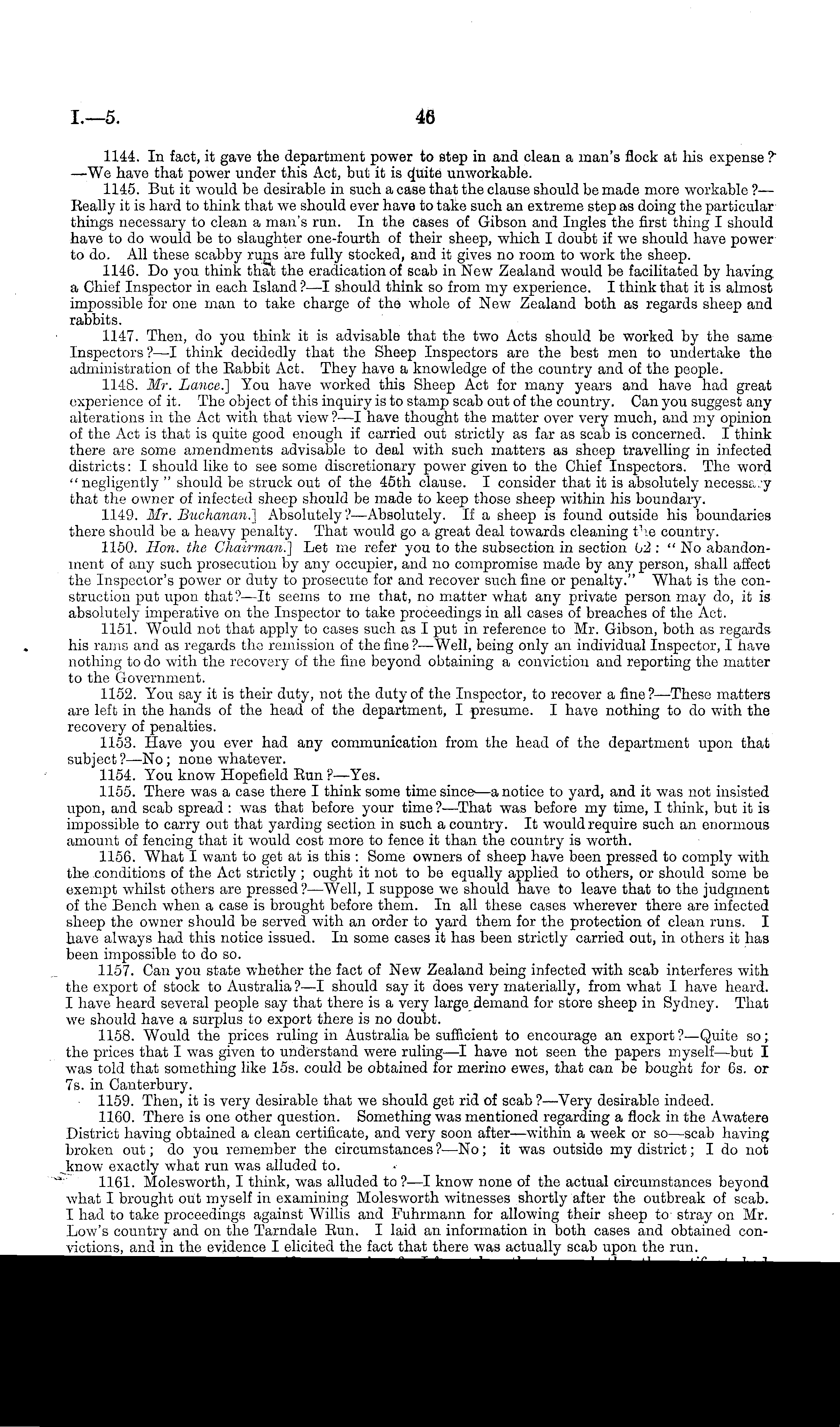 1144. In fact, it gave the department power to step in and clean a man's flock at his expense ? —We have that power under this Act, but it is quite unworkable. 1145. But it would be desirable in such a case that the clause should be made more workable ? — Really it is hard to think that we should ever have to take such an extreme step as doing the particular things necessary to clean a man's run. In the cases of Gibson and Ingles the first thing I should have to do would be to slaughter one-fourth of their sheep, which I doubt if we should have power to do. All these scabby runs are fully stocked, and it gives no room to work the sheep. 1146. Do you think that the eradication of scab in New Zealand would be facilitated by having a Chief Inspector in each Island?—l should think so from my experience. I think that it is almost impossible for one man to take charge of the whole of New Zealand both as regards sheep and rabbits. 1147. Then, do you think it is advisable that the two Acts should be worked by the same Inspectors ? —I think decidedly that the Sheep Inspectors are the best men to undertake the administration of the Eabbit Act. They have a knowledge of the country and of the people. 1148. Mr. Lance.] You have worked this Sheep Act for many years and have had great experience of it. The object of this inquiry is to stamp scab out of the country. Can you suggest any alterations in the Act with that view ?—I have thought the matter over very much, and my opinion of the Act is that is quite good enough if carried out strictly as far as scab is concerned. I think there are some amendments advisable to deal with such matters as sheep travelling in infected districts: I should like to see some discretionary power given to the Chief Inspectors. The word "negligently " should be struck out of the 45th clause. I consider that it is absolutely necessa,y that the owner of infected sheep should be made to keep those sheep within his boundary. 1149. Mr. Buchanan.} Absolutely? —Absolutely. If a sheep is found outside his boundaries there should be a heavy penalty. That would go a great deal towards cleaning the country. 1150. Hon. the Chairman.] Let me refer you to the subsection in section b'2 :" No abandonment of any such prosecution by any occupier, and no compromise made by any person, shall affect the Inspector's power or duty to prosecute for and recover such fine or penalty." What is the construction put upon that?—lt seems to me that, no matter what any private person may do, it is absolutely imperative on the Inspector to take proceedings in all cases of breaches of the Act. 1151. Would not that apply to cases such as I put in reference to Mr. Gibson, both as regards his rains and as regards tho remission of the fine? —Well, being only an individual Inspector, I have nothing to do with the recovery of the fine beyond obtaining a conviction and reporting the matter to the Government. 1152. You say it is their duty, not the duty of the Inspector, to recover a fine?—These matters are left in the hands of the head of the department, I presume. I have nothing to do with the recovery of penalties. 1153. Have you ever had any communication from the head of the department upon that subject ? —No ; none whatever. 1154. You know Hopefield Eun ? —Yes. 1155. There was a case there I think some time since—a notice to yard, and it was not insisted upon, and scab spread : was that before your time ?—That was before my time, I think, but it is impossible to carry out that yarding section in such a country. It would require such an enormous amount of fencing that it would cost more to fence it than the country is worth. 1156. What I want to get at is this : Some owners of sheep have been pressed to comply with the conditions of the Act strictly ; ought it not to be equally applied to others, or should some be exempt whilst others are pressed ? —Well, I suppose we should have to leave that to the judgment of the Bench when a case is brought before them. In all these cases wherever there are infected sheep the owner should be served with an order to yard them for the protection of clean runs. I have always had this notice issued. In some cases it has been strictly carried out, in others it has been impossible to do so. 1157. Can you state whether the fact of New Zealand being infected with scab interferes with the export of stock to Australia?—l should say it does very materially, from what I have heard. I have heard several people say that there is a very large demand for store sheep in Sydney. That we should have a surplus to export there is no doubt. 1158. Would the prices ruling in Australia be sufficient to encourage an export?—Quite so; the prices that I was given to understand were ruling—l have not seen the papers myself—but I was told that something like 15s. could be obtained for merino ewes, that can be bought for 6s. or 7s. in Canterbury. 1159. Then, it is very desirable that we should get rid of scab ?—Very desirable indeed. 1160. There is one other question. Something was mentioned regarding a flock in the Awatere District having obtained a clean certificate, and very soon after —within a week or so—scab having broken out; do you remember the circumstances ?—No; it was outside my district; Ido not know exactly what run was alluded to. 1161. Molesworth, I think, was alluded to ? —I know none of the actual circumstances beyond what I brought out myself in examining Molesworth witnesses shortly after the outbreak of scab. I had to take proceedings against Willis and Fuhrmann for allowing their sheep to stray on Mr. Low's country and on the Tarndale Eun. I laid an information in both cases and obtained convictions, and in the evidence I elicited the fact that there was actually scab upon the run. 1162. At the time the certificate was given ? —I forget how that \y*is, whether the certificate had been withdrawn or not. I think they had lost their cert