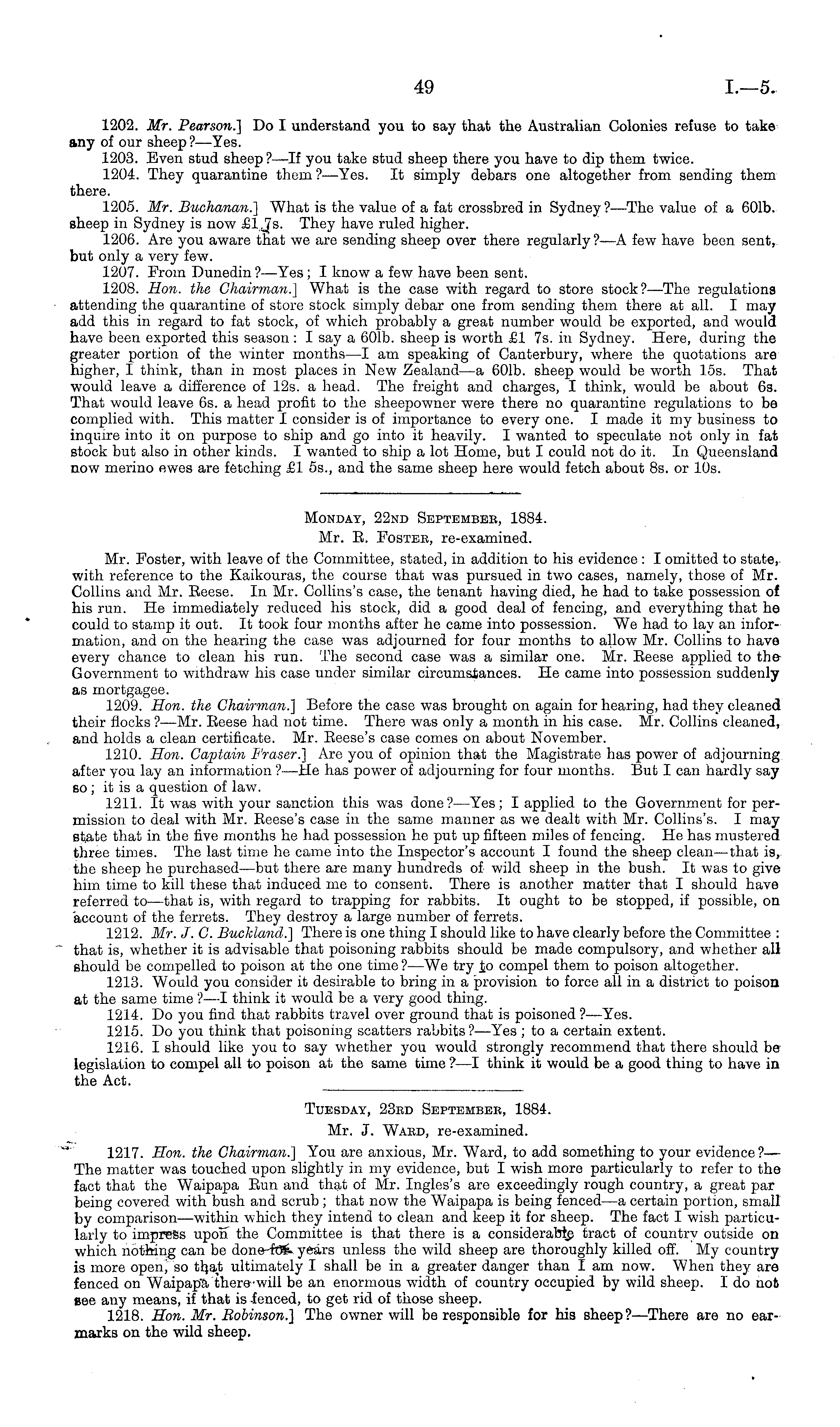 Monday, 22nd September, 1884. Mr. B. Foster, re-examined. Mr. Foster, with leave of the Committee, stated, in addition to his evidence : I omitted to state, with reference to the Kaikouras, the course that was pursued in two cases, namely, those of Mr. Collins and Mr. Beese. In Mr. Collins's case, the tenant having died, he had to take possession of his run. He immediately reduced his stock, did a good deal of fencing, and everything that he could to stamp it out. It took four months after he came into possession. We had to lay an information, and on the hearing the case was adjourned for four months to allow Mr. Collins to have every chance to clean his run. The second case was a similar one. Mr. Beese applied to the Government to withdraw his case under similar circumstances. He came into possession suddenly as mortgagee. 1209. Hon. the Chairman.) Before the case was brought on again for hearing, had they cleaned their flocks ?—Mr. Beese had not time. There was only a month in his case. Mr. Collins cleaned, and holds a clean certificate. Mr. Beese's case comes on about November. 1210. Hon. Captain Fraser.) Are you of opinion that the Magistrate has power of adjourning after \*ou lay an information ?—He has power of adjourning for four months. But I can hardly say so; it is a question of law. 1211. It was with your sanction this was done?— Yes; I applied to the Government for permission to deal with Mr. Beese's case in the same maimer as we dealt with Mr. Collins's. I may state that in the five months he had possession he put up fifteen miles of fencing. He has mustered three times. The last time he came into the Inspector's account I found the sheep clean—that is,, the sheep he purchased —but there are many hundreds of wild sheep in the bush. It was to give him time to kill these that induced me to consent. There is another matter that I should have referred to—that is, with regard to trapping for rabbits. It ought to be stopped, if possible, on account of the ferrets. They destroy a large number of ferrets. 1212. Mr. J. C. Buckland.) There is one thing I should like to have clearly before the Committee : that is, whether it is advisable that poisoning rabbits should be made compulsory, and whether all should be compelled to poison at the one time ?—We try to compel them to poison altogether. 1213. Would you consider it desirable to bring in a provision to force all in a district to poison at the same time ?—I think it would be a very good thing. 1214. Do you find that rabbits travel over ground that is poisoned ?—Yes. 1215. Do you think that poisoning scatters rabbits ?—Yes ; to a certain extent. 1216. I should like you to say whether you would strongly recommend that there should be legislation to compel all to poison at the same time ? —I think it would be a good thing to have in the Act.
