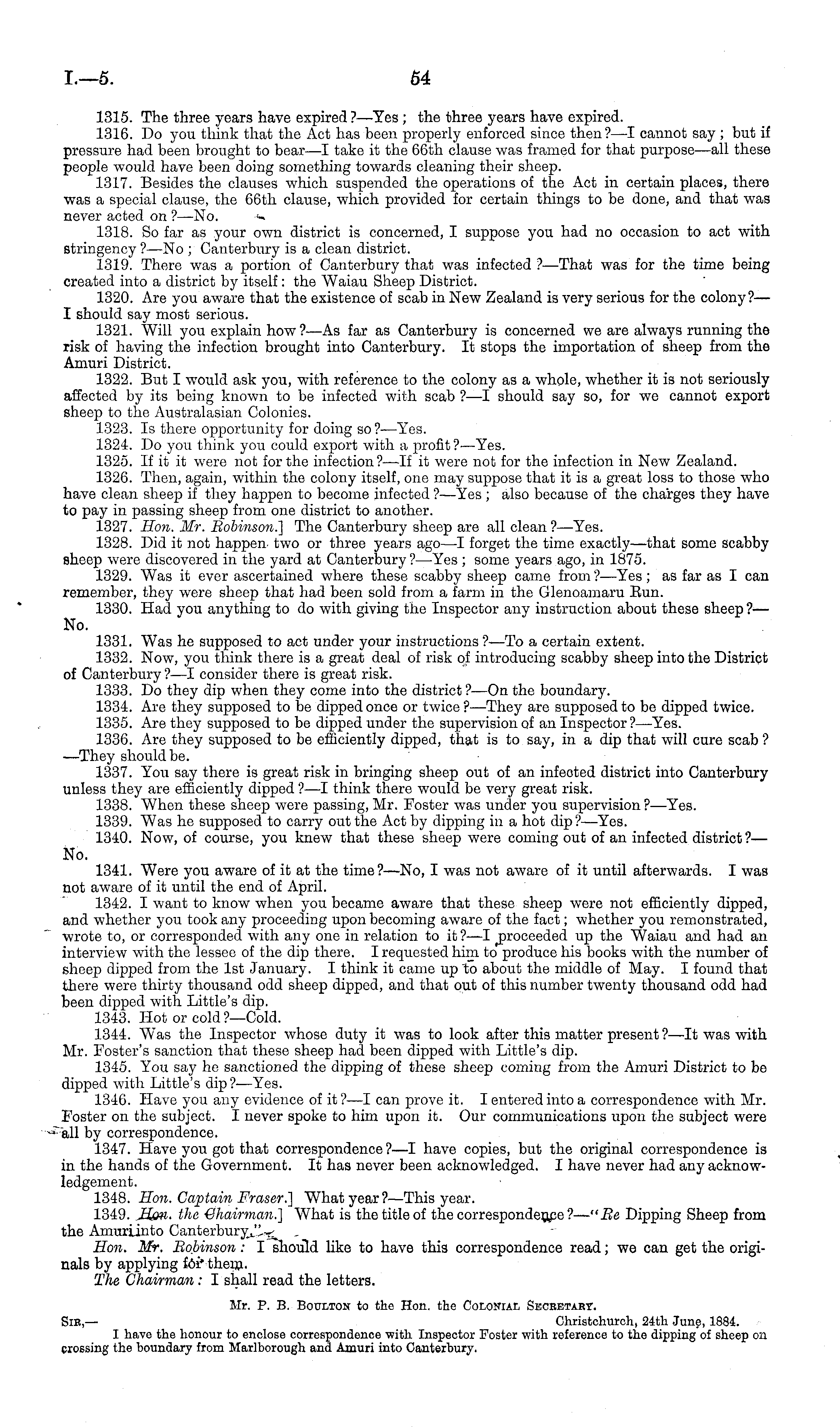 1315. The three years have expired ?—Yes ; the three years have expired. 1316. Do you think that the Act has been properly enforced since then?—l cannot say ; but if pressure had been brought to bear—l take it the 66th clause was framed for that purpose—all these people would have been doing something towards cleaning their sheep. 1317. Besides the clauses which suspended the operations of the Act in certain places, there was a special clause, the 66th clause, which provided for certain things to be done, and that was never acted on ? —No. 1318. So far as your own district is concerned, I suppose you had no occasion to act with stringency ?—No ; Canterbury is a clean district. 1319. There was a portion of Canterbury that was infected ? —That was for the time being created into a district by itself: the Waiau Sheep District. 1320. Are you aware that the existence of scab in New Zealand is very serious for the colony?— I should say most serious. 1321. Will you explain how?—As far as Canterbury is concerned we are always running the risk of having the infection brought into Canterbury. It stops the importation of sheep from the Amuri District. 1322. But I would ask you, with reference to the colony as a whole, whether it is not seriously affected by its being known to be infected with scab ? —I should say so, for we cannot export sheep to the Australasian Colonies. 1323. Is there opportunity for doing so ?—Yes. 1324. Do you think you could export with a profit ?—Yes. 1325. If it it were not for the infection?—lf it were not for the infection in New Zealand. 1326. Then, again, within the colony itself, one may suppose that it is a great loss to those who have clean sheep if they happen to become infected ?—Yes ; also because of the charges they have to pay in passing sheep from one district to another. 1327. Hon. Mr. Bobinson.) The Canterbury sheep are all clean ?—Yes. 1328. Did it not happen- two or three years ago—l forget the time exactly—that some scabby sheep wore discovered in the yard at Canterbury ?—Yes ; some years ago, in 1875. 1329. Was it ever ascertained where these scabby sheep came from ?—Yes ; as far as I can remember, they were sheep that had been sold from a farm in the Glenoamaru Bun. 1330. Had you anything to do with giving tlie Inspector any instruction about these sheep ?— No. 1331. Was he supposed to act under your instructions ?—To a certain extent. 1332. Now, you think there is a great deal of risk of introducing scabby sheep into the District of Canterbury?—l consider there is great risk. 1333. Do they dip when they come into the district ?—On the boundary. 1334. Are they supposed to be dipped once or twice?— They are supposed to be dipped twice. 1335. Are they supposed to be dipped under the supervision of an Inspector? —Yes. 1336. Are they supposed to be efficiently dipped, that is to say, in a dip that will cure scab ? —They should be. 1337. You say there is great risk in bringing sheep out of an infected district into Canterbury unless they are efficiently dipped ?—I think there would be very great risk. 1338. When these sheep were passing, Mr. Foster was under you supervision ? —Yes. 1339. Was he supposed to carry out the Act by dipping in a hot dip ?—Yes. 1340. Now, of course, you knew that these sheep were coming out of an infected district ?— No. 1341. Were you aware of it at the time?—No, I was not aware of it until afterwards. I was not aware of it until the end of April. 1342. I want to know when you became aware that these sheep were not efficiently dipped, and whether you took any proceeding upon becoming aware of the fact; whether you remonstrated, wrote to, or corresponded with any one in relation to it ?—I proceeded up the Waiau and had an interview with the lessee of the dip there. I requested him to produce his books with the number of sheep dipped from the Ist January. I think it came up to about the middle of May. I found that there were thirty thousand odd sheep dipped, and that out of this number twenty thousand odd had been dipped with Little's dip. 1343. Hot or cold?— Cold. 1344. Was the Inspector whose duty it was to look after this matter present ?—lt was with Mr. Foster's sanction that these sheep had been dipped with Little's dip. 1345. You say he sanctioned the dipping of these sheep coming from the Amuri District to be dipped with Little's dip?— Yes. 1346. Have you any evidence of it?—l can prove it. I entered into a correspondence with Mr. Foster on the subject. I never spoke to him upon it. Our communications upon the subject were all by correspondence. 1347. Have you got that correspondence ?—I have copies, but the original correspondence is in the hands of the Government. It has never been acknowledged. I have never had any acknowledgement. 1348. Hon. Captain Eraser.] What year?— This year. 1349. Hon. the Chairman.) What is the title of the correspondence ?— "Be Dipping Sheep from the Amuriinto Canterbury,".-- ,- Hon. Mr. Bobinson: I should like to have this correspondence read; we can get the originals by applying for themThe Chairman : I shall read the letters. Mr. P. B. Boolton to the Hon. the Colonial Secretary. Sir,— Christchurch, 24th June, 1884. I have the honour to enclose correspondence with Inspector Foster with reference to the dipping of sheep on crossing the boundary from Marlborough and Amuri into Canterbury.