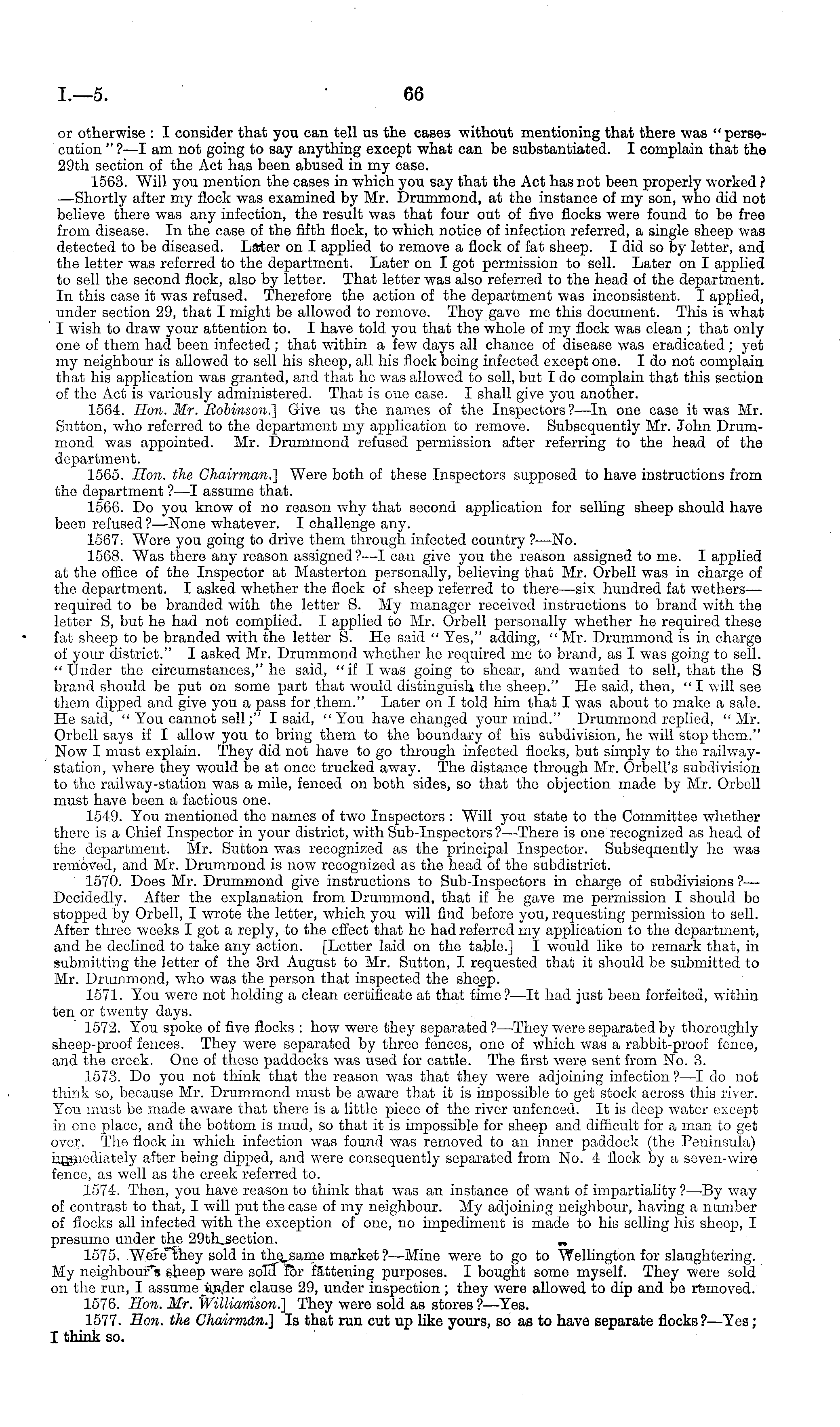 or otherwise : I consider that you can tell us the cases without mentioning that there was " persecution " ?—I am not going to say anything except what can be substantiated. I complain that the 29th section of the Act has been abused in my case. 1563. Will you mention the cases in which you say that the Act has not been properly worked ? —Shortly after my flock was examined by Mr. Drummond, at the instance of my son, who did not believe there was any infection, the result was that four out of five flocks were found to be free from disease. In the case of the fifth flock, to which notice of infection referred, a single sheep was detected to be diseased. Later on I applied to remove a flock of fat sheep. I did so by letter, and the letter was referred to the department. Later on I got permission to sell. Later on I applied to sell the second flock, also by letter. That letter was also referred to the head of the department. In this case it was refused. Therefore the action of the department was inconsistent. I applied, under section 29, that I might be allowed to remove. They gave me this document. This is what I wish to draw your attention to. I have told you that the whole of my flock was clean ; that only one of them had been infected ; that within a few days all chance of disease was eradicated ; yet my neighbour is allowed to sell his sheep, all his flock being infected except one. Ido not complain that his application was granted, and that he was allowed to sell, but I do complain that this section of the Act is variously administered. That is one case. I shall give you another. 1564. Hon. Mr. Robinson.) Give us the names of the Inspectors?—ln one case it was Mr. Sutton, who referred to the department my application to remove. Subsequently Mr. John Drummond was appointed. Mr. Drummond refused permission after referring to the head of the department. 1565. Hon. the Chairman.] Were both of these Inspectors supposed to have instructions from the department ?—I assume that. 1566. Do you know of no reason why that second application for selling sheep should have been refused ?—None whatever. I challenge any. 1567. Were you going to drive them through infected country ?—No. 1568. Was there any reason assigned?—l can give you the reason assigned to me. I applied at the office of the Inspector at Masterton personally, believing that Mr. Orbell was in charge of the department. I asked whether the flock of sheep referred to there—six hundred fat wethers— required to be branded with the letter S. My manager received instructions to brand with the letter S, but he had not complied. I applied to Mr. Orbell personally whether he required these fat sheep to be branded with the letter S. He said " Yes," adding, " Mr. Drummond is in charge of your district." I asked Mr. Drummond whether he required me to brand, as I was going to sell. "Under the circumstances," he said, "if I was going to shear, and wanted to sell, that the S brand should be put on some part that would distinguish the sheep." He said, then, "I will see them dipped and give you a pass for them." Later on I told him that I was about to make a sale. He said, " You cannot sell;" I said, "You have changed your mind." Drummond replied, "Mr. Orbell says if I allow you to bring them to the boundary of his subdivision, he will stop them." Now I must explain. They did not have to go through infected flocks, but simply to the railwaystation, where they would be at once trucked away. The distance through Mr. Orbell's subdivision to the railway-station was a mile, fenced on both sides, so that the objection made by Mr. Orbell must have been a factious one. 1549. You mentioned the names of two Inspectors : Will you state to the Committee whether there is a Chief Inspector in your district, with Sub-Inspectors ?—There is one recognized as head of the department. Mr. Sutton was recognized as the principal Inspector. Subsequently he was removed, and Mr. Drummond is now recognized as the head of the subdistrict. 1570. Does Mr. Drummond give instructions to Sub-Inspectors in charge of subdivisions ?— Decidedly. After the explanation from Drummond, that if he gave me permission I should be stopped by Orbell, I wrote the letter, which you will find before you, requesting permission to sell. After three weeks I got a reply, to the effect that he had referred my application to the department, and he declined to take any action. [Letter laid on the table.] I would like to remark that, in submitting the letter of the 3rd August to Mr. Sutton, I requested that it should be submitted to Mr. Drummond, who was the person that inspected the sheep. 1571. You were not holding a clean certificate at that time?—lt had just been forfeited, within ten or twenty days. 1572. You spoke of five flocks : how were they separated?— They were separated by thoroughly sheep-proof fences. They were separated by three fences, one of which was a rabbit-proof fence, and the creek. One of these paddocks was used for cattle. The first were sent from No. 3. 1573. Do you not think that the reason was that they were adjoining infection ? —I do not think so, because Mr. Drummond must be aware that it is impossible to get stock across this river. You must be made aware that there is a little piece of the river unfenced. It is deep water except in one place, and the bottom is mud, so that it is impossible for sheep and difficult for a man to get over. Tho flock in which infection was found was removed to an inner paddock (the Peninsula) "on^iediately after being dipped, and were consequently separated from No. 4 flock by a seven-wire fence, as well as the creek referred to. ,1574. Then, you have reason to think that was an instance of want of impartiality ?—By way of contrast to that, I will put the ease of my neighbour. My adjoining neighbour, having a number of flocks all infected with the exception of one, no impediment is made to his selling his sheep, I pr
