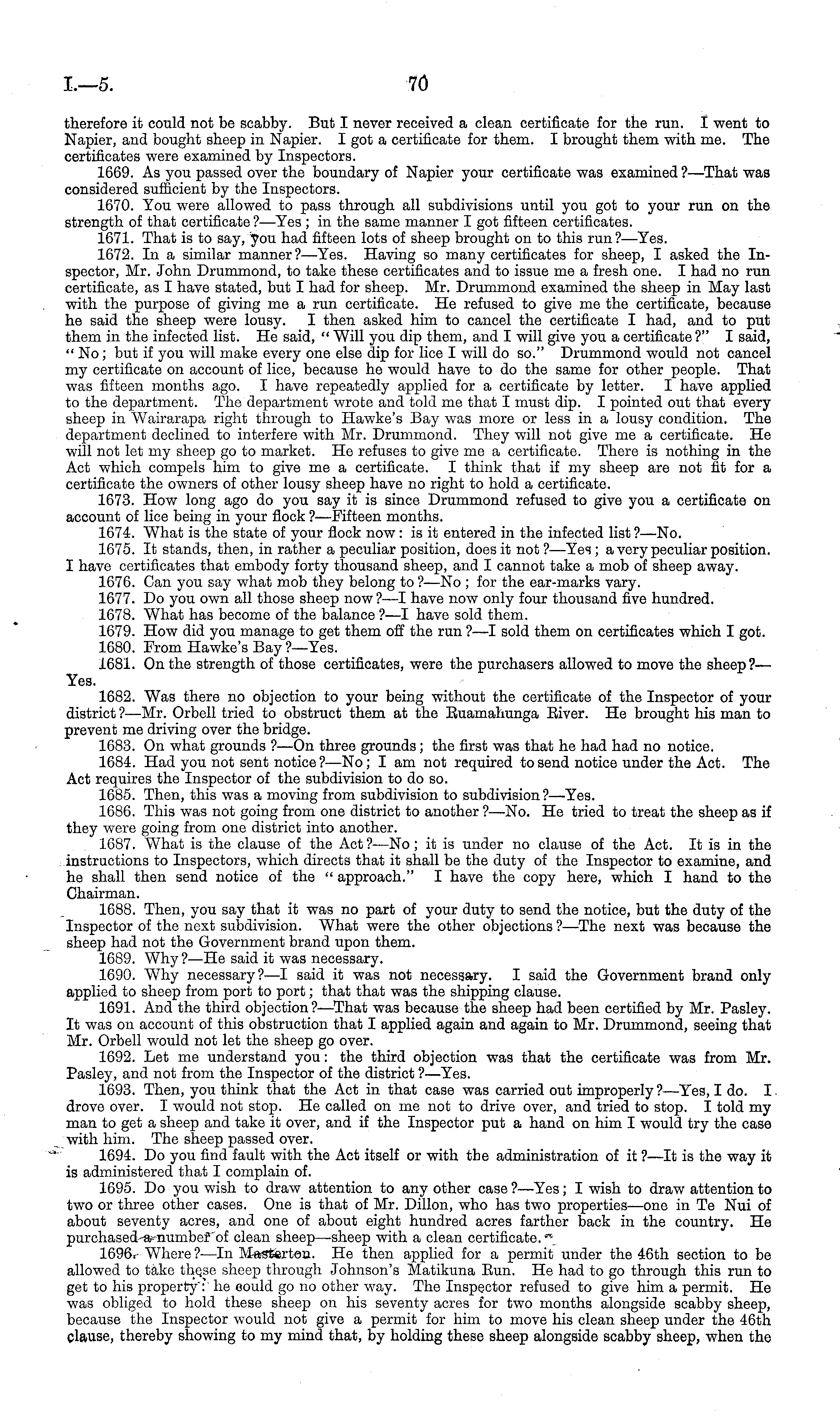 therefore it could not be scabby. But I never received a clean certificate for the run. I went to Napier, and bought sheep in Napier. I got a certificate for them. I brought them with me. The certificates were examined by Inspectors. 1669. As you passed over the boundary of Napier your certificate was examined ? —That was considered sufficient by the Inspectors. 1670. You were allowed to pass through all subdivisions until you got to your run on the strength of that certificate ?—Yes ; in the same manner I got fifteen certificates. 1671. That is to say, you had fifteen lots of sheep brought on to this run?— Yes. 1672. In a similar manner?— Yes. Having so many certificates for sheep, I asked the Inspector, Mr. John Drummond, to take these certificates and to issue me a fresh one. I had no run certificate, as I have stated, but I had for sheep. Mr. Drummond examined the sheep in May last with the purpose of giving me a run certificate. He refused to give me the certificate, because he said the sheep were lousy. I then asked him to cancel the certificate I had, and to put them in the infected list. He said, " Will you dip them, and I will give you a certificate?" I said, " No; but if you will make every one else dip for lice I will do so." Drummond would not cancel my certificate on account of lice, because he would have to do the same for other people. That was fifteen months ago. I have repeatedly applied for a certificate by letter. I have applied to the department. The department wrote and told me that I must dip. I pointed out that every sheep in Wairarapa right through to Hawke's Bay was more or less in a lousy condition. The department declined to interfere with Mr. Drummond. They will not give me a certificate. He will not let my sheep go to market. He refuses to give me a certificate. There is nothing in the Act which compels him to give me a certificate. I think that if my sheep are not fit for a certificate the owners of other lousy sheep have no right to hold a certificate. 1673. How long ago do you say it is since Drummond refused to give you a certificate on account of lice being in your flock ?—Fifteen months. 1674. What is the state of your flock now: is it entered in the infected list ?—-No. 1675. It stands, then, in rather a peculiar position, does it not ? —Yes ; a very peculiar position. I have certificates that embody forty thousand sheep, and I cannot take a mob of sheep away. 1676. Can you say what mob they belong to ?—No ; for the ear-marks vary. 1677. Do you own all those sheep now ?—I have now only four thousand five hundred. 1678. What has become of the balance ?—I have sold them. 1679. How did you manage to get them off the run ? —I sold them on certificates which I got. 1680. From Hawke's Bay ?—Yes. 1681. On the strength of those certificates, were the purchasers allowed to move the sheep?— Yes. 1682. Was there no objection to your being without the certificate of the Inspector of your district ? —Mr. Orbell tried to obstruct them at the Buamahunga Biver. He brought his man to prevent me driving over the bridge. 1683. On what grounds ?—On three grounds; the first was that he had had no notice. 1684. Had you not sent notice?—No; I am not required to send notice under the Act. The Act requires the Inspector of the subdivision to do so. 1685. Then, this was a moving from subdivision to subdivision?— Yes. 1686. This was not going from one district to another ? —No. He tried to treat the sheep as if they were going from one district into another. 1687. What is the clause of the Act?—No; it is under no clause of the Act. It is in the instructions to Inspectors, which directs that it shall be the duty of the Inspector to examine, and he shall then send notice of the " approach." I have the copy here, which I hand to the Chairman. 1688. Then, you say that it was no part of your duty to send the notice, but the duty of the Inspector of the next subdivision. What were the other objections ?—The next was because the sheep had not the Government brand upon them. 1689. Why ? —He said it was necessary. 1690. Why necessary?—l said it was not necessary. I said the Government brand only applied to sheep from port to port; that that was the shipping clause. 1691. And the third objection?— That was because the sheep had been certified by Mr. Pasley. It was on account of this obstruction that I applied again and again to Mr. Drummond, seeing that Mr. Orbell would not let the sheep go over. 1692. Let me understand you: the third objection was that the certificate was from Mr. Pasley, and not from the Inspector of the district ?—Yes. 1693. Then, you think that the Act in that case was carried out improperly ?—Yes, I do. I drove over. I would not stop. He called on me not to drive over, and tried to stop. I told my man to get a sheep and take it over, and if the Inspector put a hand on him I would try the case with him. The sheep passed over. 1694. Do you find fault with the Act itself or with the administration of it ? —lt is the way it is administered that I complain of. 1695. Do you wish to draw attention to any other case ? —Yes; I wish to draw attention to two or three other cases. One is that of Mr. Dillon, who has two properties—one in Te Nui of about seventy acres, and one of about eight hundred acres farther back in the country. He purchased a number of clean sheep—sheep with a clean certificate. 1696. Where ?—ln Masterton. He then applied for a permit under the 46th section to be allowed to take these sheep through Johnson's Matikuna Bun. He had to go through this run to get to his property' : he could go no other way. The Inspector refused to give him a permit. He was obliged to hold these sheep on his seventy acres for two months alongside scabby sheep, because the Inspector would not give a permit for him to move his clean sheep under the 46th clause, thereby showing to my mind that, by holding these sheep alongs