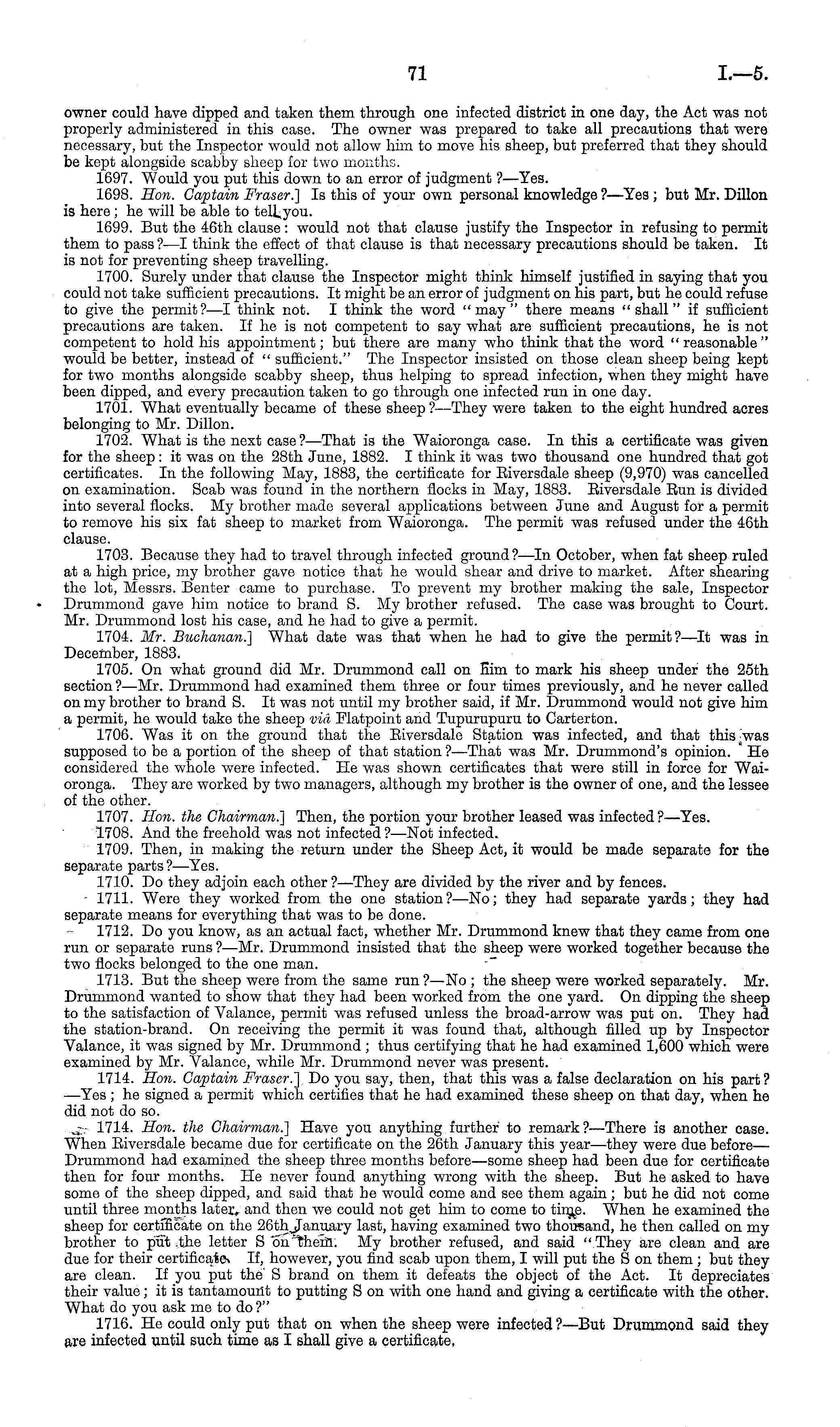 owner could have dipped and taken them through one infected district in one day, the Act was not properly administered in this case. The owner was prepared to take all precautions that were necessary, but the Inspector w-ould not allow him to move his sheep, but preferred that they should be kept alongside scabby sheep for two months. 1697. Would you put this down to an error of judgment ?—Yes. 1698. Hon. Captain Fraser.) Is this of your own personal knowledge ?—Yes ; but Mr. Dillon is here; he will be able to tell you. 1699. But the 46th clause: would not that clause justify the Inspector in refusing to permit them to pass?—l think the effect of that clause is that necessary precautions should be taken. It is not for preventing sheep travelling. 1700. Surely under that clause the Inspector might think himself justified in saying that you could not take sufficient precautions. It might be an error of judgment on his part, but he could refuse to give the permit?—l think not. I think the word "may" there means "shall" if sufficient precautions are taken. If he is not competent to say what are sufficient precautions, he is not competent to hold his appointment; but there are many who think that the word "reasonable" would be better, instead of " sufficient." The Inspector insisted on those clean sheep being kept for two months alongside scabby sheep, thus helping to spread infection, when they might have been dipped, and every precaution taken to go through one infected run in one day. 1701. What eventually became of these sheep ?—They were taken to the eight hundred acres belonging to Mr. Dillon. 1702. What is the next case ?—That is the Waioronga case. In this a certificate was given for the sheep :it was on the 28th June, 1882. I think it was two thousand one hundred that got certificates. In the following May, 1883, the certificate for Biversdale sheep (9,970) was cancelled on examination. Scab was found in the northern flocks in May, 1883. Biversdale Bun is divided into several flocks. My brother made several applications between June and August for a permit to remove his six fat sheep to market from Waioronga. The permit was refused under the 46th clause. 1703. Because they had to travel through infected ground?—ln October, when fat sheep ruled at a high price, my brother gave notice that he would shear and drive to market. After shearing the lot, Messrs. Benter came to purchase. To prevent my brother making the sale, Inspector Drummond gave him notice to brand S. My brother refused. The case was brought to Court. Mr. Drummond lost his case, and he had to give a permit. 1704. Mr. Buchanan.) What date was that when he had to give the permit?—lt was in December, 1883. 1705. On what ground did Mr. Drummond call on him to mark his sheep under the 25th section ?—Mr. Drummond had examined them three or four times previously, and he never called on my brother to brand S. It was not until my brother said, if Mr. Drummond would not give him a permit, he would take the sheep via Flatpoint and Tupurupuru to Carterton. 1706. Was it on the ground that the Biversdale Station was infected, and that this-was supposed to be a portion of the sheep of that station ?—That was Mr. Drummond's opinion. He considered the whole were infected. He was shown certificates that were still in force for Waioronga. They are worked by two managers, although my brother is the owner of one, and the lessee of the other. 1707. Hon. the Chairman.) Then, the portion your brother leased was infected?— Yes. 1708. And the freehold was not infected ? —Not infected. 1709. Then, in making the return under the Sheep Act, it would be made separate for the separate parts?— Yes. 1710. Do they adjoin each other ? —They are divided by the river and by fences. 1711. Were they worked from the one station? —No; they had separate yards; they had separate means for everything that was to be done. 1712. Do you know, as an actual fact, whether Mr. Drummond knew that they came from one run or separate runs ?—Mr. Drummond insisted that the sheep were worked together because the two flocks belonged to the one man. 1713. But the sheep were from the same run ? —No ; the sheep were worked separately. Mr. Drummond w-anted to show that they had been worked from the one yard. On dipping the sheep to the satisfaction of Valance, permit was refused unless the broad-arrow was put on. They had the station-brand. On receiving the permit it was found that, although filled up by Inspector Valance, it was signed by Mr. Drummond ; thus certifying that he had examined 1,600 which were examined by Mr. Valance, while Mr. Drummond never was present. 1714. Hon. Captain Fraser.) Do you say, then, that this was a false declaration on his part ? —Yes ;he signed a permit which certifies that he had examined these sheep on that day, when he did not do so. 1714. Hon. the Chairman.) Have you anything further to remark?— There is another case. When Biversdale became due for certificate on the 26th January this year—they were due before— Drummond had examined the sheep three months before—some sheep had been due for certificate then for four months. He never found anything wrong with the sheep. But he asked to have some of the sheep dipped, and said that he would come and see them again ; but he did not come until three months later, and then we could not get him to come to time. When he examined the sheep for certificate on the 26th January last, having examined two thousand, he then called on my brother to put the letter Son them. My brother refused, and said "They are clean and are due for their certificate. If, however, you find scab upon them, I will put the Son them ; but they are clean. If you put the S brand on them it defeats the object of the Act. It depreciates their value; it is tantamount to putting Son with one hand and giving a certificate with the other. What do you ask me to do ?" 1716. He could only put that on w