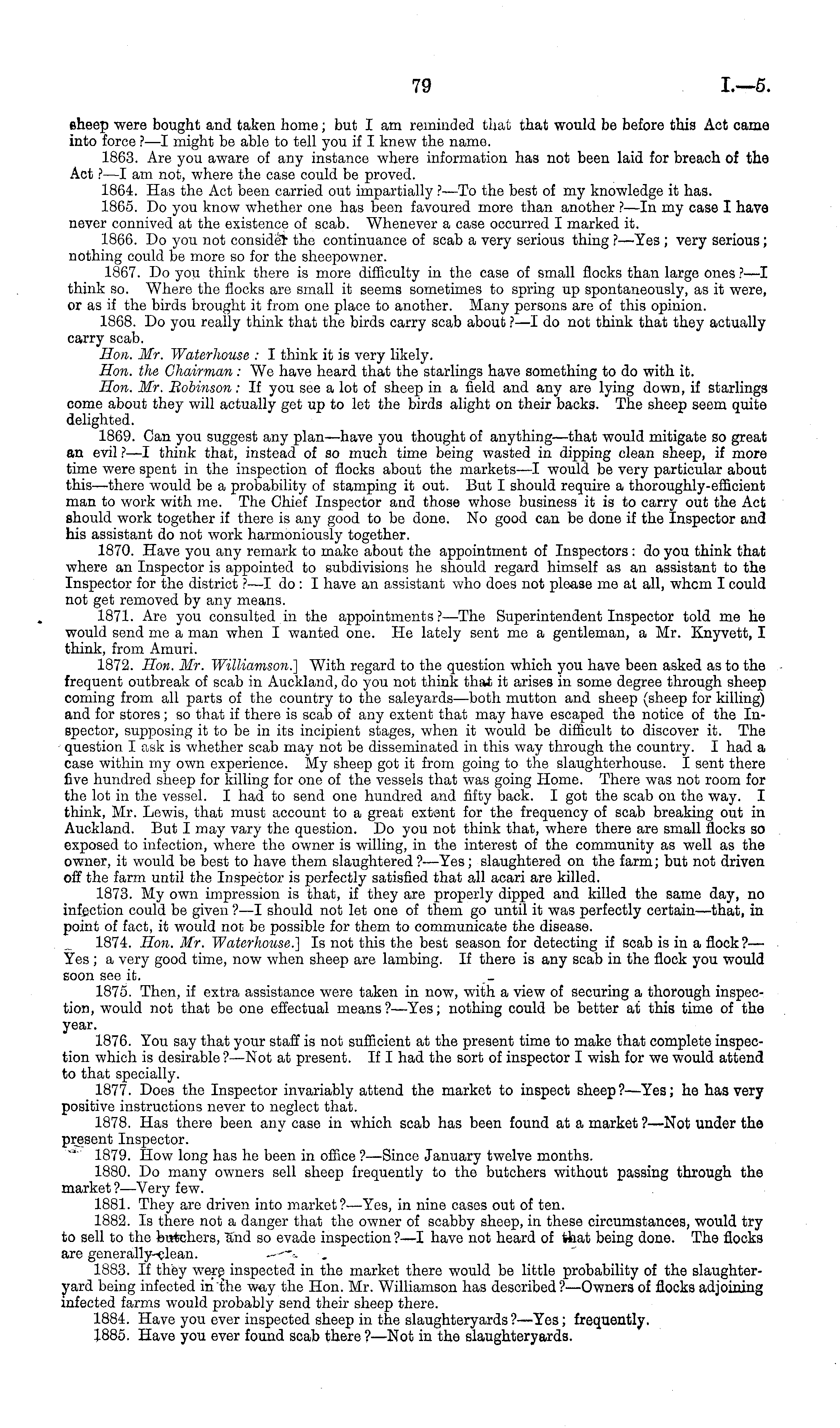 sheep were bought and taken home; but I am reminded that that would be before this Act came into force ?—I might be able to tell you if I knew the name. 1863. Are you aware of any instance where information has not been laid for breach of the Act ?—I am not, where the case could be proved. 1864. Has the Act been carried out impartially ?—To the best of my knowledge it has. 1865. Do you know whether one has been favoured more than another ?—ln my case I have never connived at the existence of scab. Whenever a case occurred I marked it. 1866. Do you not consider the continuance of scab a very serious thing ?—Yes ; very serious; nothing could be more so for the sheepowner. 1867. Do you think there is more difficulty in the case of small flocks than large ones ?—I think so. Where the flocks are small it seems sometimes to spring up spontaneously, as it were, or as if the birds brought it from one place to another. Many persons are of this opinion. 1868. Do you really think that the birds carry scab about ?—I do not think that they actually carry scab. Hon. Mr. Waterhouse : I think it is very likely. Hon. the Chairman : We have heard that the starlings have something to do with it. Hon. Mr. Bobinson: If you see a lot of sheep in a field and any are lying down, if starlings come about they will actually get up to let the birds alight on their backs. The sheep seem quite delighted. 1869. Can you suggest any plan—have you thought of anything —that would mitigate so great an evil ?—I think that, instead of so much time being wasted in dipping clean sheep, if more time were spent in the inspection of flocks about the markets—l would be very particular about this—there would be a probability of stamping it out. But I should require a thoroughly-efficient man to work with me. The Chief Inspector and those whose business it is to carry out the Act should work together if there is any good to be done. No good can be done if the Inspector and his assistant do not work harmoniously together. 1870. Have you any remark to make about the appointment of Inspectors : do you think that where an Inspector is appointed to subdivisions he should regard himself as an assistant to the Inspector for the district ? —I do : I have an assistant who does not please me at all, whom I could not get removed by any means. 1871. Are you consulted in the appointments?— The Superintendent Inspector told me he would send me a man when I wanted one. He lately sent me a gentleman, a Mr. Knyvett, I think, from Amuri. 1872. Hon. Mr. Williamson.) With regard to the question which you have been asked as to the frequent outbreak of scab in Auckland, do you not think that it arises in some degree through sheep coming from all parts of the country to the saleyards—both mutton and sheep (sheep for killing) and for stores; so that if there is scab of any extent that may have escaped the notice of the Inspector, supposing it to be in its incipient stages, when it would be difficult to discover it. The question I ask is whether scab may not be disseminated in this way through the country. I had a case within my own experience. My sheep got it from going to the slaughterhouse. I sent there five hundred sheep for killing for one of the vessels that was going Home. There was not room for the lot in the vessel. I had to send one hundred and fifty back. I got the scab on the way. I think, Mr. Lewis, that must account to a great extent for the frequency of scab breaking out in Auckland. But I may vary the question. Do you not think that, where there are small flocks so exposed to infection, where the owner is willing, in the interest of the community as well as the owner, it would be best to have them slaughtered ?—Yes; slaughtered on the farm; but not driven off the farm until the Inspector is perfectly satisfied that all acari are killed. 1873. My own impression is that, if they are properly dipped and killed the same day, no infection could be given ?—I should not let one of them go until it was perfectly certain—that, in point of fact, it would not be possible for them to communicate the disease. 1874. Hon. Mr. Waterhouse.) Is not this the best season for detecting if scab is in a flock?— Yes ; a very good time, now when sheep are lambing. If there is any scab in the flock you would soon see it. 1875. Then, if extra assistance were taken in now, with a view of securing a thorough inspection, would not that be one effectual means?— Yes; nothing could be better at this time of the year. 1876. You say that your staff is not sufficient at the present time to make that complete inspection which is desirable ?—Not at present. If I had the sort of inspector I wish for we would attend to that specially. 1877. Does the Inspector invariably attend the market to inspect sheep?— Yes; he has very positive instructions never to neglect that. 1878. Has there been any case in which scab has been found at a market ?—Not under the present Inspector. 1879. How long has he been in office ?—Since January twelve months. 1880. Do many owners sell sheep frequently to the butchers without passing through the market ?—Very few. 1881. They are driven into market?— Yes, in nine cases out of ten. 1882. Is there not a danger that the owner of scabby sheep, in these circumstances, would try to sell to the butchers, and so evade inspection ?—I have not heard of that being done. The flocks are generally clean. — **W\ 1883. If they were inspected in the market there would be little probability of the slaughteryard being infected in t;he way the Hon. Mr. Williamson has described?— Owners of flocks adjoining infected farms would probably send their sheep there. 1884. Have you ever inspected sheep in the slaughteryards? —Yes; frequently. 1885. Have you ever found scab there ?—Not in the slaughteryards.