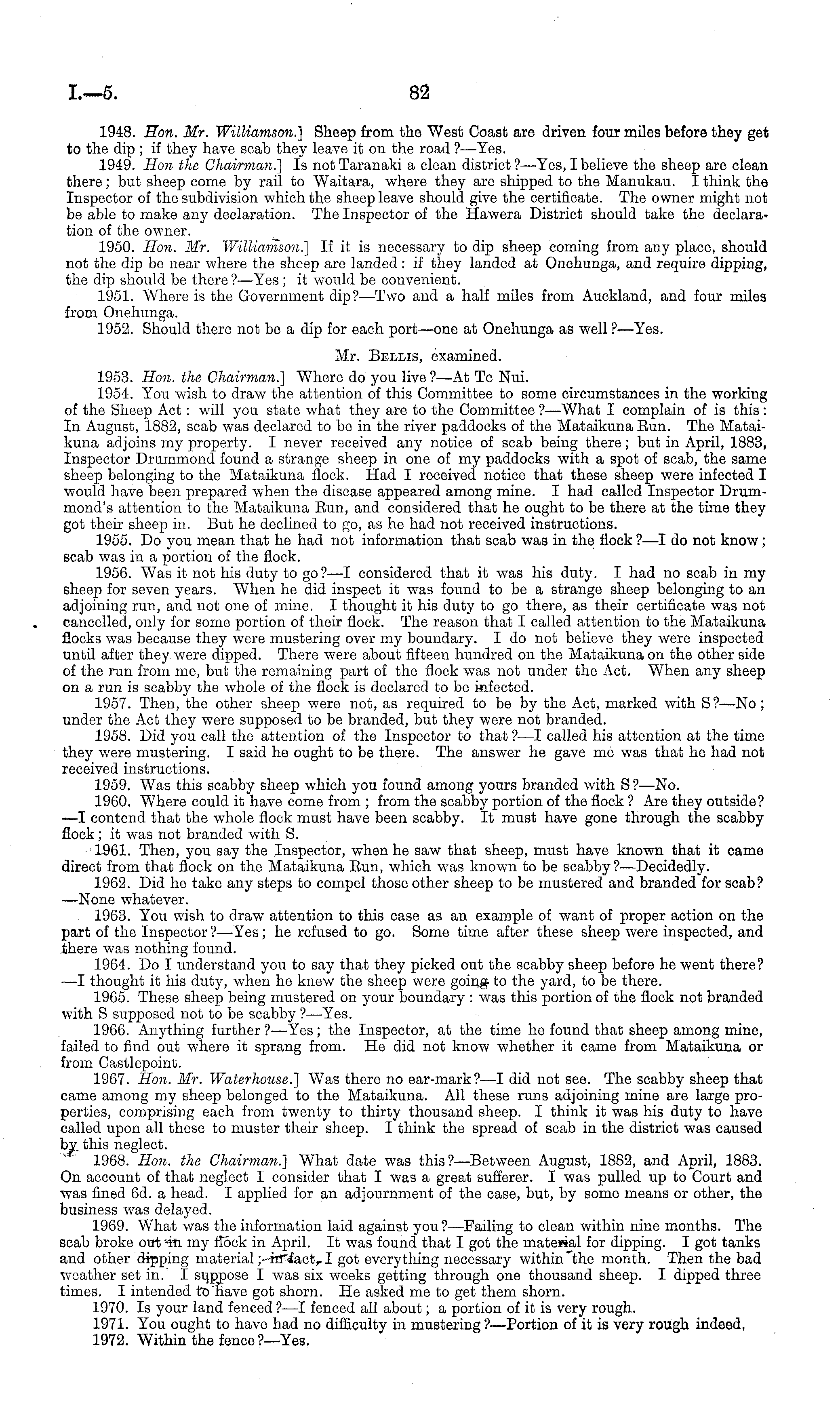 1948. Hon. Mr. Williamson.) Sheep from the West Coast are driven four miles before they get to the dip ; if they have scab they leave it on the road ?—Yes. 1949. Hon the Chairman.) Is not Taranaki a clean district ?—Yes, I believe the sheep are clean there; but sheep come by rail to Waitara, where they are shipped to the Manukau. I think the Inspector of the subdivision which the sheep leave should give the certificate. The owner might not be able to make any declaration. The Inspector of the Hawera District should take the declaration of the owner. 1950. Hon. Mr. Williamson!) If it is necessary to dip sheep coming from any place, should not the dip be near where the sheep are landed : if they landed at Onehunga, and require dipping, the dip should be there ?—Yes; it would be convenient. 1951. Where is the Government dip?— Two and a half miles from Auckland, and four miles •from Onehunga. 1952. Should there not be a dip for each port—one at Onehunga as well ?—Yes. Mr. Bellis, examined. 1953. Hon. the Chairman.) Where do you live ?—At Te Nui. 1954. You wish to draw the attention of this Committee to some circumstances in the working of the Sheep Act: will you state what they are to the Committee ? —What I complain of is this : In August, 1882, scab was declared to be in the river paddocks of the Mataikuna Bun. The Mataikuna adjoins my property. I never received any notice of scab being there; but in April, 1883, Inspector Drummond found a strange sheep in one of my paddocks with a spot of scab, the same sheep belonging to the Mataikuna flock. Had I received notice that these sheep were infected I would have been prepared when the disease appeared among mine. I had called Inspector Drummond's attention to the Mataikuna Bun, and considered that he ought to be there at the time they got their sheep in. But he declined to go, as he had not received instructions. 1955. Do you mean that he had not information that scab was in the flock ?—I do not know ; scab was in a portion of the flock. 1956. Was it not his duty to go?—I considered that it was his duty. I had no scab in my sheep for seven years. When he did inspect it was found to be a strange sheep belonging to an adjoining run, and not one of mine. I thought it his duty to go there, as their certificate was not cancelled, only for some portion of their flock. The reason that I called attention to the Mataikuna flocks was because they were mustering over my boundary. I do not believe they were inspected until after they, were dipped. There were about fifteen hundred on the Mataikuna on the other side of the run from me, but the remaining part of the flock was not under the Act. When any sheep on a run is scabby the whole of the flock is declared to be infected. 1957. Then, the other sheep were not, as required to be by the Act, marked with S?—No; under the Act they were supposed to be branded, but they were not branded. 1958. Did you call the attention of the Inspector to that ?—I called his attention at the time they were mustering. I said he ought to be there. The answer he gave me was that he had not received instructions. 1959. Was this scabby sheep which you found among yours branded with S?—No. 1960. Where could it have come from ; from the scabby portion of the flock ? Are they outside? —I contend that the whole flock must have been scabby. It must have gone through the scabby flock; it was not branded with S. 1961. Then, you say the Inspector, when he saw that sheep, must have known that it came direct from that flock on the Mataikuna Bun, which was known to be scabby ?—Decidedly. 1962. Did he take any steps to compel those other sheep to be mustered and branded for scab? —None whatever. - 1963. You wish to draw attention to this case as an example of want of proper action on the part of the Inspector?— Yes; he refused to go. Some time after these sheep were inspected, and there was nothing found. 1964. Do I understand you to say that they picked out the scabby sheep before he went there? —I thought it his duty, when he knew the sheep were going- to the yard, to be there. 1965. These sheep being mustered on your boundary : was this portion of the flock not branded with S supposed not to be scabby ?—Yes. 1966. Anything further ? —Yes; the Inspector, at the time he found that sheep among mine, failed to find out where it sprang from. He did not know whether it came from Mataikuna or from Castlepoint. 1967. Hon. Mr. Waterhouse.) Was there no ear-mark? —I did not see. The scabby sheep that came among my sheep belonged to the Mataikuna. All these runs adjoining mine are large properties, comprising each from twenty to thirty thousand sheep. I think it was his duty to have called upon all these to muster their sheep. I think the spread of scab in the district was caused by this neglect. 1968. Hon. the Chairman.] What date was this?— Between August, 1882, and April, 1883. On account of that neglect I consider that I was a great sufferer. I was pulled up to Court and was fined 6d. a head. I applied for an adjournment of the case, but, by some means or other, the business was delayed. 1969. What was the information laid against you? —Failing to clean within nine months. The scab broke out -in my flock in April. It was found that I got the material for dipping. I got tanks and other dipping material ;• -hrfact, I got everything necessary within'the month. Then the bad weather set in. I suppose I was six weeks getting through one thousand sheep. I dipped three times. I intended to have got shorn. He asked me to get them shorn. 1970. Is your land fenced ?—I fenced all about; a portion of it is very rough. 1971. You ought to have had no difficulty in mustering ?—Portion of it is very rough indeed. 1972. Within the fence ?—Yes.