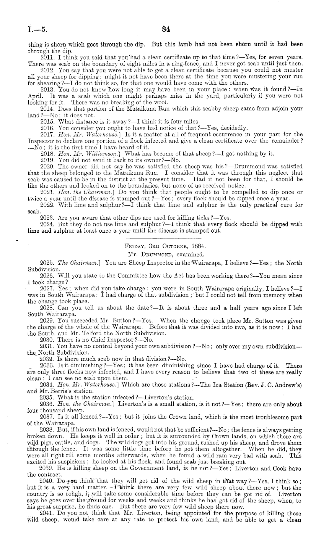 Feiday, 3ed Octobee, 1884. Mr. Deummond, examined. 2025. The Chairman.) You are Sheep Inspector in the Wairarapa, I believe ?—Yes ; the North Subdivision. 2026. Will you state to the Committee how the Act has been working there ?—You mean since I took charge ? 2027. Yes ; when did you take charge : you were in South Wairarapa originally, I believe ?—I was in South Wairarapa: I had charge of that subdivision ; but I could not tell from memory when the change took place. 2028. Can you tell us about the date?—lt is about three and a half years ago since I left South Wairarapa. 2029. You succeeded Mr. Sutton ?—Yes. When the change took place Mr. Sutton was given the charge of the whole of the Wairarapa. Before that it was divided into two, as it is now : I had the South, and Mr. Telford the North Subdivision. 2030. There is no Chief Inspector ?—No. 2031. You have no control beyond your own subdivision ?—No; only over my own subdivision— the North Subdivision. 2032. Is there much scab now in that division?— No. 2033. Is it diminishing ? —Yes; it has been diminishing since I have had charge of it. There are only three flocks now infected, and I have every reason to believe that two of these are really clean ; I can see no scab upon them. 2034. Hon. Mr. Waterhouse.) Which are those stations ?—The lea Station (Bey. J. C. Andrew's) and Mr. Berris's station. 2035. What is the station infected?—Liverton's station. 2036. Hon. the Chairman.) Liverton's is a small station, is it not?— Yes; there are only about four thousand sheep. 2037. Is it all fenced ?—Yes; but it joins the Crown land, which is the most troublesome part of the Wairarapa. 2038. But, if his own land is fenced, would not that be sufficient?—No; the fence is always getting broken down. He keeps it well in order ; but it is surrounded by Crown lands, on which there are wild pigs, cattle, and dogs. The wild dogs got into his ground, rushed up his sheep, and drove them through the fence. It was some little time before he got them altogether. When he did, they were all right till some months afterwards, when he found a wild ram very bad with scab. This excited his suspicions ; he looked at his flock, and found scab just breaking out. 2039. He is killing sheep on the Government land, is he not ?—Yes; Liverton and Cook have the contract. 2040. Do you think" that they will get rid of the wild sheep in that way ?—Yes, I think so ; but it is a very hard matter. I think there are very few wild sheep about there now; but the country is so rough, it will take some considerable time before they can be got rid of. Liverton says he goes over the ground for weeks and weeks and thinks he has got rid of the sheep, when, to his great surprise, he finds one. But there are very few wild sheep there now. 2041. Do you not think that Mr. Liverton, being appointed for the purpose of killing these wild sheep, would take care at any rate to protect his own land, and be able to get a clean