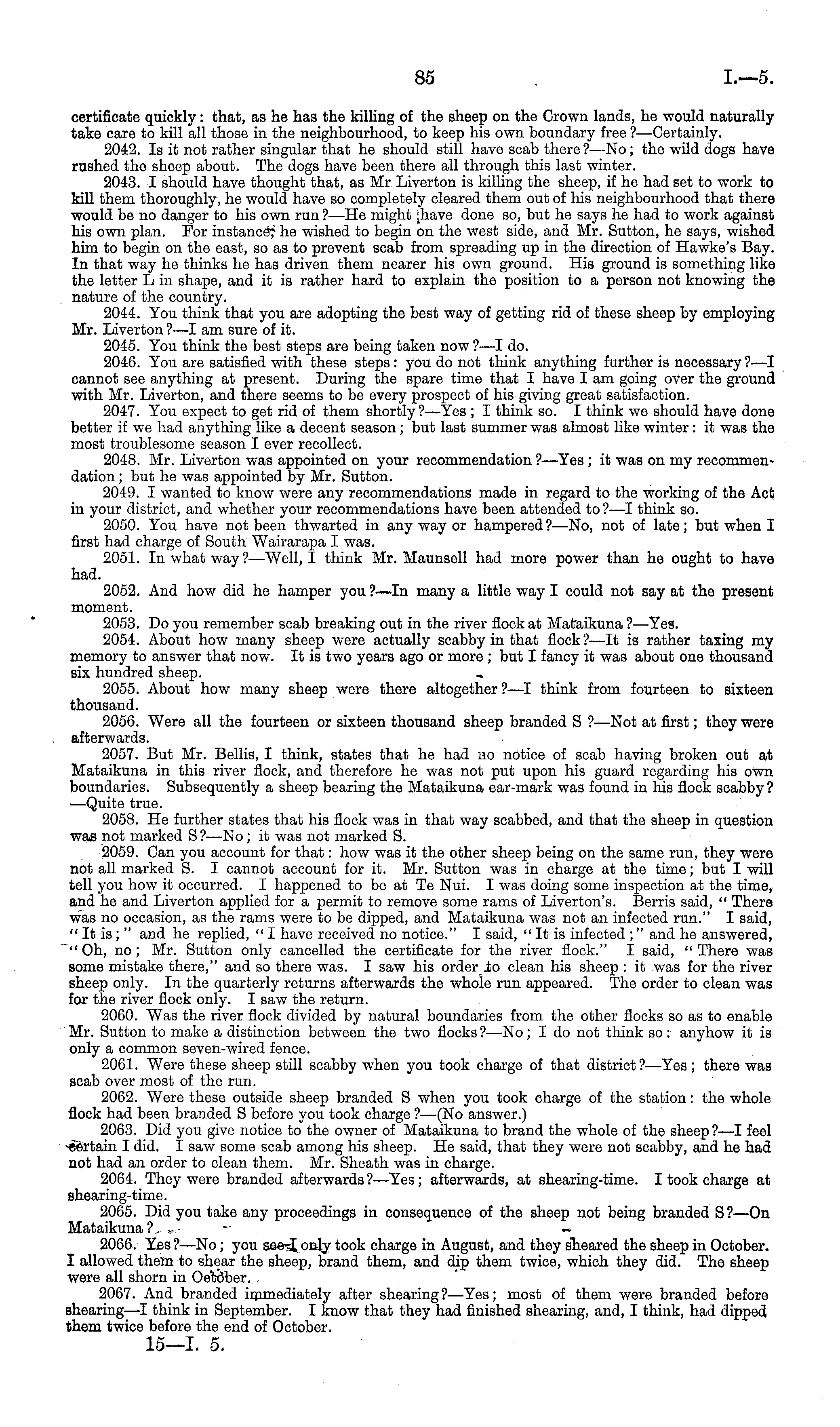 certificate quickly: that, as he has the killing of the sheep on the Crown lands, he would naturally take care to kill all those in the neighbourhood, to keep his own boundary free ?—Certainly. 2042. Is it not rather singular that he should still have scab there? —No; the wild dogs have rushed the sheep about. The dogs have been there all through this last winter. 2043. I should have thought that, as Mr Liverton is killing the sheep, if he had set to work to kill them thoroughly, he would have so completely cleared them out of his neighbourhood that there would be no danger to his own run ?—He might .have done so, but he says he had to work against his own plan. For instance, he wished to begin on the west side, and Mr. Sutton, he says, wished him to begin on the east, so as to prevent scab from spreading up in the direction of Hawke's Bay. In that way he thinks he has driven them nearer his own ground. His ground is something like the letter L in shape, and it is rather hard to explain the position to a person not knowing the nature of the country. 2044. You think that you are adopting the best way of getting rid of these sheep by employing Mr. Liverton?—-I am sure of it. 2045. You think the best steps are being taken now ?—I do. 2046. You are satisfied with these steps : you do not think anything further is necessary ?—I cannot see anything at present. During the spare time that I have lam going over the ground with Mr. Liverton, and there seems to be every prospect of his giving great satisfaction. 2047. You expect to get rid of them shortly?— Yes ; I think so. I think we should have done better if we had anything like a decent season; but last summer was almost like winter: it was the most troublesome season I ever recollect. 2048. Mr. Liverton was appointed on your recommendation ?—Yes ; it was on my recommendation ; but he was appointed by Mr. Sutton. 2049. I wanted to know were any recommendations made in regard to the working of the Act in your district, and whether your recommendations have been attended to?—I think so. 2050. You have not been thwarted in any way or hampered ? —No, not of late; but when I first had charge of South Wairarapa I was. 2051. In what way?— Well, I think Mr. Maunsell had more power than he ought to have had. 2052. And how did he hamper you ?—ln many a little way I could not say at the present moment. 2053. Do you remember scab breaking out in the river flock at Mataikuna ?—Yes. 2054. About how many sheep were actually scabby in that flock ?—lt is rather taxing my memory to answer that now. It is two years ago or more ; but I fancy it was about one thousand six hundred sheep. 2055. About how many sheep were there altogether?—l think from fourteen to sixteen thousand. 2056. Were all the fourteen or sixteen thousand sheep branded S ?—Not at first; they were afterwards. 2057. But Mr. Bellis, I think, states that he had no notice of scab having broken out at Mataikuna in this river flock, and therefore he was not put upon his guard regarding his own boundaries. Subsequently a sheep bearing the Mataikuna ear-mark was found in his flock scabby? —Quite true. 2058. He further states that his flock was in that way scabbed, and that the sheep in question was not marked S?—No; it was not marked S. 2059. Can you account for that: how was it the other sheep being on the same run, they were not all marked S. I cannot account for it. Mr. Sutton was in charge at the time; but I will tell you how it occurred. I happened to be at Te Nui. I was doing some inspection at the time, and he and Liverton applied for a permit to remove some rams of Liverton's. Berris said, " There was no occasion, as the rams were to be dipped, and Mataikuna was not an infected run." I said, "It is; " and he replied, " I have received no notice." I said, "It is infected ;" and he answered, " Oh, no; Mr. Sutton only cancelled the certificate for the river flock." I said, " There was some mistake there," and so there was. I saw his order ±o clean his sheep :it was for the river sheep only. In the quarterly returns afterwards the whole run appeared. The order to clean was for the river flock only. I saw the return. 2060. Was the river flock divided by natural boundaries from the other flocks so as to enable Mr. Sutton to make a distinction between the two flocks ? —No; I do not think so : anyhow it is only a common seven-wired fence. 2061. Were these sheep still scabby when you took charge of that district ?—Yes ; there was scab over most of the run. 2062. Were these outside sheep branded S when you took charge of the station: the whole flock had been branded S before you took charge ?—(No answer.) 2063. Did you give notice to the owner of Mataikuna to brand the whole of the sheep?—l feel certain I did. I saw some scab among his sheep. He said, that they were not scabby, and he had not had an order to clean them. Mr. Sheath was in charge. 2064. They were branded afterwards?— Yes; afterwards, at shearing-time. I took charge at shearing-time. 2065. Did you take any proceedings in consequence of the sheep not being branded S?—On Mataikuna ? .-a-***-*, 2066. Yes ?—No; you see I only took charge in August, and they sheared the sheep in October. I allowed them to shear the sheep, brand them, and dip them twice, which they did. The sheep were all shorn in October. 2067. And branded immediately after shearing?— Yes; most of them were branded before shearing—l think in September. I know that they had finished shearing, and, I think, had dipped them twice before the end of October. 15—1. 5.