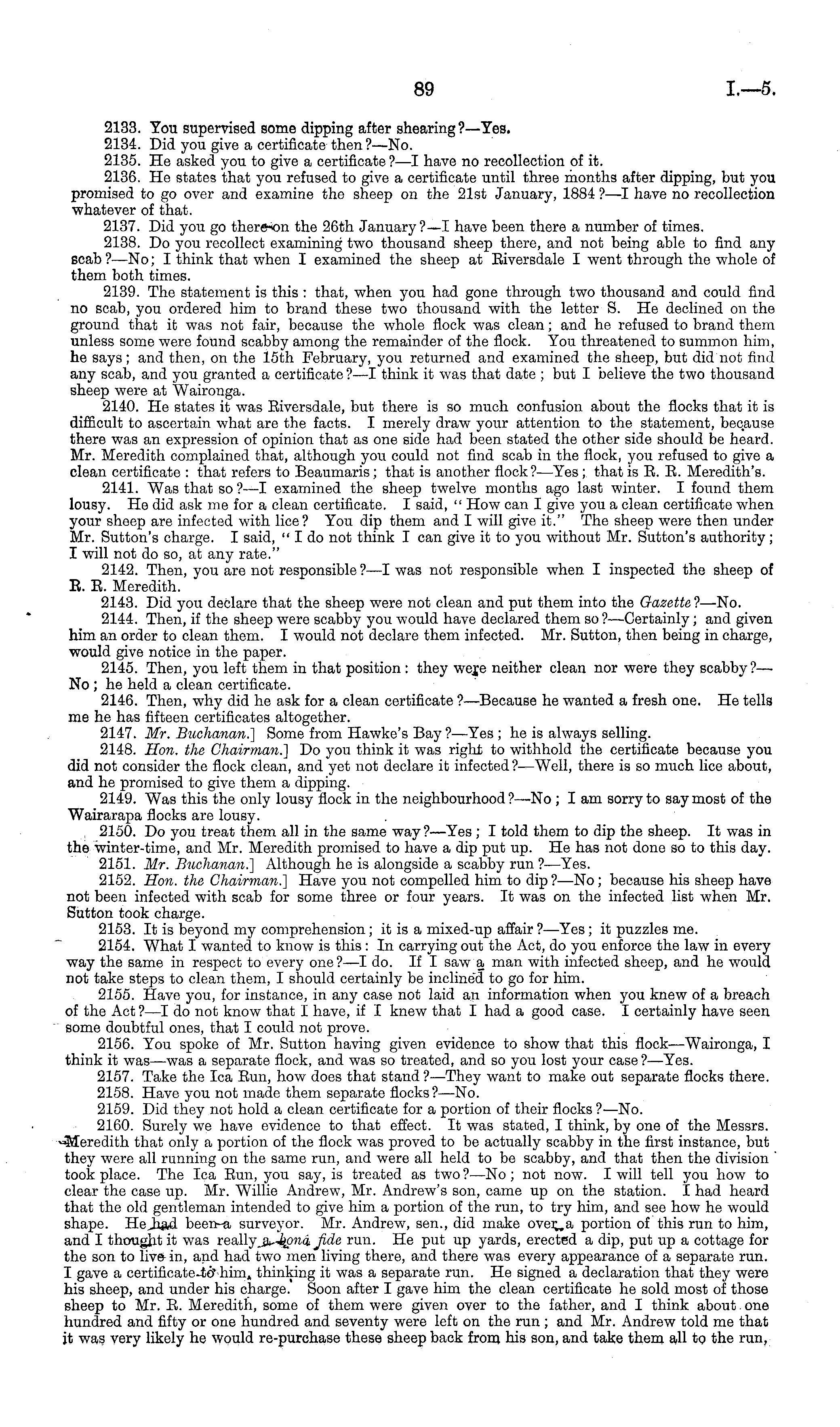 2133. You supervised some dipping after shearing?— Yes. 2134. Did you give a certificate then ?—No. 2135. Ho asked you to give a certificate ?—I have no recollection of it. 2136. He states that you refused to give a certificate until three months after dipping, but you promised to go over and examine the sheep on the 21st January, 1884 ?—I have no recollection whatever of that. 2137. Did you go there-on the 26th January ?—I have been there a number of times. 2138. Do you recollect examining two thousand sheep there, and not being able to find any scab ?—No; I think that when I examined the sheep at Biversdale I went through the whole of them both times. 2139. The statement is this : that, when you had gone through two thousand and could find no scab, you ordered him to brand these two thousand with the letter S. He declined on the ground that it was not fair, because the whole flock was clean; and he refused to brand them unless some were found scabby among the remainder of the flock. You threatened to summon him, he says; and then, on the 15th February, you returned and examined the sheep, but did not find any scab, and you granted a certificate ?—I think it was that date ; but I believe the two thousand sheep were at Waironga. 2140. He states it was Biversdale, but there is so much confusion about the flocks that it is difficult to ascertain what are the facts. I merely draw your attention to the statement, because there was an expression of opinion that as one side had been stated the other side should be heard. Mr. Meredith complained that, although you could not find scab in the flock, you refused to give a clean certificate : that refers to Beaumaris; that is another flock?— Yes; that is B. B. Meredith's. 2141. Was that so ? —I examined the sheep twelve months ago last winter. I found them lousy. He did ask me for a clean certificate. I said, " How can I give you a clean certificate w-hen your sheep are infected with lice? You dip them and I will give it." The sheep were then under Mr. Sutton's charge. I said, "I do not think I can give it to you without Mr. Sutton's authority; I will not do so, at any rate." 2142. Then, you are not responsible ? —I was not responsible when I inspected the sheep of E. E. Meredith. 2143. Did you declare that the sheep were not clean and put them into the Gazette ?—No. 2144. Then, if the sheep were scabby you would have declared them so ? —Certainly ; and given him an order to clean them. I would not declare them infected. Mr. Sutton, then being in charge, would give notice in the paper. 2145. Then, you left them in that position : they were neither clean nor were they scabby?—■ No ; he held a clean certificate. 2146. Then, why did he ask for a clean certificate ? —Because he wanted a fresh one. He tells me he has fifteen certificates altogether. 2147. Mr. Buchanan.) Some from Hawke's Bay ? —Yes ; he is always selling. 2148. Hon. the Chairman.) Do you think it was right to withhold the certificate because you did not consider the flock clean, and yet not declare it infected? —Well, there is so much lice about, and he promised to give them a dipping. 2149. Was this the only lousy flock in the neighbourhood ?—No ; I am sorry to say most of the Wairarapa flocks are lousy. 2150. Do you treat them all in the same way?— Yes ; I told them to dip the sheep. It was in the winter-time, and Mr. Meredith promised to have a dip put up. He has not done so to this day. 2151. Mr. Buchanan!) Although he is alongside a scabby run ? —Yes. 2152. Hon. the Chairman.) Have you not compelled him to dip ?—No; because his sheep have not been infected with scab for some three or four years. It was on the infected list when Mr. Sutton took charge. 2153. It is beyond my comprehension; it is a mixed-up affair ?—Yes; it puzzles me. 2154. What I wanted to know is this : In carrying out the Act, do you enforce the law in every way the same in respect to every one?—l do. If I saw a man with infected sheep, and he would not take steps to clean them, I should certainly be inclined to go for him. _. 2155. Have you, for instance, in any case not laid an information when you knew of a breach of the Act? —I do not know that I have, if I knew that I had a good case. I certainly have seen some doubtful ones, that I could not prove. 2156. You spoke of Mr. Sutton having given evidence to show that this flock—Waironga, I think it was—was a separate flock, and was so treated, and so you lost your case? —Yes. 2157. Take the lea Bun, how does that stand ?—They want to make out separate flocks there, 2158. Have you not made them separate flocks?— No. 2159. Did they not hold a clean certificate for a portion of their flocks ?—No. 2160. Surely we have evidence to that effect. It was stated, I think, by one of the Messrs. Meredith that only a portion of the flock was proved to be actually scabby in the first instance, but they were all running on the same run, and were all held to be scabby, and that then the division ' took place. The lea Bun, you say, is treated as two?—No; not now. I will tell you how to clear the case up. Mr. Willie Andrew, Mr. Andrew's son, came up on the station. I had heard that the old gentleman intended to give him a portion of the run, to try him, and see how he would shape. He had been-a surveyor. Mr. Andrew, sen., did make over„a portion of this run to him, and I thought it was really a bond fide run. He put up yards, erected a dip, put up a cottage for the son to live in, and had two men living there, and there was every appearance of a separate run. I gave a certificate to him, thinking it was a separate run. He signed a declaration that they were his sheep, and under his charge. Soon after I gave him the clean certificate he sold most of those sheep to Mr. B. Meredith, some of them were given over to the father, and I think about one hundred and fifty or one hundred and seventy were left on the run ; and Mr