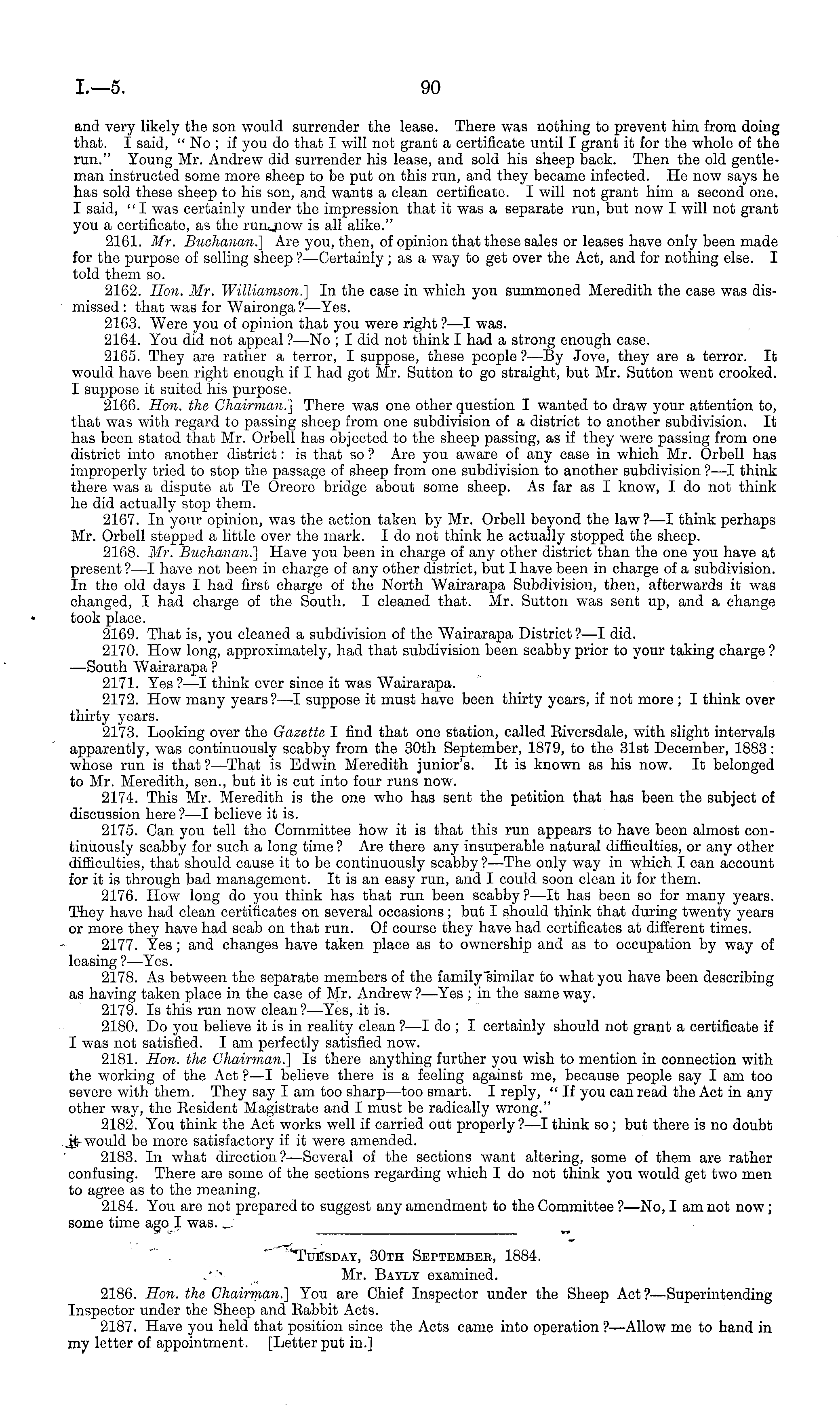 Tuesday, 30th Septembee, 1884. Mr. Bayly examined. 2186. Hon. the Chairman.) You are Chief Inspector under the Sheep Act?— Superintending Inspector under the Sheep and Babbit Acts. 2187. Have you held that position since the Acts came into operation ?—Allow me to hand in my letter of appointment. [Letter put in.]