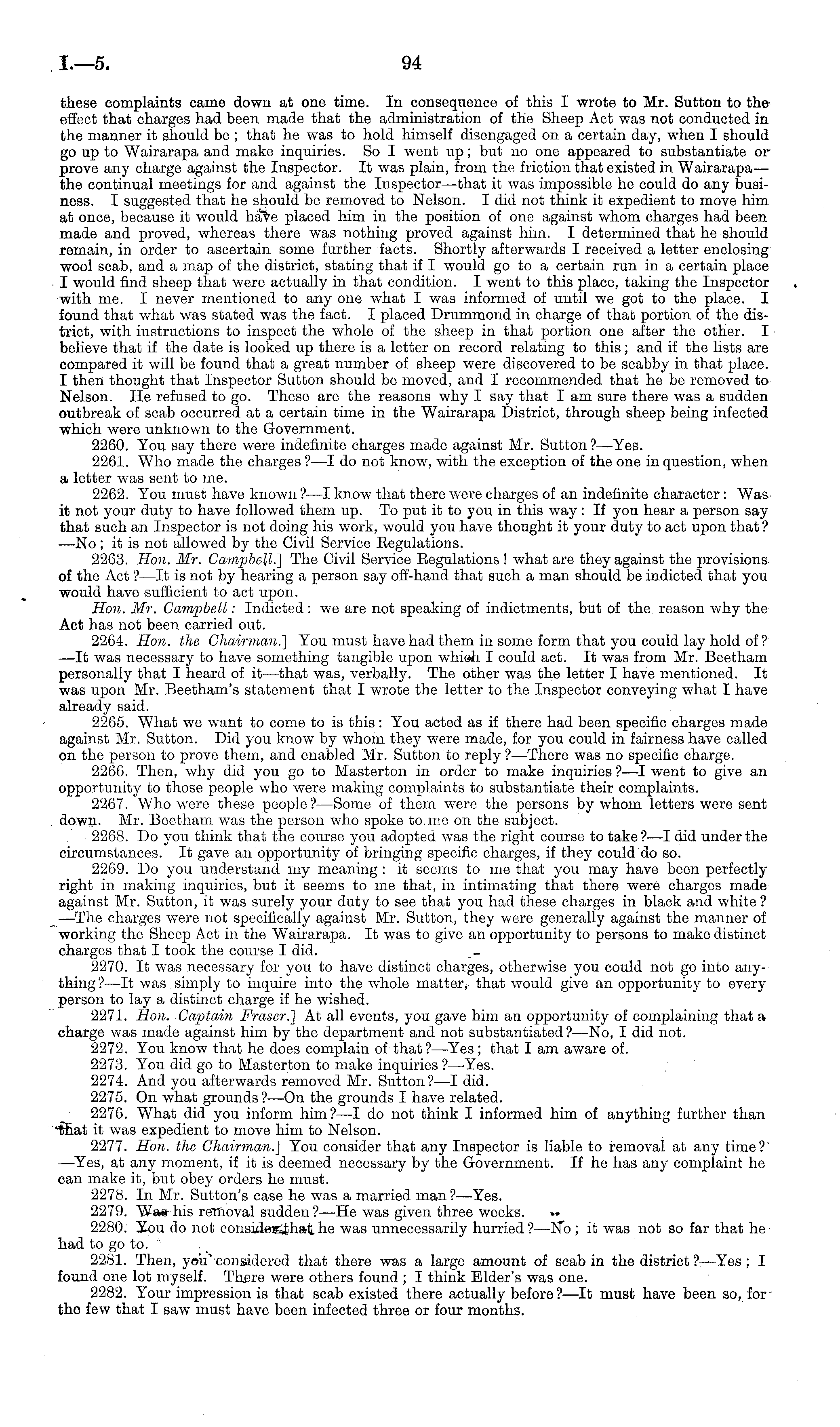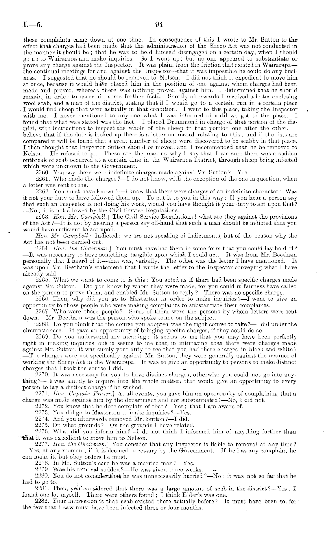 these complaints came down at one time. In consequence of this I wrote to Mr. Sutton to the effect that charges had been made that the administration of the Sheep Act was not conducted in the manner it should bo ; that he was to hold himself disengaged on a certain day, when I should go up to Wairarapa and make inquiries. So I went up; but no one appeared to substantiate or prove any charge against the Inspector. It was plain, from the friction that existed in Wairarapa— the continual meetings for and against the Inspector—that it was impossible he could do any business. I suggested that he should be removed to Nelson. I did not think it expedient to move him at once, because it would have placed him in the position of one against whom charges had been made and proved, whereas there was nothing proved against him. I determined that he should remain, in order to ascertain some further facts. Shortly afterwards I received a letter enclosing wool scab, and a map of the district, stating that if I would go to a certain run in a certain place . I would find sheep that were actually in that condition. I went to this place, taking the Inspector with me. I never mentioned to any one what I was informed of until we got to the place. I found that what was stated was the fact. I placed Drummond in charge of that portion of the district, with instructions to inspect the whole of the sheep in that portion one after the other. I believe that if the date is looked up there is a letter on record relating to this; and if the lists are compared it will be found that a great number of sheep were discovered to be scabby in that place. I then thought that Inspector Sutton should be moved, and I recommended that he be removed to Nelson. He refused to go. These are the reasons why I say that lam sure there was a sudden outbreak of scab occurred at a certain time in the Wairarapa District, through sheep being infected which were unknown to the Government. 2260. You say there were indefinite charges made against Mr. Sutton ? —Yes. 2261. Who made the charges ? —I do not know, with the exception of the one in question, when a letter was sent to me. 2262. You must have known ?—I know that there were charges of an indefinite character: Was it not your duty to have followed them up. To put it to you in this way :If you hear a person say that such an Inspector is not doing his work, w-ould you have thought it your duty to act upon that ? —No; it is not allowed by the Civil Service Begulations. 2263. Hon. Mr. Campbell.) The Civil Service Begulations ! what are they against the provisions of the Act ?—lt is not by hearing a person say off-hand that such a man should be indicted that you would have sufficient to act upon. Hon. Mr. Campbell: Indicted: we are not speaking of indictments, but of the reason why the Act has not been carried out. 2264. Hon. the Chairman.) You must have had them in some form that you could lay hold of ? —It was necessary to have something tangible upon whioh I could act. It was from Mr. Beetham personally that I heard of it—that was, verbally. The other was the letter I have mentioned. It was upon Mr. Beetham's statement that I wrote the letter to the Inspector conveying what I have already said. 2265. What we want to come to is this : You acted as if there had been specific charges made against Mr. Sutton. Did you know by whom they were made, for you could in fairness have called on the person to prove them, and enabled Mr. Sutton to reply ?—There was no specific charge. 2266. Then, why did you go to Masterton in order to make inquiries ?—I went to give an opportunity to those people who were making complaints to substantiate their complaints. 2267. Who were these people?— Some of them were the persons by whom letters were sent . down. Mr. Beetham was the person who spoke to.me on the subject. 2268. Do you think that the course you adopted was the right course to take ? —I did under the circumstances. It gave an opportunity of bringing specific charges, if they could do so. 2269. Do you understand my meaning : it seems to me that you may have been perfectly right in making inquiries, but it seems to me that, in intimating that there were charges made against Mr. Sutton, it w-as surely your duty to see that you had these charges in black and white ? —The charges were not specifically against Mr. Sutton, they were generally against the manner of working the Sheep Act in the Wairarapa. It was to give an opportunity to persons to make distinct charges that I took the course I did. 2270. It was necessary for you to have distinct charges, otherwise you could not go into anything? —It was simply to inquire into the whole matter, that would give an opportunity to every person to lay a distinct charge if he wished. 2271. Hon. Captain Fraser.) At all events, you gave him an opportunity of complaining that a charge was made against him by the department and not substantiated?—No, I did not. 2272. You know that he does complain of that?— Yes; that I am aware of. 2273. You did go to Masterton to make inquiries ?—Yes. 2274. And you afterwards removed Mr. Sutton?—l did. 2275. On what grounds?—On the grounds I have related. 2276. What did you inform him?—l do not think I informed him of anything further than that it was expedient to move him to Nelson. 2277. Hon. the Chairman.) You consider that any Inspector is liable to removal at any time? —Yes, at any moment, if it is deemed necessary by the Government. If he has any complaint he can make it, but obey orders he must. 2278. In Mr. Sutton's case he was a married man?— Yes. 2279. Was his removal sudden ?—He was given three weeks. 2280. You do not consider that he was unnecessarily hurried ? —No ; it was not so far that he had to go to. 2281. Then, yoir considered that there was a large amount of scab in the district ? —Yes ; I found one lot myself. There were others found ; I think Elder's was one. 2282. Yo
