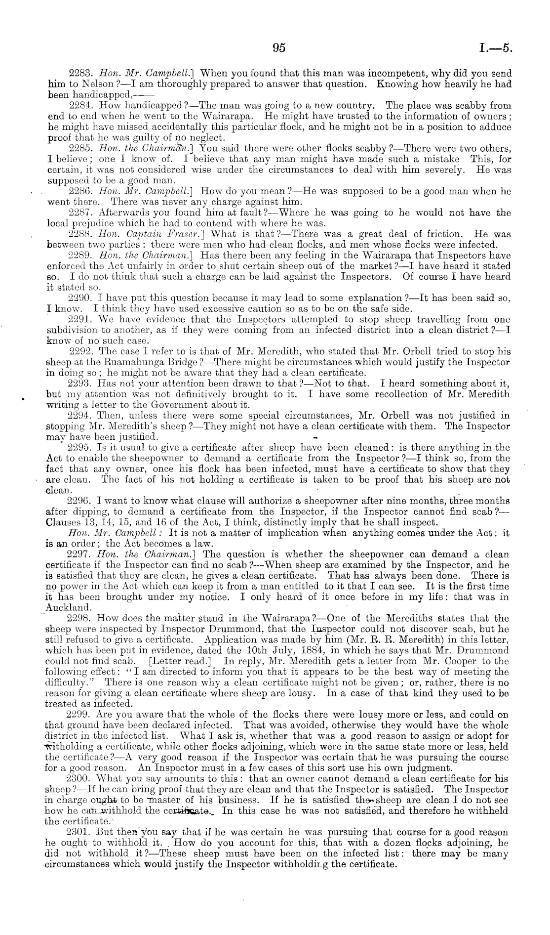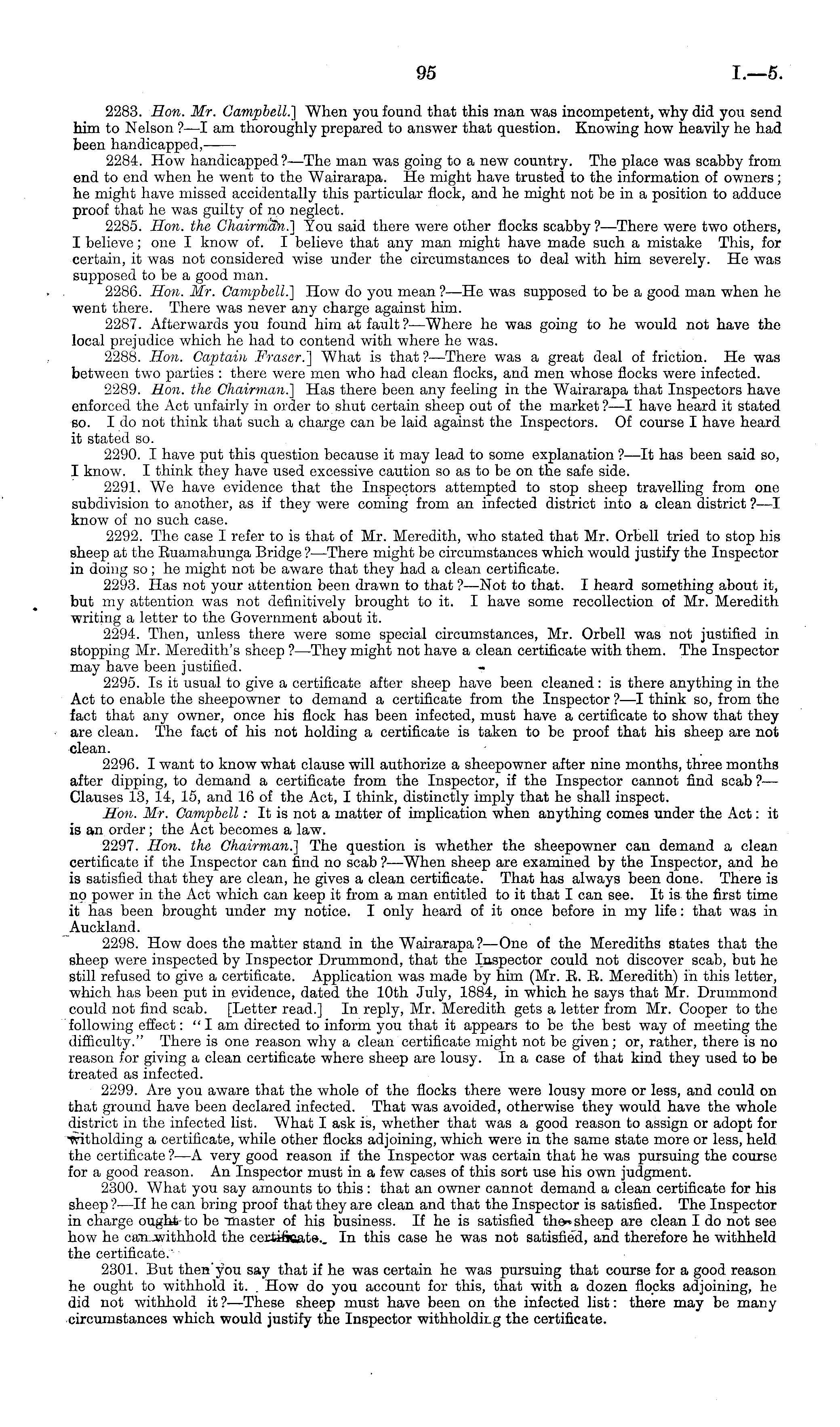 2283. Hon. Mr. Campbell.) When you found that this man was incompetent, why did you send him to Nelson ? —I am thoroughly prepared to answer that question. Knowing how heavily ho had been handicapped, 2284. How handicapped?— The man was going to a new country. The place was scabby from end to end when he went to tho Wairarapa. He might have trusted to the information of owners; he might have missed accidentally this particular flock, and he might not be in a position to adduce proof that he was guilty of no neglect. 2285. Hon. the Chairman.) You said there were other flocks scabby ?—There were two others, I believe; one I know of. I believe that any man might have made such a mistake This, for certain, it was not considered wise under the circumstances to deal with him severely. He was supposed to be a good man. 2286. Hon. Mr. Campbell.) How do you mean ? —He was supposed to be a good man when he went there. There was never any charge against him. 2287. Afterwards you found him at fault?— Where he was going to he would not have the local prejudice which he had to contend with where he was. 2288. Hon. Captain Fraser.) What is that ?—There was a great deal of friction. He was between two parties : there were men who had clean flocks, and men whose flocks were infected. 2289. Hon. the Chairman!) Has there been any feeling in the Wairarapa that Inspectors have enforced the Act unfairly in order to shut certain sheep out of the market?—l have heard it stated so. Ido not think that such a charge can be laid against the Inspectors. Of course I have heard it stated so. 2290. I have put this question because it may lead to some explanation ? —lt has been said so, I know. I think they have used excessive caution so as to be on the safe side. 2291. We have evidence that the Inspectors attempted to stop sheep travelling from one subdivision to another, as if they were coming from an infected district into a clean district ?—I know of no such case. 2292. The case I refer to is that of Mr. Meredith, who stated that Mr. Orbell tried to stop his sheep at the Buamahunga Bridge ? —There might be circumstances which would justify the Inspector in doing so; he might not be aware that they had a clean certificate. 2293. Has not your attention been drawn to that ? —Not to that. I heard something about it, but my attention was not definitively brought to it. I have some recollection of Mr. Meredith writing a letter to the Government about it. 2294. Then, unless there were some special circumstances, Mr. Orbell was not justified in stopping Mr. Meredith's sheep ?—They might not have a clean certificate with them. The Inspector may have been justified. 2295. Is it usual to give a certificate after sheep have been cleaned: is there anything in the Act to enable the sheepowner to demand a certificate from the Inspector ?—I think so, from the fact that any owner, once his flock has been infected, must have a certificate to show that they are clean. The fact of his not holding a certificate is taken to be proof that his sheep are not clean. 2296. I want to know what clause will authorize a sheepowner after nine months, three months after dipping, to demand a certificate from the Inspector, if the Inspector cannot find scab ?— Clauses 13, 14, 15, and 16 of the Act, I think, distinctly imply that he shall inspect. Hon. Mr. Campbell: It is not a matter of implication when anything comes under the Act: it is an order; the Act becomes a law. 2297. Hon. the Chairman.) The question is whether the sheepowner can demand a clean certificate if the Inspector can find no scab ? —When sheep are examined by the Inspector, and he is satisfied that they are clean, he gives a clean certificate. That has always been done. There is no power in the Act which can keep it from a man entitled to it that I can see. It is the first time it has been brought under my notice. I only heard of it once before in my life: that was in Auckland. 2298. How does the matter stand in the Wairarapa ? —One of the Merediths states that the sheep were inspected by Inspector Drummond, that the Inspector could not discover scab, but he still refused to give a certificate. Application was made by him (Mr. B. B. Meredith) in this letter, which has been put in evidence, dated the 10th July, 1884, in which he says that Mr. Drummond could not find scab. [Letter read.] In reply, Mr. Meredith gets a letter from Mr. Cooper to the following effect: "I am directed to inform you that it appears to be the best way of meeting the difficulty." There is one reason why a clean certificate might not be given; or, rather, there is no reason for giving a clean certificate where sheep are lousy. In a case of that kind they used to be treated as infected. 2299. Are you aware that the whole of the flocks there were lousy more or less, and could on that ground have been declared infected. That was avoided, otherwise they would have the whole district in the infected list. What I ask is, whether that was a good reason to assign or adopt for wit holding a certificate, while other flocks adjoining, which were in the same state more or less, held the certificate ?—A very good reason if the Inspector was certain that he was pursuing the course for a good reason. An Inspector must in a few cases of this sort use his own judgment. 2300. What you say amounts to this : that an owner cannot demand a clean certificate for his sheep ?—lf he can bring proof that they are clean and that the Inspector is satisfied. The Inspector in charge ought to be "master of his business. If he is satisfied the sheep are clean Ido not see how he can withhold the certificate. In this case he was not satisfied, and therefore he withheld the certificate. 2301. But then you say that if he was certain he was pursuing that course for a good reason he ought to withhold it. How do you account for this, that with a dozen flocks adjoining, he did not withhold it?— These sheep must h