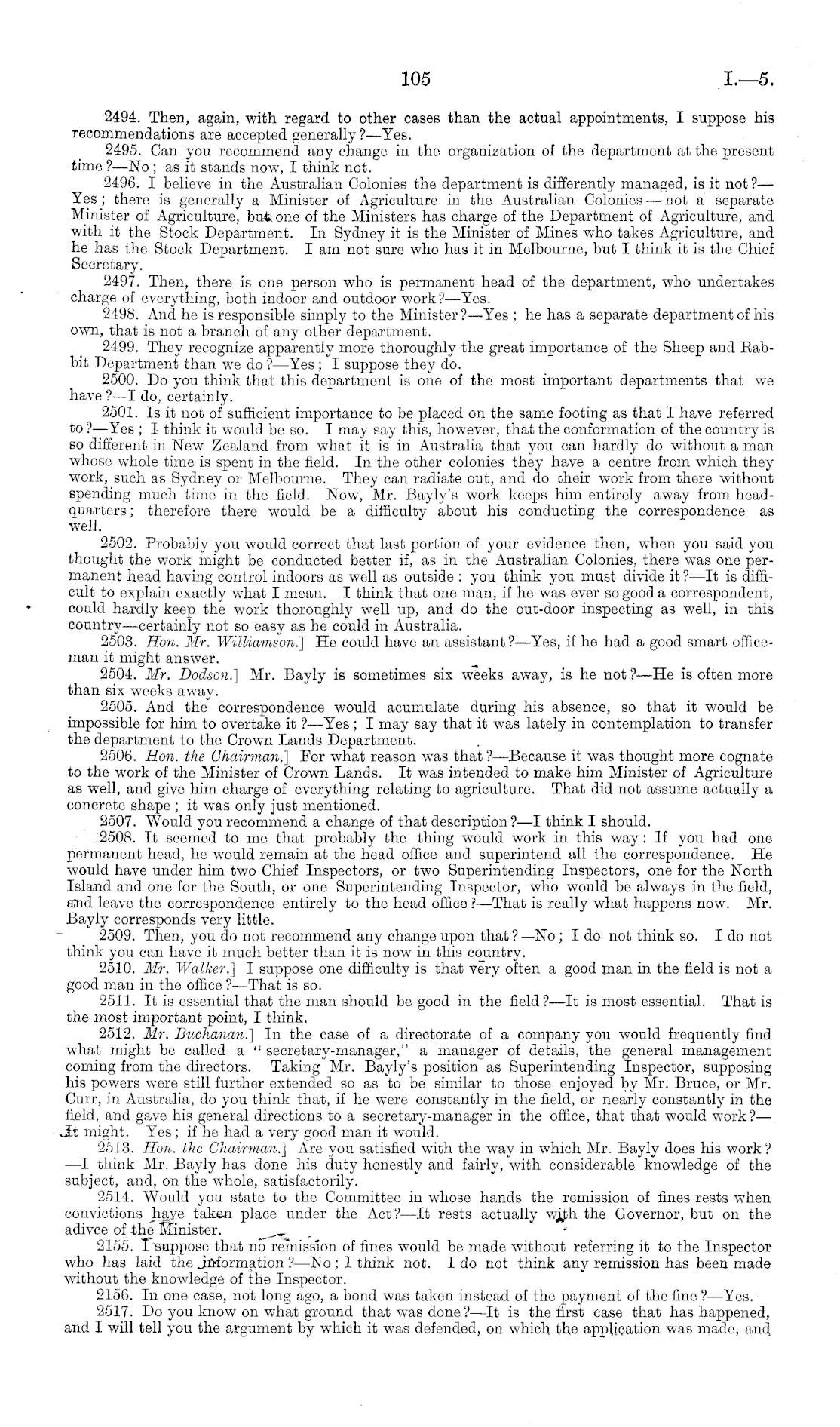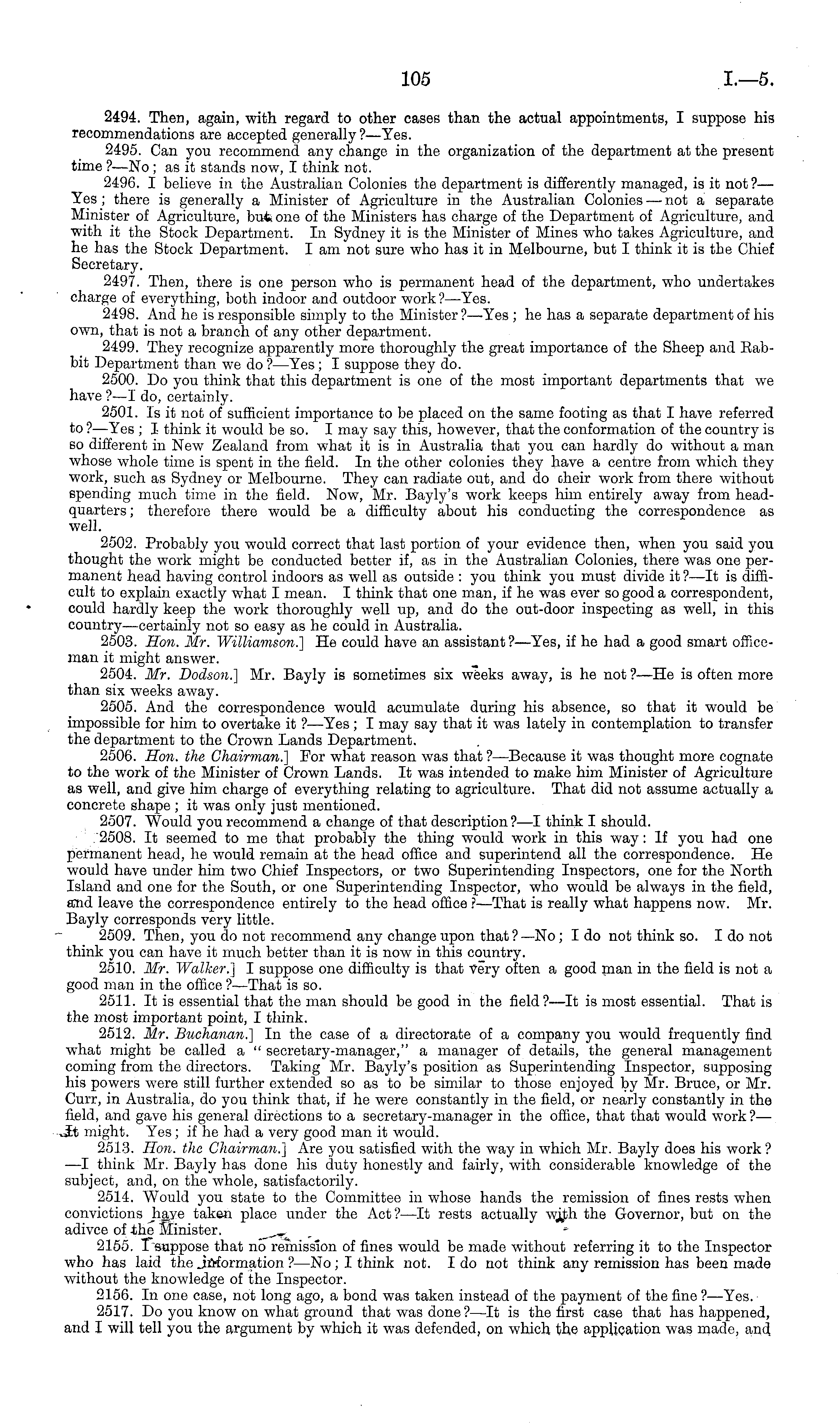 2494. Then, again, with regard to other cases than the actual appointments, I suppose his recommendations are accepted generally ?—Yes. 2495. Can you recommend any change in the organization of the department at the present time ?—No ; as it stands now, I think not. 2496. I believe in the Australian Colonies the department is differently managed, is it not?— Yes ; there is generally a Minister of Agriculture in the Australian Colonies — not a separate Minister of Agriculture, but one of the Ministers has charge of the Department of Agriculture, and with it the Stock Department. In Sydney it is the Minister of Mines who takes Agriculture, and he has the Stock Department. lam not sure who has it in Melbourne, but I think it is the Chief Secretary. 2497. Then, there is one person who is permanent head of the department, who undertakes charge of everything, both indoor and outdoor work?— Yes. 2498. And he is responsible simply to the Minister ? —Yes ; he has a separate department of his own, that is not a branch of any other department. 2499. They recognize apparently more thoroughly the great importance of the Sheep and Babbit Department than we do ?—Yes ; I suppose they do. 2500. Do you think that this department is one of the most important departments that we have ? —I do, certainly. 2501. Is it not of sufficient importance to be placed on the same footing as that I have referred to ?—Yes ; I think it would be so. I may say this, however, that the conformation of the country is so different in New Zealand from what it is in Australia that you can hardly do without a man whose whole time is spent in the field. In the other colonies they have a centre from which they work, such as Sydney or Melbourne. They can radiate out, and do cheir work from there without spending much time in the field. Now, Mr. Bayly's work keeps him entirely away from headquarters ; therefore there would be a difficulty about his conducting the correspondence as well. 2502. Probably you would correct that last portion of your evidence then, when you said you thought the work might be conducted better if, as in the Australian Colonies, there was one permanent head having control indoors as well as outside : you think you must divide it ?—lt is difficult to explain exactly what I mean. I think that one man, if he was ever so good a correspondent, could hardly keep the work thoroughly well up, and do the out-door inspecting as well, in this country—certainly not so easy as he could in Australia. 2503. Hon. Mr. Williamson.) He could have an assistant? —Yes, if he had a good smart officeman it might answer. 2504. Mr. Dodson.) Mr. Bayly is sometimes six weeks away, is he not? —He is often more than six weeks away. 2505. And the correspondence would acumulate during his absence, so that it would be impossible for him to overtake it ?—Yes ; I may say that it was lately in contemplation to transfer the department to the Crown Lands Department. 2506. Hon. the Chairman.) For what reason was that ?—Because it was thought more cognate to the work of the Minister of Crown Lands. It was intended to make him Minister of Agriculture as well, and give him charge of everything relating to agriculture. That did not assume actually a concrete shape ; it was only just mentioned. 2507. Would you recommend a change of that description?—l think I should. 2508. It seemed to me that probably the thing would work in this way: If you had one permanent head, he would remain at the head office and superintend all the correspondence. He would have under him two Chief Inspectors, or two Superintending Inspectors, one for the North Island and one for the South, or one Superintending Inspector, who would be always in the field, and leave the correspondence entirely to the head office ?—That is really what happens now. Mr. Bayly corresponds very little. 2509. Then, you do not recommend any change upon that ? —No; Ido not think so. Ido not think you can have it much better than it is now in this country. 2510. Mr. Walker.) I suppose one difficulty is that very often a good man in the field is not a good man in the office ?—That is so. 2511. It is essential that the man should be good in the field?—lt is most essential. That is the most important point, I think. 2512. Mr. Buchanan.) In the case of a directorate of a company you would frequently find what might be called a " secretary-manager," a manager of details, the general management coming from the directors. Taking Mr. Bayly's position as Superintending Inspector, supposing his powers were still further extended so as to be similar to those enjoyed by Mr. Bruce, or Mr. Curr, in Australia, do you think that, if he were constantly in the field, or nearly constantly in the field, and gave his general directions to a secretary-manager in the office, that that would work ?— H% might. Yes ; if he had a very good man it would. 2513. Hon. the Chairman.) Are you satisfied with the way in which Mr. Bayly does his work? —I think Mr. Bayly has done his duty honestly and fairly, with considerable knowledge of the subject, and, on the whole, satisfactorily. 2514. Would you state to the Committee in whose hands the remission of fines rests when convictions have taken place under the Act? —It rests actually wi,th the Governor, but on the adivce of the Minister. 2155. I suppose that no remission of fines would be made without referring it to the Inspector who has laid the .information? —No; I think not. Ido not think any remission has been made without the knowledge of the Inspector. 2156. In one case, not long ago, a bond was taken instead of the payment of the fine ? —Yes. 2517. Do you know on what ground that was done?—lt is the first case that has happened, and I will tell you the argument by which it was defended, on which the application was made, and;