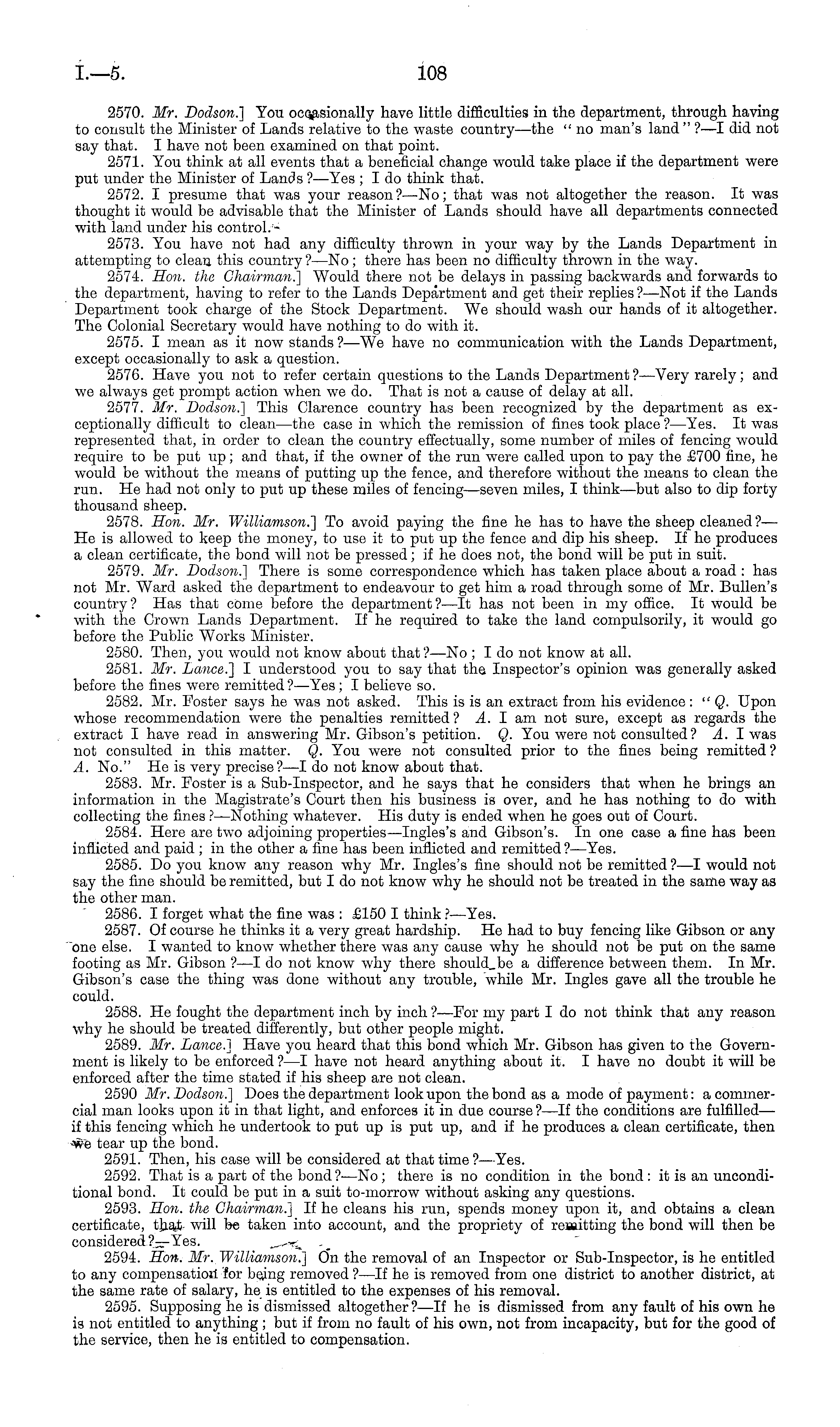 2570. Mr. Dodson.) You occasionally have little difficulties in the department, through having to consult the Minister of Lands relative to the waste country—the "no man's land " ?—I did not say that. I have not been examined on that point. 2571. You think at all events that a beneficial change would take place if the department were put under the Minister of Lands ?—Yes ; I do think that. 2572. I presume that was your reason?—No; that was not altogether the reason. It was thought it would be advisable that the Minister of Lands should have all departments connected with land under his control. 2573. You have not had any difficulty thrown in your way by the Lands Department in attempting to clean this country ? —No; there has been no difficulty thrown in the way. 2574. Hon. the Chairman.) Would there not be delays in passing backwards and forwards to the department, having to refer to the Lands Department and get their replies ?—Not if the Lands Department took charge of the Stock Department. We should wash our hands of it altogether. The Colonial Secretary would have nothing to do with it. 2575. I mean as it now stands ? —We have no communication with the Lands Department, except occasionally to ask a question. 2576. Have you not to refer certain questions to the Lands Department ? —Very rarely; and we always get prompt action when we do. That is not a cause of delay at all. 2577. Mr. Dodson.] This Clarence country has been recognized by the department as exceptionally difficult to clean—the case in which the remission of fines took place ?—Yes. It was represented that, in order to clean the country effectually, some number of miles of fencing would require to be put up; and that, if the owner of the run were called upon to pay the £700 fine, he would be without the means of putting up the fence, and therefore without the means to clean the run. He had not only to put up these miles of fencing—seven miles, I think—but also to dip forty thousand sheep. 2578. Hon. Mr. Williamson.) To avoid paying the fine he has to have the sheep cleaned?— He is allowed to keep the money, to use it to put up the fence and dip his sheep. If he produces a clean certificate, the bond will not be pressed; if he does not, the bond will be put in suit. 2579. Mr. Dodson.) There is some correspondence which has taken place about a road : has not Mr. Ward asked the department to endeavour to get him a road through some of Mr. Bullen's country? Has that come before the department?—lt has not been in my office. It would be with the Crown Lands Department. If he required to take the land compulsorily, it would go before the Public Works Minister. 2580. Then, you would not know about that ? —No ; I do not know at all. 2581. Mr. Lance!) I understood you to say that the Inspector's opinion was generally asked before the fines were remitted?— Yes; I believe so. 2582. Mr. Foster says he was not asked. This is is an extract from his evidence :" Q. Upon whose recommendation were the penalties remitted? A. I am not sure, except as regards the extract I have read in answering Mr. Gibson's petition. Q. You were not consulted? A. I was not consulted in this matter. Q. You were not consulted prior to the fines being remitted ? A. No." He is very precise?—l do not know about that. 2583. Mr. Foster is a Sub-Inspector, and he says that he considers that when he brings an information in the Magistrate's Court then his business is over, and he has nothing to do with collecting the fines ? —Nothing whatever. His duty is ended when he goes out of Court. 2584. Here are two adjoining properties—lngles's and Gibson's. In one case a fine has been inflicted and paid ; in the other a fine has been inflicted and remitted? —Yes. 2585. Do you know any reason why Mr. Ingles's fine should not be remitted ?—I would not say the fine should be remitted, but I do not know why he should not be treated in the same way as the other man. 2586. I forget what the fine was : £150 I think ?—Yes. 2587. Of course he thinks it a very great hardship. He had to buy fencing like Gibson or any one else. I wanted to know whether there was any cause why he should not be put on the same footing as Mr. Gibson ?—I do not know why there should be a difference betw-een them. In Mr. Gibson's case the thing was done without any trouble, while Mr. Ingles gave all the trouble he could. 2588. He fought the department inch by inch ?—For my part I do not think that any reason why he should be treated differently, but other people might. 2589. Mr. Lance.) Have you heard that this bond which Mr. Gibson has given to the Government is likely to be enforced ? —I have not heard anything about it. I have no doubt it will be enforced after the time stated if his sheep are not clean. 2590 Mr. Dodson.) Does the department look upon the bond as a mode of payment: a commercial man looks upon it in that light, and enforces it in due course ?—lf the conditions are fulfilled— if this fencing which he undertook to put up is put up, and if he produces a clean certificate, then we tear up the bond. 2591. Then, his case will be considered at that time ?—Yes. 2592. That is a part of the bond?-—No ; there is no condition in the bond :itis an unconditional bond. It could be put in a suit to-morrow without asking any questions. 2593. Hon. the Chairman.] If he cleans his run, spends money upon it, and obtains a clean certificate, that will be taken into account, and the propriety of remitting the bond will then be considered ?—Yes. 2594. Hon. Mr. Williamson.] On the removal of an Inspector or Sub-Inspector, is he entitled to any compensation for being removed ?—lf he is removed from one district to another district, at the same rate of salary, he is entitled to the expenses of his removal. 2595. Supposing he is dismissed altogether?—lf he is dismissed from any fault of his own he is not entitled to anything; but if from no fault of his o