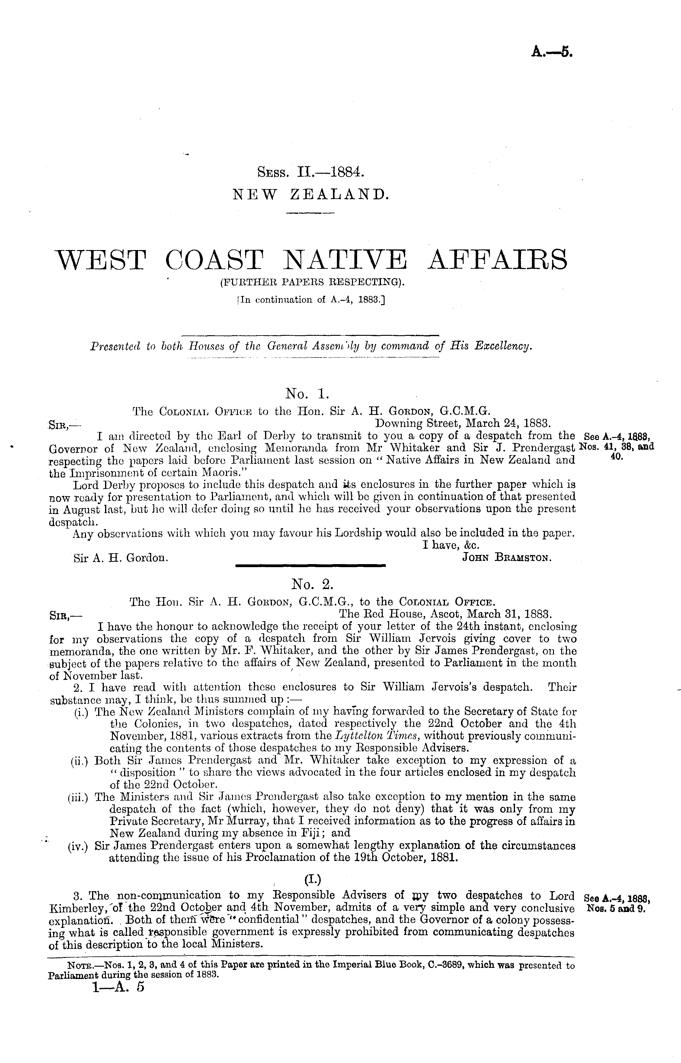 No. 2. Tho Hon. Sir A. H. Gokdon, G.C.M.G., to the Colonial Office. Sir, — The Eed House, Ascot, March 31, 1883. I have the honour to acknowledge the receipt of your letter of the 24th instant, enclosing for my observations the copy of a despatch from Sir William Jervois giving cover to two memoranda, the one written by Mr. F. Whitaker, and the other by Sir James Prendorgast, on the subject of the papers relative to the affairs of New Zealand, presented to Parliament in the month of November last. 2. I have read with attention those enclosures to Sir William Jervois's despatch. Their substance may, I think, be thus summed up : — (i.) The New Zealand Ministers complain of my having forwarded to tho Secretary of State for the Colonies, in two despatches, dated respectively the 22nd October and the 4th November, 1881, various extracts from the Lyttelton Times, without previously communicating the contents of those despatches to my Eesponsible Advisers. (ii.) Both Sir James Prendergast and Mr. Whitaker take exception to my expression of a " disposition " to share the views advocated in the four articles enclosed in my despatch of the 22nd October. (iii.) The Ministers and Sir James Prendergast also take exception to my mention in the same despatch of the fact (which, however, they do not deny) that it was only from my Private Secretary, Mr Murray, that I received information as to the progress of affairs in New Zealand during my absence in Fiji; and (iv.) Sir James Prendergast enters upon a somewhat lengthy explanation of the circumstances attending the issue of his Proclamation of the 19th October, 1881. 3. The non-conynunication to my Eesponsible Advisers of my two despatches to Lord Kimberley, of the 22nd October and 4th November, admits of a very simple and very conclusive explanation. Both of them w&re "confidential" despatches, and the Governor of a colony possessing what is called responsible government is expressly prohibited from communicating despatches of this description to the local Ministers.