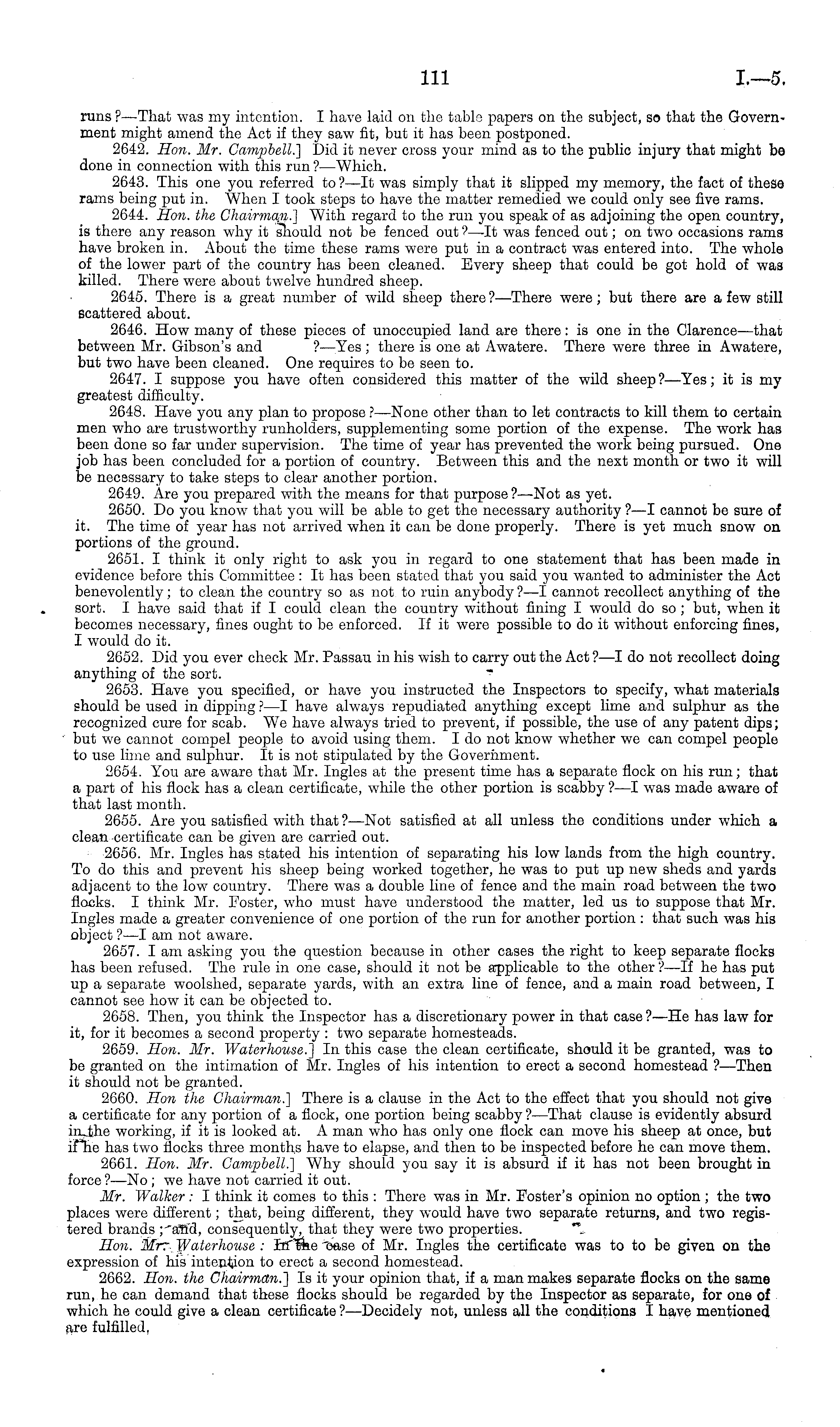 runs ?—That was my intention. I have laid on the table papers on the subject, so that the Government might amend the Act if they saw fit, but it has been postponed. 2642. Hon. Mr. Campbell.) Did it never cross your mind as to the public injury that might be done in connection with this run ?—Which. 2643. This one you referred to ? —lt was simply that it slipped my memory, the fact of these rams being put in. When I took steps to have the matter remedied wo could only see five rams. 2644. Hon. the Chairman.] With regard to the run you speak of as adjoining the open country, is there any reason why it should not be fenced out ?—-It was fenced out; on two occasions rams have broken in. About the time these rams were put in a contract was entered into. The whole of the lower part of the country has been cleaned. Every sheep that could be got hold of was killed. There were about twelve hundred sheep. 2645. There is a great number of wild sheep there?— There were; but there are a few still scattered about. 2646. How many of these pieces of unoccupied land are there: is one in the Clarence —that between Mr. Gibson's and ?—Yes ; there is one at Awatere. There were three in Awatere, but two have been cleaned. One requires to be seen to. 2647. I suppose you have often considered this matter of the wild sheep?— Yes; it is my greatest difficulty. 2648. Have you any plan to propose ?—None other than to let contracts to kill them to certain men who are trustworthy runholders, supplementing some portion of the expense. The work has been done so far under supervision. The time of year has prevented the work being pursued. One job has been concluded for a portion of country. Between this and the next month or two it will be necsssary to take steps to clear another portion. 2649. Are you prepared with the means for that purpose ?—Not as yet. 2650. Do you know that you will be able to get the necessary authority ? —I cannot be sure of it. The time of year has not arrived when it can be done properly. There is yet much snow on portions of the ground. 2651. I think it only right to ask you in regard to one statement that has been made in evidence before this Committee : It has been stated that you said you wanted to administer the Act benevolently; to clean the country so as not to ruin anybody ? —I cannot recollect anything of the sort. I have said that if I could clean the country without fining I would do so ; but, when it becomes necessary, fines ought to be enforced. If it were possible to do it without enforcing fines, I would do it. 2652. Did you ever check Mr. Passau in his wish to carry out the Act ? —I do not recollect doing anything of the sort. 2653. Have you specified, or have you instructed the Inspectors to specify, what materials should be used in dipping ? —I have always repudiated anything except lime and sulphur as the recognized cure for scab. We have always tried to prevent, if possible, the use of any patent dips; but we cannot compel people to avoid using them. Ido not know whether we can compel people to use lime and sulphur. It is not stipulated by the Government. 2654. You are aware that Mr. Ingles at the present time has a separate flock on his run; that a part of his flock has a clean certificate, while the other portion is scabby ? —I w-as made aware of that last month. 2655. Are you satisfied with that ? —Not satisfied at all unless the conditions under which a clean certificate can be given are carried out. 2656. Mr. Ingles has stated his intention of separating his low lands from the high country. To do this and prevent his sheep being worked together, he was to put up new sheds and yards adjacent to the low country. There was a double line of fence and the main road between the two flocks. I think Mr. Foster, who must have understood the matter, led us to suppose that Mr. Ingles made a greater convenience of one portion of the run for another portion : that such was his object ? —I am not aware. 2657. I am asking you the question because in other eases the right to keep separate flocks has been refused. The rule in one case, should it not be applicable to the other ?—lf he has put up a separate woolshed, separate yards, with an extra line of fence, and a main road between, I cannot see how it can be objected to. 2658. Then, you think the Inspector has a discretionary power in that case?—He has law for it, for it becomes a second property : two separate homesteads. 2659. Hon. Mr. Waterhouse.) In this case the clean certificate, should it be granted, was to be granted on the intimation of Mr. Ingles of his intention to erect a second homestead ?—Then it should not be granted. 2660. Hon the Chairman.] There is a clause in the Act to the effect that you should not give a certificate for any portion of a flock, one portion being scabby ? —That clause is evidently absurd in the working, if it is looked at. A man who has only one flock can move his sheep at once, but if he has two flocks three months have to elapse, and then to be inspected before he can move them. 2661. Hon. Mr. Campbell.] Why should you say it is absurd if it has not been brought in force ?—No ; we have not carried it out. Mr. Walker : I think it comes to this : There was in Mr. Foster's opinion no option ; the two places were different; that, being different, they would have two separate returns, and two registered brands ; and, consequently, that they were two properties. Hon. Mr. Waterhouse : In "the "ease of Mr. Ingles the certificate was to to be given on the expression of his intention to erect a second homestead. 2662. Hon. the Chairman.) Is it your opinion that, if a man makes separate flocks on the same run, he can demand that these flocks should be regarded by the Inspector as separate, for one of which he could give a clean certificate ?—Decidely not, unless all the conditions I have mentioned are fulfilled.