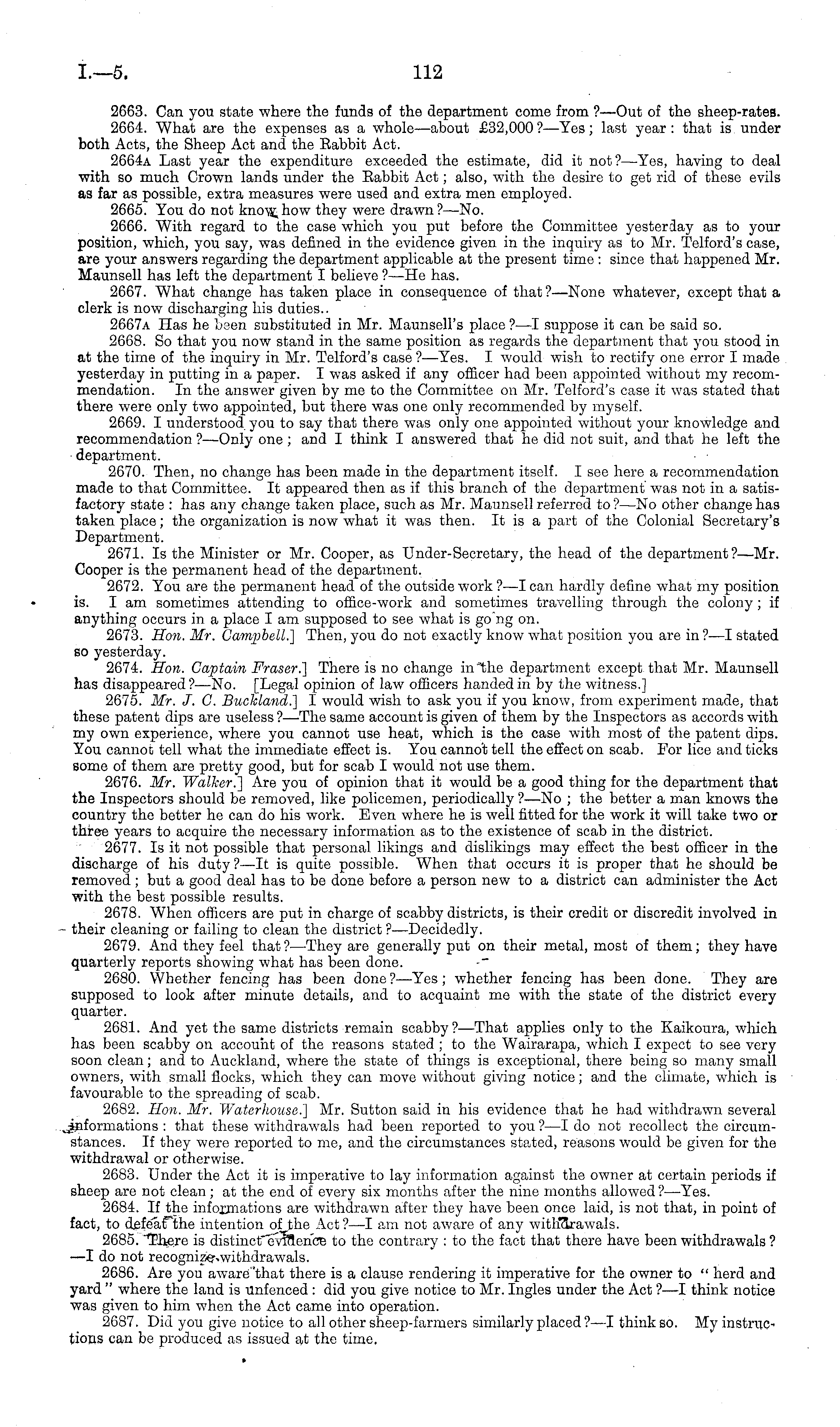 2663. Can you state where the funds of the department come from ?—Out of the sheep-rates. 2664. What are the expenses as a whole —about £32,000 ? —Yes; last year : that is under both Acts, the Sheep Act and the Rabbit Act. 2664 a Last year the expenditure exceeded the estimate, did it not ?—Yes, having to deal with so much Crown lands under the Rabbit Act; also, with the desire to get rid of these evils as far as possible, extra measures were used and extra men employed. 2665. You do not know, how they were drawn? —No. 2666. With regard to the case which you put before the Committee yesterday as to your position, which, you say, was defined in the evidence given in the inquiry as to Mr. Telford's case, are your answers regarding the department applicable at the present time : since that happened Mr. Maunsell has left the department I believe ?—He has. 2667. What change has taken place in consequence of that?— None whatever, except that a clerk is now discharging his duties.. 2667 a Has he been substituted in Mr. Maunsell's place ? —I suppose it can be said so. 2668. So that you now stand in the same position as regards the department that you stood in at the time of the inquiry in Mr. Telford's case ?—Yes. I would wish to rectify one error I made yesterday in putting in a paper. I was asked if any officer had been appointed without my recommendation. In the answer given by me to the Committee on Mr. Telford's case it was stated that there were only two appointed, but there was one only recommended by myself. 2669. I understood you to say that there was only one appointed without your knowledge and recommendation ? —Only one ; and I think I answered that he did not suit, and that he left the department. 2670. Then, no change has been made in the department itself. I see here a recommendation made to that Committee. It appeared then as if this branch of the department was not in a satisfactory state : has any change taken place, such as Mr. Maunsell referred to ?—No other change has taken place; the organization is now what it was then. It is a part of the Colonial Secretary's Department. 2671. Is the Minister or Mr. Cooper, as Under-Secretary, the head of the department ?—Mr. Cooper is the permanent head of the department. 2672. You are the permanent head of the outside work ?—I can hardly define what my position is. lam sometimes attending to office-work and sometimes travelling through the colony; if anything occurs in a place I am supposed to see what is gong on. 2673. Hon. Mr. Campbell.] Then, you do not exactly know w-hat position you are in?—l stated so yesterday. 2674. Hon. Captain Fraser.] There is no change in "the department except that Mr. Maunsell has disappeared? —No. [Legal opinion of law officers handed in by the witness.] 2675. Mr. J. C. Buckland.) I would wish to ask you if you know, from experiment made, that these patent dips are useless ?—The same account is given of them by the Inspectors as accords with my own experience, where you cannot use heat, which is the case with most of the patent dips. You cannot tell what the immediate effect is. You cannot tell the effect on scab. For lice and ticks some of them are pretty good, but for scab I would not use them. 2676. Mr. Walker!) Are you of opinion that it would be a good tiling for the department that the Inspectors should be removed, like policemen, periodically ?—No ; the better a man knows the country the better he can do his work. Even where he is well fitted for the work it will take two or three years to acquire the necessary information as to the existence of scab in the district. 2677. Is it not possible that personal likings and dislikings may effect the best officer in the discharge of his duty?—lt is quite possible. When that occurs it is proper that he should be removed ; but a good deal has to be done before a person new to a district can administer the Act with the best possible results. 2678. When officers are put in charge of scabby districts, is their credit or discredit involved in their cleaning or failing to clean the district ? —Decidedly. 2679. And they feel that ? —They are generally put on their metal, most of them; they have quarterly reports showing what has been done. 2680. Whether fencing has been done ? —Yes ; whether fencing has been done. They are supposed to look after minute details, and to acquaint me with the state of the district every quarter. 2681. And yet the same districts remain scabby?— That applies only to the Kaikoura, which has been scabby on account of the reasons stated ; to the Wairarapa, which I expect to see very soon clean; and to Auckland, where the state of things is exceptional, there being so many small owners, with small flocks, which they can move without giving notice; and the climate, which is favourable to the spreading of scab. 2682. Hon. Mr. Waterhouse.) Mr. Sutton said in his evidence that he had withdrawn several informations : that those withdrawals had been reported to you ? —I do not recollect the circumstances. If they were reported to me, and the circumstances stated, reasons would be given for the withdrawal or otherwise. 2683. Under the Act it is imperative to lay information against the owner at certain periods if sheep are not clean ; at the end of every six months after the nine months allowed ? —Yes. 2684. If the informations are withdrawn after they have been once laid, is not that, in point of fact, to defeat the intention of the Act ?—I am not aware of any withdrawals. 2685. There is distinct'evidence to the contrary : to the fact that there have been withdrawals ? —I do not recognize.withdrawals. 2686. Are you aware that there is a clause rendering it imperative for the owner to " herd and yard " where the land is unfenced : did you give notice to Mr. Ingles under the Act ?—I think notice was given to him when the Act came into operation. 2687. Did you give notice to all other sheep-farm