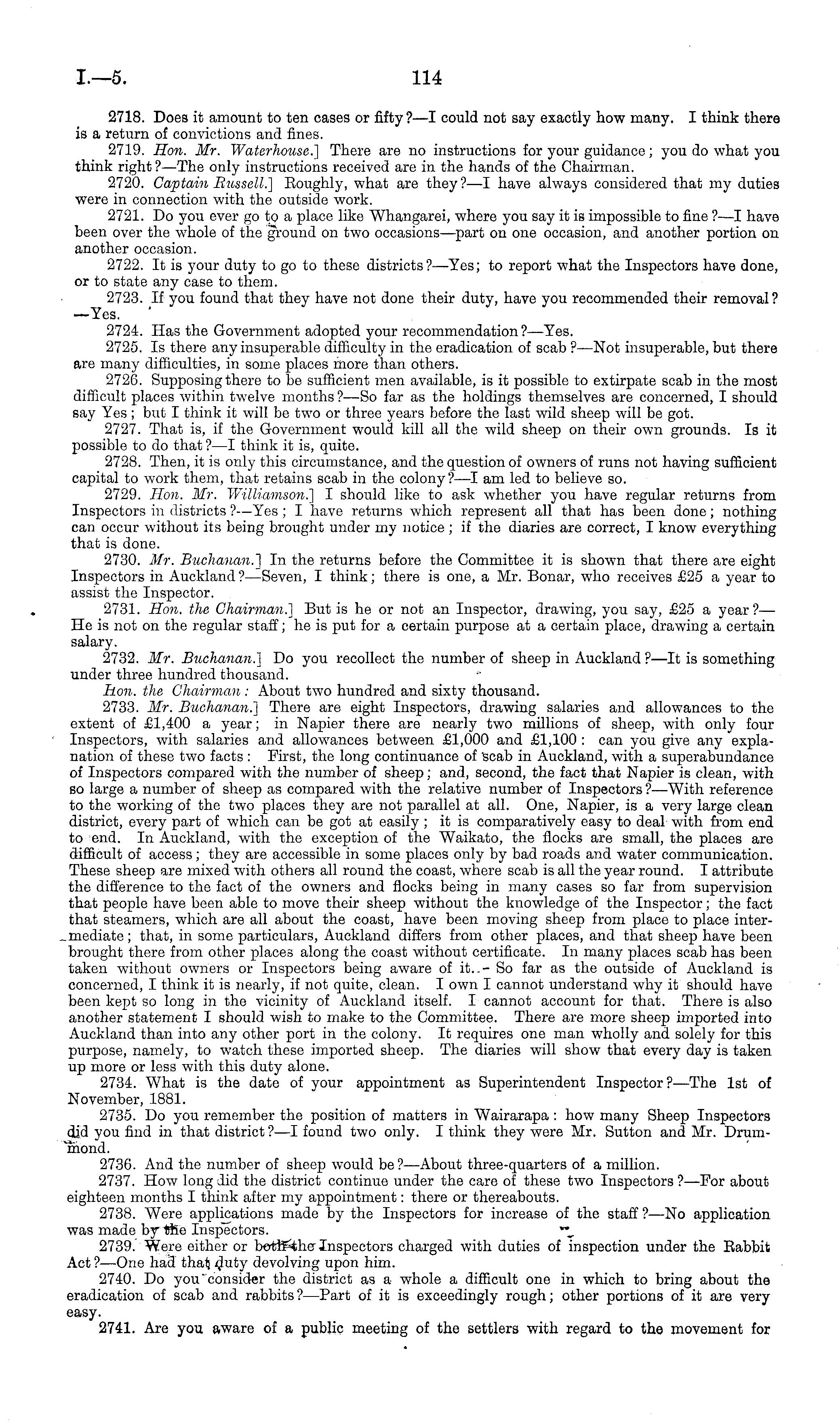 2718. Does it amount to ten cases or fifty?—l could not say exactly how many. I think there is a return of convictions and fines. 2719. Hon. Mr. Waterhouse.) There are no instructions for your guidance; you do what you think right ?—The only instructions received are in the hands of the Chairman. 2720. Captain Bussed.] Boughly, what are they?—l have always considered that my duties were in connection with the outside work. 2721. Do you ever go to a place like Whangarei, where you say it is impossible to fine ?—I have been over the whole of the g"round on two occasions—part on one occasion, and another portion on another occasion. 2722. It is your duty to go to these districts?— Yes; to report what the Inspectors have done, or to state any case to them. 2723. If you found that they have not done their duty, have you recommended their removal? —Yes. 2724. Has the Government adopted your recommendation? —Yes. 2725. Is there any insuperable difficulty in the eradication of scab ?—Not insuperable, but there are many difficulties, in some places more than others. 2726. Supposing there to be sufficient men available, is it possible to extirpate scab in the most difficult places within twelve months ?—So far as the holdings themselves are concerned, I should say Yes; but I think it will be two or three years before the last wild sheep will be got. 2727. That is, if the Government would kill all the wild sheep on their own grounds. Is it possible to do that ?—I think it is, quite. 2728. Then, it is only this circumstance, and the question of owners of runs not having sufficient capital to work them, that retains scab in the colony?—I am led to believe so. 2729. Hon. Mr. Williamson.) I should like to ask whether you have regular returns from Inspectors in districts ?—Yes ; I have returns which represent all that has been done; nothing can occur without its being brought under my notice ; if the diaries are correct, I know everything that is done. 2730. Mr. Buchanan.) In the returns before the Committee it is shown that there are eight Inspectors in Auckland? —Seven, I think; there is one, a Mr. Bonar, who receives £25 a year to assist the Inspector. 2731. Hon. the Chairman.) But is he or not an Inspector, drawing, you say, £25 a year?— He is not on tho regular staff; he is put for a certain purpose at a certain place, drawing a certain salary. 2732. Mr. Buchanan.) Do you recollect the number of sheep in Auckland ?—lt is something under three hundred thousand. Hon. the Chairman : About two hundred and sixty thousand. 2733. Mr. Buchanan.) There are eight Inspectors, drawing salaries and allowances to the extent of £1,400 a year; in Napier there are nearly two millions of sheep, with only four Inspectors, w-ith salaries and allowances between £1,000 and £1,100 : can you give any explanation of these two facts : First, the long continuance of scab in Auckland, with a superabundance of Inspectors compared with the number of sheep; and, second, the fact that Napier is clean, with so large a number of sheep as compared with the relative number of Inspectors ?—With reference to the working of the two places they are not parallel at all. One, Napier, is a very large clean district, every part of which can be got at easily ; it is comparatively easy to deal with from end to end. In Auckland, with the exception of the Waikato, the flocks are small, the places are difficult of access; they are accessible in some places only by bad roads and Water communication. These sheep are mixed with others all round the coast, where scab is all the year round. I attribute the difference to the fact of the owners and flocks being in many cases so far from supervision that people have been able to move their sheep without the knowledge of the Inspector; the fact that steamers, which are all about the coast, have been moving sheep from place to place intermediate ; that, in some particulars, Auckland differs from other places, and that sheep have been brought there from other places along the coast without certificate. In many places scab has been taken without owners or Inspectors being aware of it.- So far as the outside of Auckland is concerned, I think it is nearly, if not quite, clean. I own I cannot understand why it should have been kept so long in the vicinity of Auckland itself. I cannot account for that. There is also another statement I should wish to make to the Committee. There are more sheep imported into Auckland than into any other port in the colony. It requires one man wholly and solely for this purpose, namely, to watch these imported sheep. The diaries will show that every day is taken up more or less with this duty alone. 2734. What is the date of your appointment as Superintendent Inspector?— The Ist of November, 1881. 2735. Do you remember the position of matters in Wairarapa : how many Sheep Inspectors did you find in that district ?—I found two only. I think they were Mr. Sutton and Mr. Drummond. 2736. And the number of sheep would be?— About three-quarters of a million. 2737. How long did the district continue under the care of these two Inspectors?— For about eighteen months I think after my appointment: there or thereabouts. 2738. Were applications made by the Inspectors for increase of the staff ?—No application was made by the Inspectors. *\ 2739. Were either or both the Inspectors charged with duties of inspection under the Babbit Act ?—One had that duty devolving upon him. 2740. Do you consider the district as a whole a difficult one in which to bring about the eradication of scab and rabbits ? —Part of it is exceedingly rough; other portions of it are very easy. 2741. Are you aware of a public meeting of the settlers with regard to the movement for