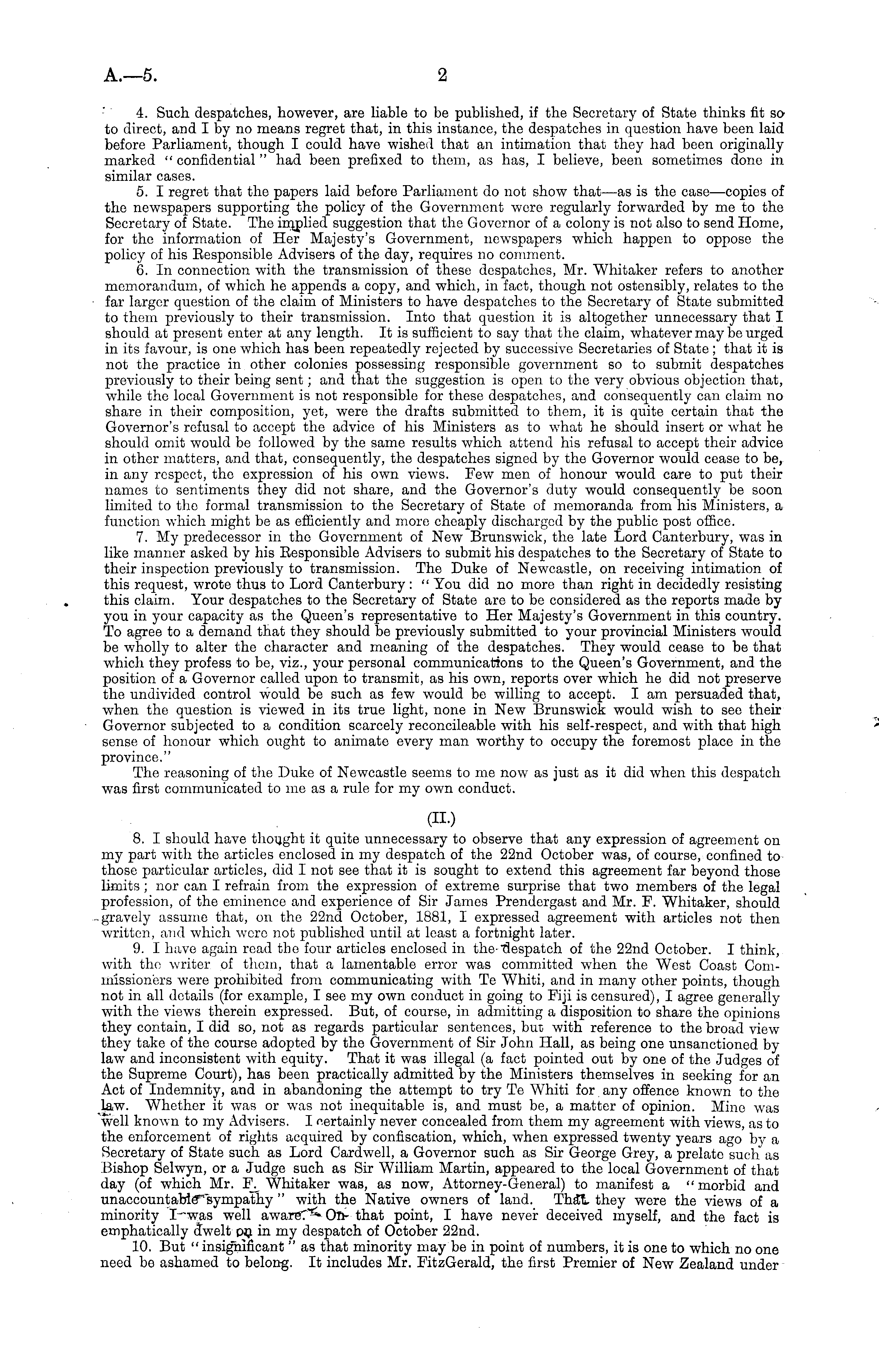 4. Such despatches, however, are liable to be published, if the Secretary of State thinks fit so to direct, and I by no means regret that, in this instance, the despatches in question have been laid before Parliament, though I could have wished that an intimation that they had been originally marked " confidential " had been prefixed to them, as has, I believe, been sometimes done in similar cases. 5. I regret that the papers laid before Parliament do not show that—as is the case—copies of the newspapers supporting the policy of the Government were regularly forwarded by me to the Secretary of State. The implied suggestion that the Governor of a colony is not also to send Home, for the information of Her Majesty's Government, newspapers which happen to oppose the policy of his Eesponsible Advisers of the day, requires no comment. 6. In connection with the transmission of these despatches, Mr. Whitaker refers to another memorandum, of which he appends a copy, and which, in fact, though not ostensibly, relates to the far larger question of the claim of Ministers to have despatches to the Secretary of State submitted to them previously to their transmission. Into that question it is altogether unnecessary that I should at present enter at any length. It is sufficient to say that the claim, whatever may be urged in its favour, is one which has been repeatedly rejected by successive Secretaries of State ; that it is not the practice in other colonies possessing responsible government so to submit despatches previously to their being sent; and that the suggestion is open to the very obvious objection that, while the local Government is not responsible for these despatches, and consequently can claim no share in their composition, yet, were the drafts submitted to them, it is quite certain that the Governor's refusal to accept the advice of his Ministers as to what he should insert or what he should omit would be followed by the same results which attend his refusal to accept their advice in other matters, and that, consequently, the despatches signed by the Governor would cease to be, ■in any respect, the expression of his own views. Few men of honour would care to put their names to sentiments they did not share, and the Governor's duty would consequently be soon limited to the formal transmission to the Secretary of State of memoranda from his Ministers, a function which might be as efficiently and more cheaply discharged by the public post office. 7. My predecessor in the Government of New Brunswick, the late Lord Canterbury, was in like manner asked by his Responsible Advisers to submit his despatches to the Secretary of State to their inspection previously to transmission. The Duke of Newcastle, on receiving intimation of this request, wrote thus to Lord Canterbury : " You did no more than right in decidedly resisting this claim. Your despatches to the Secretary of State are to be considered as the reports made by you in your capacity as the Queen's representative to Her Majesty's Government in this country. To agree to a demand that they should be previously submitted to your provincial Ministers would be wholly to alter the character and meaning of the despatches. They would cease to be that which they profess to be, viz., your personal communications to the Queen's Government, and the position of a Governor called upon to transmit, as his own, reports over which he did not preserve the undivided control would be such as few would be willing to accept. I am persuaded that, when the question is viewed in its true light, none in. New Brunswick would wish to see their Governor subjected to a condition scarcely reconcileablo with his self-respect, and with that high sense of honour which ought to animate every man worthy to occupy the foremost place in the province." The reasoning of the Duke of Newcastle seems to me now as just as it did when this despatch was first communicated to me as a rule for my own conduct. (II.) 8. I should have thought it quite unnecessary to observe that any expression of agreement on my part with the articles enclosed in my despatch of the 22nd October was, of course, confined to those particular articles, did I not see that it is sought to extend this agreement far beyond those limits ; nor can I refrain from the expression of extreme surprise that two members of the legal profession, of the eminence and experience of Sir James Prendergast and Mr. F. Whitaker, should gravely assume that, on the 22nd October, 1881, I expressed agreement with articles not then written, and which were not published until at least a fortnight later. 9. I have again read the four articles enclosed in the- 'despatch of the 22nd October. I think, with the writer of them, that a lamentable error was committed when the West Coast Commissioners were prohibited from communicating with Te Whiti, and in many other points, though not in all details (for example, I sec my own conduct in going to Fiji is censured), I agree generally with the views therein expressed. But, of course, in admitting a disposition to share the opinions they contain, I did so, not as regards particular sentences, but with reference to the broad view they take of the course adopted by the Government of Sir John Hall, as being one unsanctioned by law and inconsistent with equity. That it was illegal (a fact pointed out by one of the Judges of the Supreme Court), has been practically admitted by the Ministers themselves in seeking for an Act of Indemnity, and in abandoning the attempt to try Te Whiti for any offence known to the law. Whether it was or was not inequitable is, and must be, a matter of opinion. Mine was well known to my Advisers. I certainly never concealed from them my agreement with views, sis to the enforcement of rights acquired by confiscation, which, when expressed twenty years ago by a Secretary of State such as Lord Cardwell, a Governor such as Sir George Grey, a prelate such as Bishop Selwyn