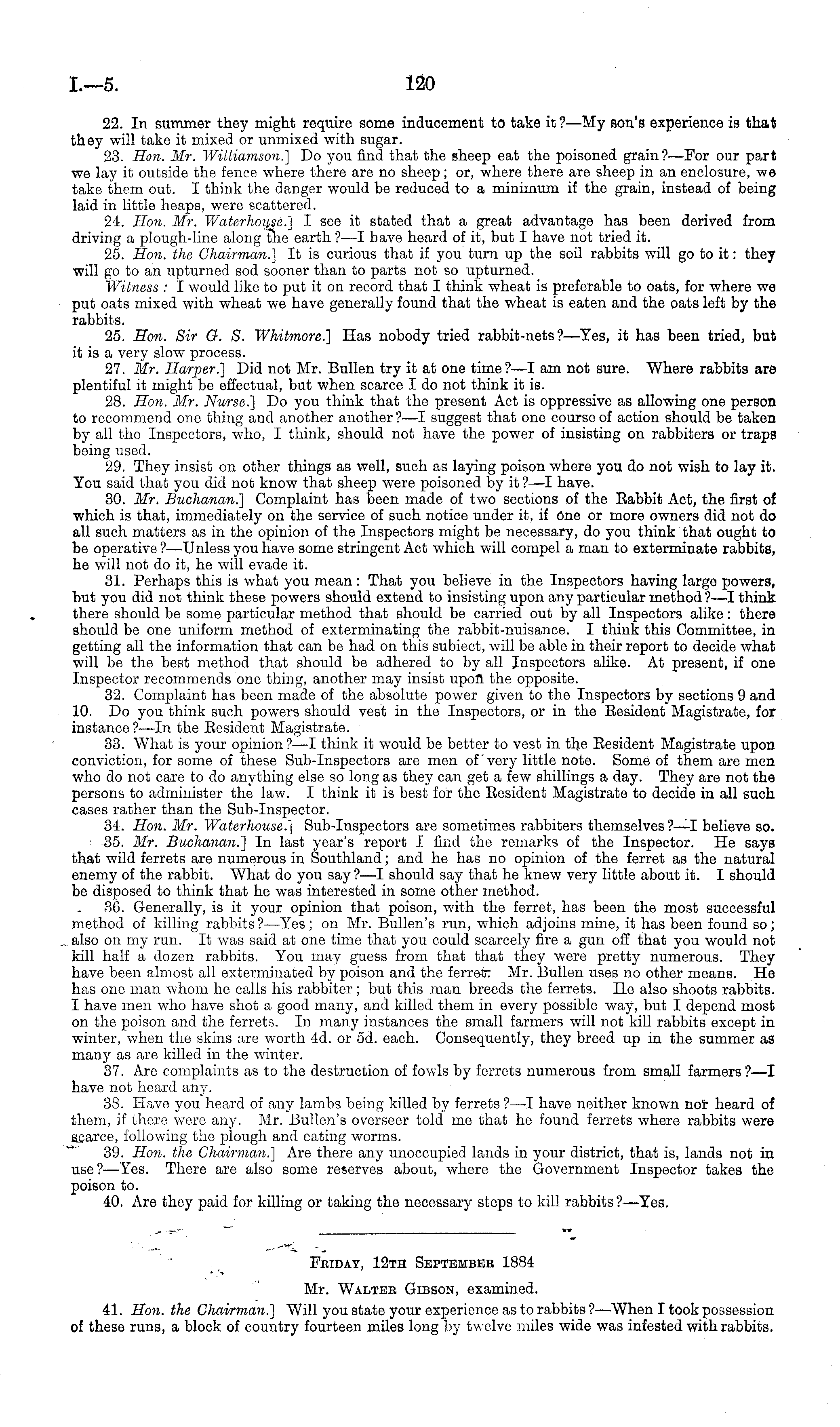 Feiday, 12th Septembee 1884 Mr. Waltee Gibson, examined. 41. Hon. the Chairman!) Will you state your experience as to rabbits ? —When I took possession of these runs, a block of country fourteen miles long by twelve miles wide was infested with rabbits.