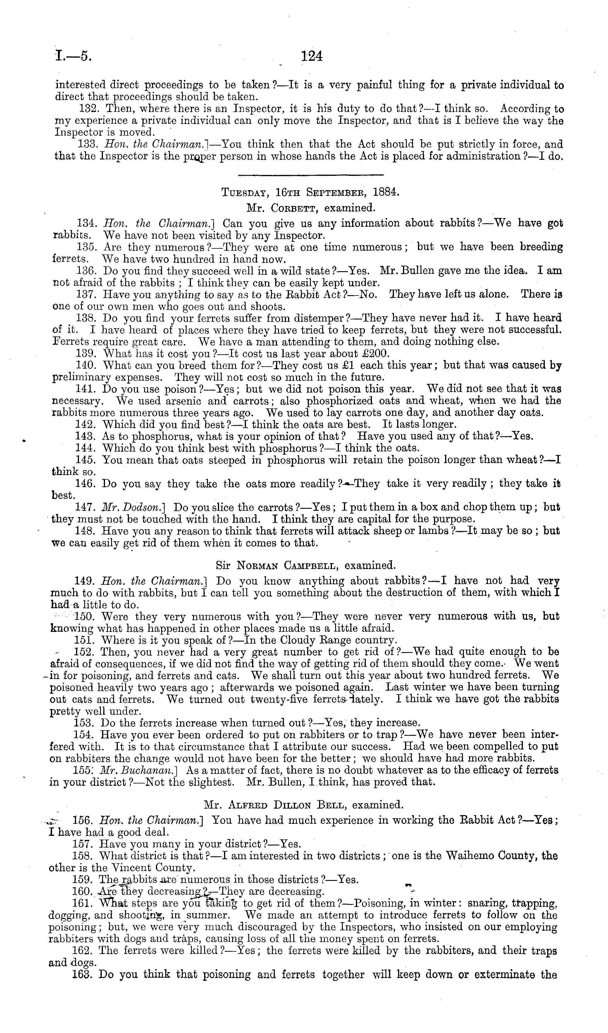 Tuesday, 16th Septembee, 1884. Mr. Coebett, examined. 134. Hon. the Chairman!) Can you give us any information about rabbits? —We have got rabbits. We have not been visited by any Inspector. 135. Are they numerous ?—They were at one time numerous; but we have been breeding ferrets. We have two hundred in hand now. 136. Do you find they succeed well in a wild state ?—Yes. Mr. Bullen gave me the idea. lam not afraid of the rabbits ; I think they can be easily kept under. 137. Have you anything to say as to the Babbit Act ?—No. They have left us alone. There is one of our own men who goes out and shoots. 138. Do you find your ferrets suffer from distemper? —They have never had it. I have heard of it. I have heard of places where they have tried to keep ferrets, but they were not successful. Ferrets require great care. We have a man attending to them, and doing nothing else. 139. What has it cost you ?—lt cost us last year about £200. 140. What can you breed them for ?—They cost us £1 each this year; but that was caused by preliminary expenses. They will not cost so much in the future. 141. Do you use poison ? —Yes; but we did not poison this year. We did not see that it was necessary. We used arsenic and carrots; also phosphorized oats and wheat, when we had the rabbits more numerous three years ago. We used to lay carrots one day, and another day oats. 142. Which did you find best? —I think the oats are best. It lasts longer. 143. As to phosphorus, what is your opinion of that? Have you used any of that?— Yes. 144. Which do you think best with phosphorus ?—I think the oats. 145. You mean that oats steeped in phosphorus will retain the poison longer than wheat ?—I think so. 146. Do you say they take the oats more readily ?-**-They take it very readily ; they take it best. 147. Mr. Dodson.) Do you slice the carrots ?—Yes; I put them in a box and chop them up; but they must not be touched with the hand. I think they are capital for the purpose. 148. Have you any reason to think that ferrets will attack sheep or lambs ?—lt may be so ; but we can easily get rid of them when it comes to that. Sir Noeman Campbell, examined. 149. Hon. the Chairman.) Do you know anything about rabbits?—l have not had very much to do with rabbits, but I can tell you something about the destruction of them, with which I had a little to do. 150. Were they very numerous with you? —They were never very numerous with us, but knowing what has happened in other places made us a little afraid. 151. Where is it you speak of ?—ln the Cloudy Bange country. — 152. Then, you never had a very great number to get rid of?—We had quite enough to be afraid of consequences, if we did not find the way of getting rid of them should they come. We went in for poisoning, and ferrets and cats. We shall turn out this year about two hundred ferrets. We poisoned heavily two years ago ; afterwards we poisoned again. Last winter we have been turning out cats and ferrets. We turned out twenty-five ferrets lately. I think we have got the rabbits pretty well under. 153. Do the ferrets increase when turned out ? —Yes, they increase. 154. Have you ever been ordered to put on rabbiters or to trap ? —We have never been interfered with. It is to that circumstance that I attribute our success. Had we been compelled to put on rabbiters the change would not have been for the better; we should have had more rabbits. 155.' Mr. Buchanan.) As a matter of fact, there is no doubt whatever as to the efficacy of ferrets in your district ? —Not the slightest. Mr. Bullen, I think, has proved that. Mr. Alfeed Dillon Bell, examined. 156. Hon. the Chairman!) You have had much experience in working the Babbit Act?— Yes; I have had a good deal. 157. Have you many in your district ?—Yes. 158. What district is that ? —I am interested in two districts ; one is the Waihemo County, the other is tho Vincent County. 159. Thejabbits are numerous in those districts ? —Yes. 160. Are they decreasing?— They are decreasing. 161. What steps are you taking* to get rid of them?— Poisoning, in winter: snaring, trapping, dogging, and shooting, in summer. We made an attempt to introduce ferrets to follow on the poisoning; but, we were very much discouraged by the Inspectors, who insisted on our employing rabbiters with dogs and traps, causing loss of all the money spent on ferrets. 162. The ferrets were killed?— Yes; the ferrets were killed by the rabbiters, and their traps and dogs. 163. Do you think that poisoning and ferrets together will keep down or exterminate the