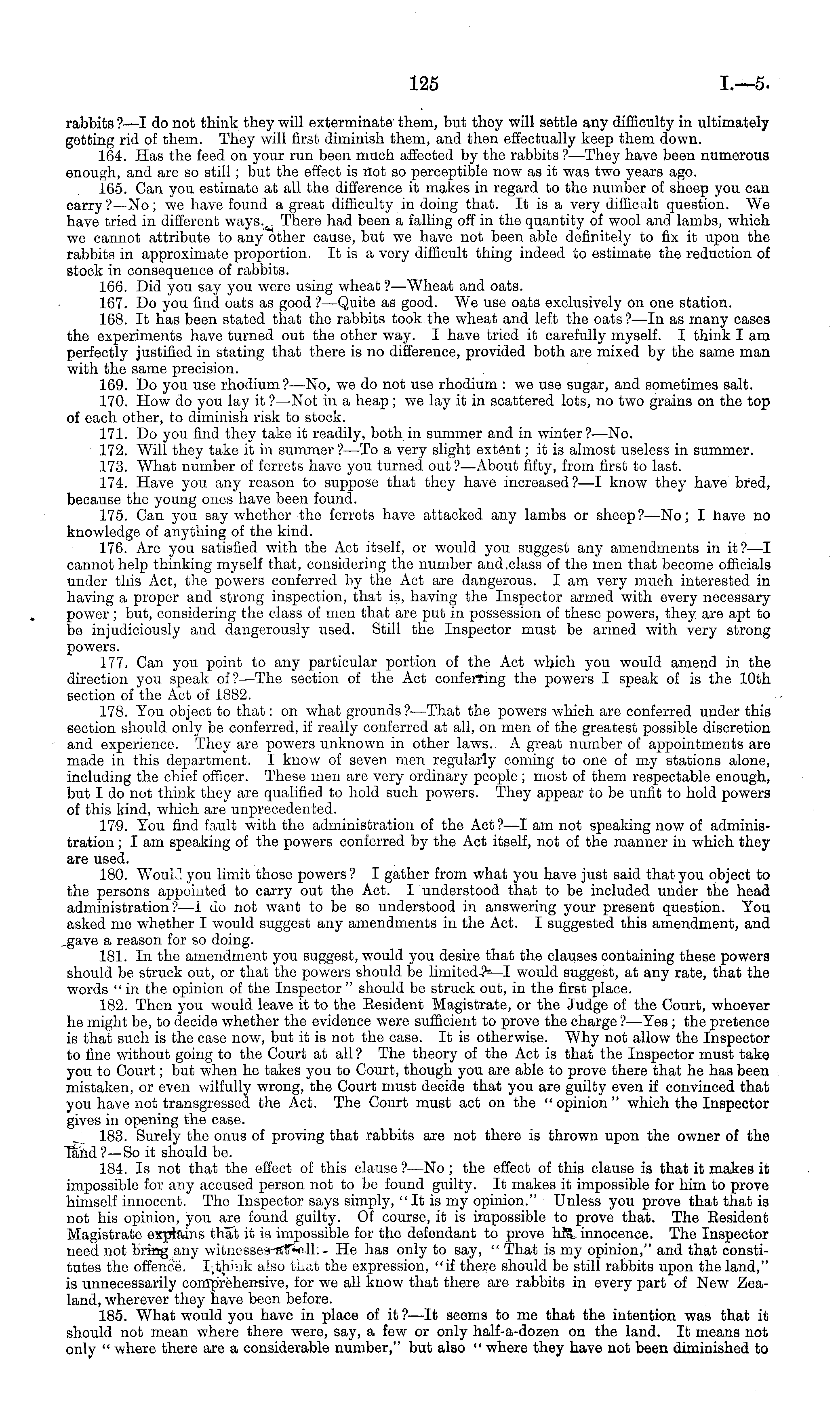 rabbits ?—I do not think they will exterminate them, but they will settle any difficulty in ultimately getting rid of them. They will first diminish them, and then effectually keep them down. 164. Has the feed on your run been much affected by tho rabbits ?—They have been numerous enough, and are so still; but the effect is not so perceptible now as it was two years ago. 165. Can you estimate at all the difference it makes in regard to the number of sheep you can carry?—No; we have found a great difficulty in doing that. It is a very difficult question. We have tried in different ways.,. There had been a falling off in the quantity of wool and lambs, which we cannot attribute to any other cause, but we have not been able definitely to fix it upon the rabbits in approximate proportion. It is a very difficult thing indeed to estimate the reduction of stock in consequence of rabbits. 166. Did you say you were using wheat ?—Wheat and oats. 167. Do you find oats as good ?—Quite as good. We use oats exclusively on one station. 168. It has been stated that the rabbits took the wheat and left the oats?—ln as many cases the experiments have turned out the other way. I have tried it carefully myself. I think lam perfectly justified in stating that there is no difference, provided both are mixed by the same man with the same precision. 169. Do you use rhodium?—No, we do not use rhodium : we use sugar, and sometimes salt. 170. How do you lay it ?—Not in a heap; we lay it in scattered lots, no two grains on the top of each other, to diminish risk to stock. 171. Do you find they take it readily, both in summer and in winter? —No. 172. Will they take it in summer ? —To a very slight extent; it is almost useless in summer. 173. What number of ferrets have you turned out?— About fifty, from first to last. 174. Have you any reason to suppose that they have increased?—l know they have bred, because the young ones have been found. 175. Can you say whether the ferrets have attacked any lambs or sheep?—No; I have no knowledge of anything of the kind. 176. Are you satisfied with the Act itself, or would you suggest any amendments in it?—l cannot help thinking myself that, considering the number and .class of the men that become officials under this Act, the powers conferred by the Act are dangerous. lam very much interested in having a proper and strong inspection, that is, having the Inspector armed with every necessary power ; but, considering the class of men that are put in possession of these powers, they are apt to be injudiciously and dangerously used. Still the Inspector must be armed with very strong powers. 177. Can you point to any particular portion of the Act which you would amend in the direction you speak of?— The section of the Act conferring the powers I speak of is the 10th section of the Act of 1882. 178. You object to that: on what grounds ? —That the powers which are conferred under this section should only be conferred, if really conferred at all, on men of the greatest possible discretion and experience. They are powers unknown in other laws. A great number of appointments are made in this department. I know of seven men regularly coming to one of my stations alone, including the chief officer. These men are very ordinary people ; most of them respectable enough, but Ido not think they are qualified to hold such powers. They appear to be unfit to hold powers of this kind, which are unprecedented. 179. You find fault with the administration of the Act?—l am not speaking now of administration ; I am speaking of the powers conferred by the Act itself, not of the manner in which they are used. 180. Would you limit those powers? I gather from what you have just said that you object to the persons appointed to carry out the Act. I understood that to be included under the head administration ?—I do not want to be so understood in answering your present question. You asked me whether I would suggest any amendments in the Act. I suggested this amendment, and gave a reason for so doing. 181. In the amendment you suggest, would you desire that the clauses containing these powers should be struck out, or that the powers should be limited-?*-— I would suggest, at any rate, that the words " in the opinion of the Inspector " should be struck out, in the first place. 182. Then you would leave it to the Besident Magistrate, or the Judge of the Court, whoever he might be, to decide whether the evidence were sufficient to prove the charge ?—Yes ; the pretence is that such is the case now, but it is not the case. It is otherwise. Why not allow the Inspector to fine without going to the Court at all ? The theory of the Act is that the Inspector must take you to Court; but when he takes you to Court, though you are able to prove there that he has been mistaken, or even wilfully wrong, the Court must decide that you are guilty even if convinced that you have not transgressed the Act. The Court must act on the "opinion" which the Inspector gives in opening the case. 183. Surely the onus of proving that rabbits are not there is thrown upon the owner of the land ?—So it should be. 184. Is not that the effect of this clause ?—No; the effect of this clause is that it makes it impossible for any accused person not to be found guilty. It makes it impossible for him to prove himself innocent. The Inspector says simply, "It is my opinion." Unless you prove that that is not his opinion, you are found guilty. Of course, it is impossible to prove that. The Besident Magistrate explains that it is impossible for the defendant to prove his innocence. The Inspector need not bring any witiiesses--s;F-«"'ll. - He has only to say, " That is my opinion," and that constitutes the offence. I,think also that the expression, "if there should be still rabbits upon the land," is unnecessarily comprehensive, for we all know that there are rabbits in every part of New Zealand, wherever they ha