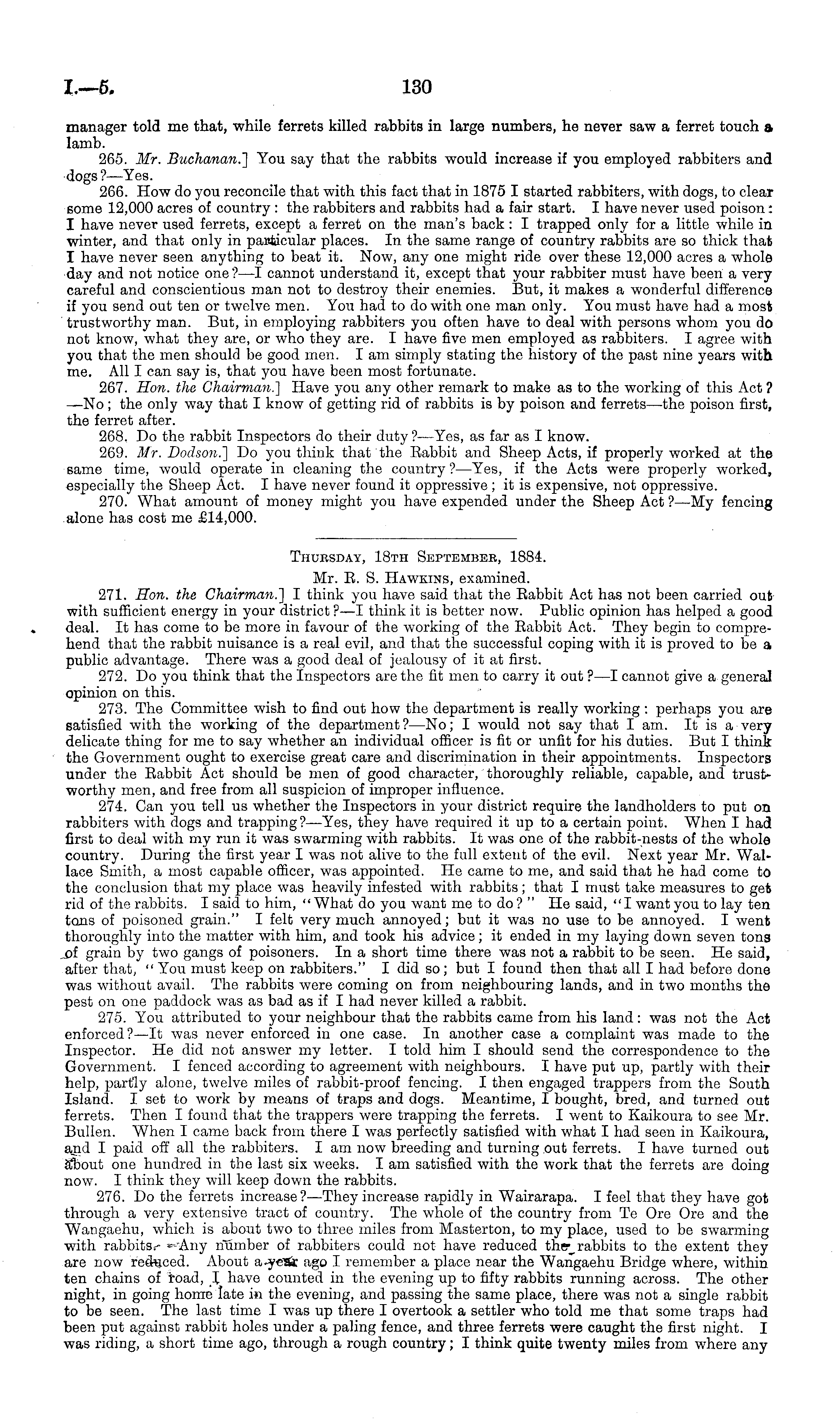 Thursday, 18th Septembee, 1884. Mr. B. S. Hawkins, examined. 271. Hon. the Chairman!) I think you have said that the Rabbit Act has not been carried out with sufficient energy in your district ? —I think it is better now. Public opinion has helped a good deal. It has come to be more in favour of the working of the Rabbit Act. They begin to comprehend that the rabbit nuisance is a real evil, and that the successful coping with it is proved to be a public advantage. There was a good deal of jealousy of it at first. 272. Do you think that the Inspectors are the fit men to carry it out ? —I cannot give a general opinion on this. 273. The Committee wish to find out how the department is really working : perhaps you are satisfied with the working of the department ? —No; I would not say that I am. It is a very delicate thing for me to say whether an individual officer is fit or unfit for his duties. But I think the Government ought to exercise great care and discrimination in their appointments. Inspectors under the Babbit Act should be men of good character, thoroughly reliable, capable, and trustworthy men, and free from all suspicion of improper influence. 274. Can you tell us whether the Inspectors in your district require the landholders to put on rabbiters with dogs and trapping?— Yes, they have required it up to a certain point. When I had first to deal with my run it was swarming with rabbits. It was one of the rabbit-nests of the whole country. During the first year I was not alive to the full extent of the evil. Next year Mr. Wallace Smith, a most capable officer, was appointed. He came to me, and said that he had come to the conclusion that my place was heavily infested with rabbits; that I must take measures to get rid of the rabbits. I said to him, "What do you want me to do? " He said, "I wantyou to lay ten tons of poisoned grain." I felt very much annoyed; but it was no use to be annoyed. I went thoroughly into the matter with him, and took his advice ; it ended in my laying down seven tons of grain by two gangs of poisoners. In a short time there was not a rabbit to be seen. He said, after that, " You must keep on rabbiters." I did so; but I found then that all I had before done was without avail. The rabbits were coming on from neighbouring lands, and in two months the pest on one paddock was as bad as if I had never killed a rabbit. 275. You attributed to your neighbour that the rabbits came from his land: was not the Act enforced? —It was never enforced in one case. In another case a complaint was made to the Inspector. He did not answer my letter. I told him I should send the correspondence to the Government. I fenced according to agreement with neighbours. I have put up, partly with their help, partly alone, twelve miles of rabbit-proof fencing. I then engaged trappers from the South Island. I set to work by means of traps and dogs. Meantime, I bought, bred, and turned out ferrets. Then I found that the trappers were trapping the ferrets. I went to Kaikoura to see Mr. Bullen. When I came back from there I was perfectly satisfied with what I had seen in Kaikoura, and I paid off all the rabbiters. lam now breeding and turning out ferrets. I have turned out about one hundred in the last six weeks. lam satisfied with the work that the ferrets are doing now. I think they will keep down the rabbits. 276. Do the ferrets increase?— They increase rapidly in Wairarapa. I feel that they have got through a very extensive tract of country. The whole of the country from Te Ore Ore and the Wangaohu, which is about two to throe miles from Masterton, to my place, used to be swarming with rabbits.-- -"■""Any number of rabbiters could not have reduced the-^ rabbits to the extent they are now reduced. About a-year ago I remember a place near the Wangaehu Bridge where, within ten chains of road, I have counted in the evening up to fifty rabbits running across. The other night, in going home late in the evening, and passing the same place, there was not a single rabbit to be seen. The last time I was up there I overtook a settler who told me that some traps had been put against rabbit holes under a paling fence, and three ferrets were caught the first night. I was riding, a short time ago, through a rough country; I think quite twenty miles from where any