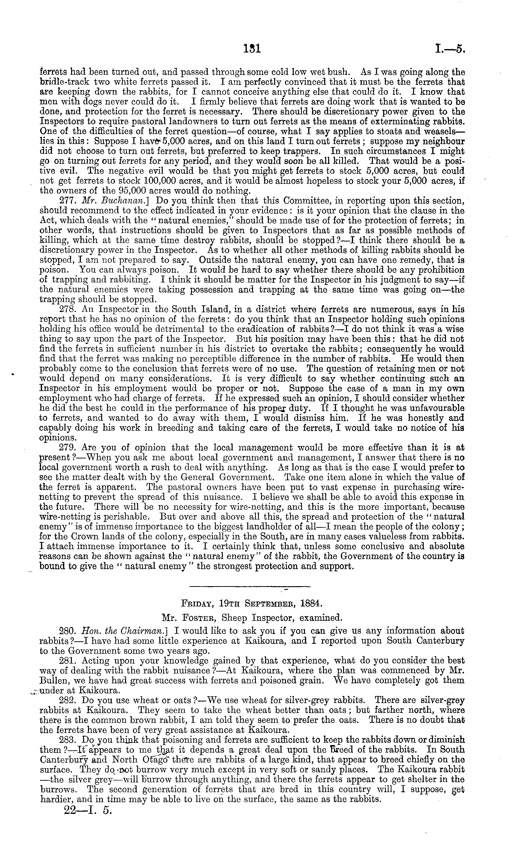 Feiday, 19th Septembee, 1884. Mr. Fostee, Sheep Inspector, examined. 280. Hon. the Chairman!) I would like to ask you if you can give us any information about rabbits ? —I have had some little experience at Kaikoura, and I reported upon South Canterbury to the Government some two years ago. 281. Acting upon your knowledge gained by that experience, what do you consider the best way of dealing with the rabbit nuisance ? —At Kaikoura, where the plan was commenced by Mr. Bullen, we have had great success with ferrets and poisoned grain. We have completely got them under at Kaikoura. 282. Do you use wheat or oats ? —We use wheat for silver-grey rabbits. There are silver-grey rabbits at Kaikoura. They seem to take the wheat better than oats; but farther north, where there is the common brown rabbit, I am told they seem to prefer the oats. There is no doubt that the ferrets have been of very great assistance at Kaikoura. 283. Do you think that poisoning and ferrets are sufficient to keep the rabbits down or diminish them ? —lt appears to me that it depends a great deal upon the breed of the rabbits. In South Canterbury and North Otago there are rabbits of a large kind, that appear to breed chiefly on the surface. They do -not burrow very much except in very soft or sandy places. The Kaikoura rabbit ■ —the silver grey —will burrow through anything, and there the ferrets appear to get shelter in the burrows. The second generation of ferrets that are bred in this country will, I suppose, get hardier, and in time may be able to live on the surface, the same as the rabbits. 22—1. 5.