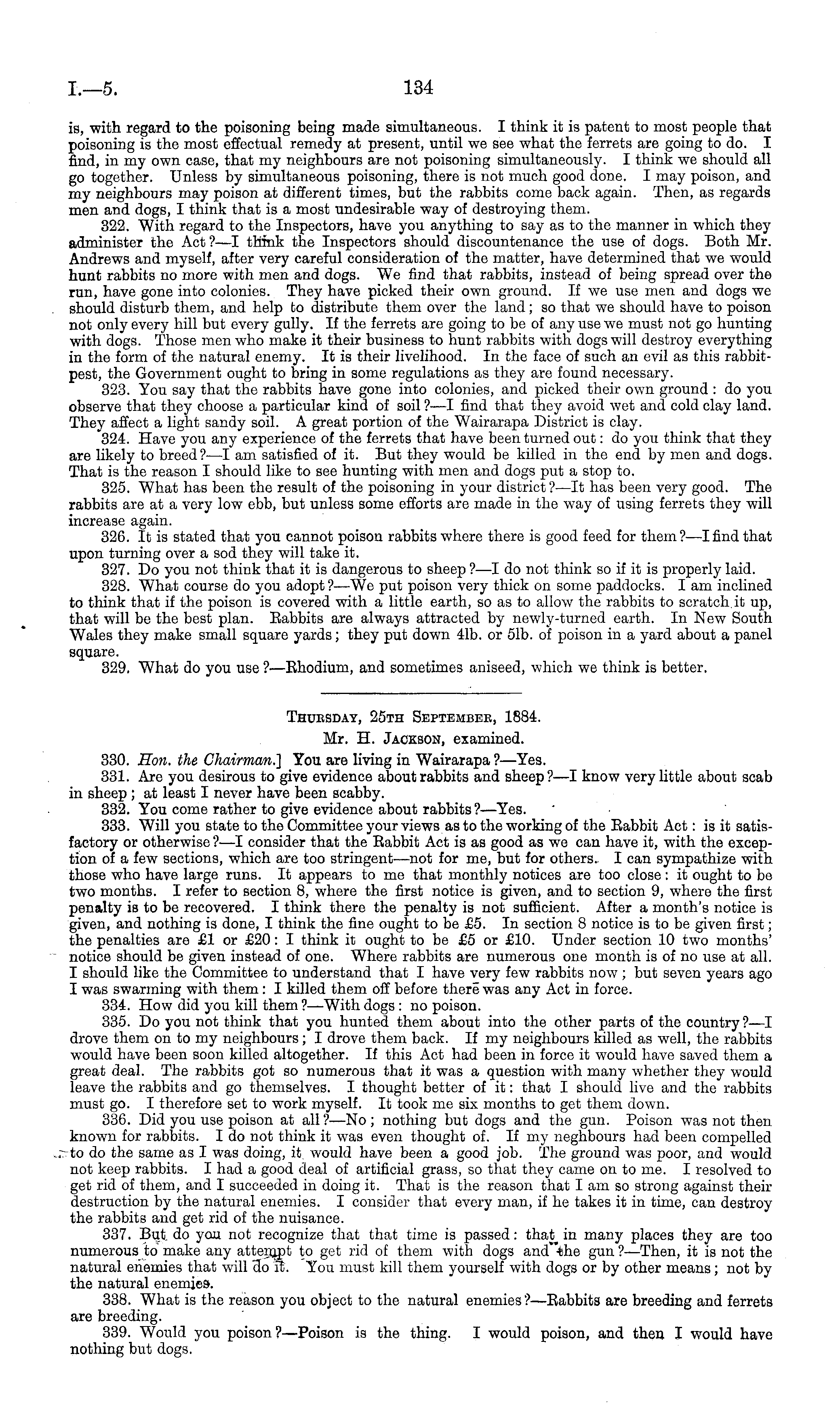 Thuesday, 25th Septembee, 1884. Mr. H. Jackson, examined. 330. Hon. the Chairman!) You are living in Wairarapa ?—Yes. 331. Are you desirous to give evidence about rabbits and sheep?—l know very little about scab in sheep ; at least I never have been scabby. 332. You come rather to give evidence about rabbits?— Yes. 333. Will you state to the Committee your views as to the working of the Babbit Act: is it satisfactory or otherwise ?—I consider that the Babbit Act is as good as we can have it, with the exception of a few sections, which are too stringent —not for me, but for others. I can sympathize with those who have large runs. It appears to me that monthly notices are too close: it ought to be tw-o months. I refer to section 8, where the first notice is given, and to section 9, where the first penalty is to be recovered. I think there the penalty is not sufficient. After a month's notice is given, and nothing is done, I think the fine ought to be £5. In section 8 notice is to be given first; the penalties are £1 or £20: I think it ought to be £5 or £10. Under section 10 two months' notice should be given instead of one. Where rabbits are numerous one month is of no use at all. I should like the Committee to understand that I have very few rabbits now ; but seven years ago I was swarming with them : I killed them off before there was any Act in force. 334. How did you kill them ?—With dogs : no poison. 335. Do you not think that you hunted them about into the other parts of the country?—l drove them on to my neighbours ; I drove them back. If my neighbours killed as well, the rabbits would have been soon killed altogether. If this Act had been in force it would have saved them a great deal. The rabbits got so numerous that it was a question with many whether they would leave the rabbits and go themselves. I thought better of it: that I should live and the rabbits must go. I therefore set to work myself. It took me six months to get them down. 336. Did you use poison at all ?—No ; nothing but dogs and the gun. Poison was not then known for rabbits. Ido not think it was even thought of. If my neghbours had been compelled to do the same as I was doing, it, would have been a good job. The ground was poor, and would not keep rabbits. I had a good deal of artificial grass, so that they came on to me. I resolved to get rid of them, and I succeeded in doing it. That is the reason that lam so strong against their destruction by the natural enemies. I consider that every man, if he takes it in time, can destroy the rabbits and get rid of the nuisance. 337. But do you not recognize that that time is passed: that in many places they are too numerous to make any attempt to get rid of them with dogs and'the gun?— Then, it is not the natural enemies that will do ft. You must kill them yourself with dogs or by other means; not by the natural enemies. 338. What is the reason you object to the natural enemies?— Babbits are breeding and ferrets are breeding. 339. Would you poison?— Poison is the thing. I would poison, and then I would have nothing but dogs.
