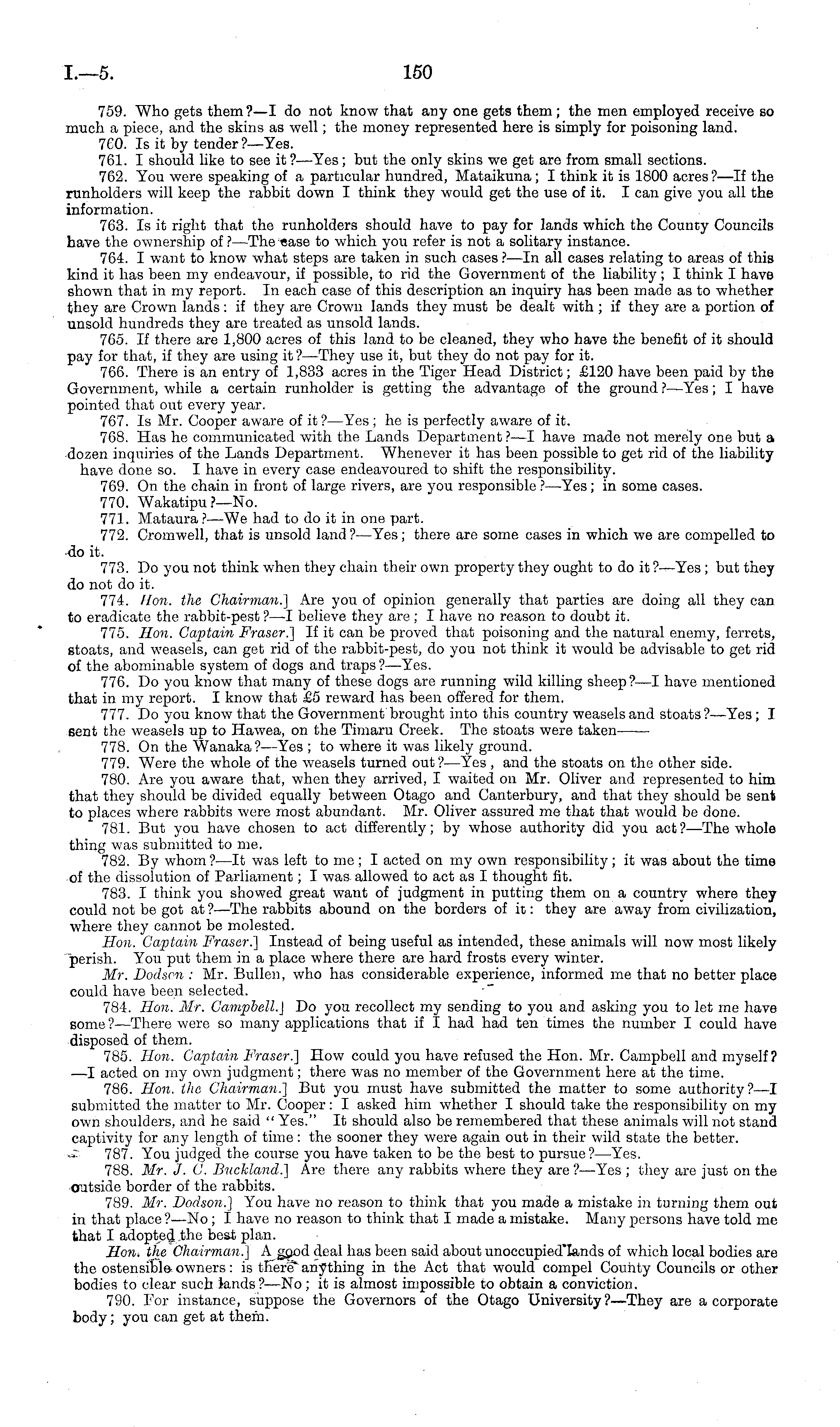 759. Who gets them?—l do not know that any one gets them; the men employed receive so much a piece, and the skins as well; the money represented here is simply for poisoning land. 760. Is it by tender?— Yes. 761. I should like to see it ?—Yes; but the only skins we get are from small sections. 762. You were speaking of a particular hundred, Mataikuna; I think it is 1800 acres? —If the runholders will keep the rabbit down I think they would get the use of it. I can give you all the information. 763. Is it right that the runholders should have to pay for lands which the County Councils have the ownership of ?—The case to which you refer is not a solitary instance. 764. I want to know what steps are taken in such cases ?—ln all cases relating to areas of this kind it has been my endeavour, if possible, to rid the Government of the liability; I think I have shown that in my report. In each case of this description an inquiry has been made as to whether they are Crown lands: if they are Crown lands they must be dealt with ; if they are a portion of unsold hundreds they are treated as unsold lands. 765. If there are 1,800 acres of this land to be cleaned, they who have the benefit of it should pay for that, if they are using it?— They use it, but they do not pay for it. 766. There is an entry of 1,833 acres in the Tiger Head District; £120 have been paid by the Government, while a certain runholder is getting the advantage of the ground ?—Yes; I have pointed that out every year. 767. Is Mr. Cooper aware of it? —Yes; he is perfectly aware of it. 768. Has he communicated with the Lands Department?—l have made not merely one but a dozen inquiries of the Lands Department. Whenever it has been possible to get rid of the liability have done so. I have in every case endeavoured to shift the responsibility. 769. On the chain in front of large rivers, are you responsible ?—Yes; in some cases. 770. Wakatipu ?—No. 771. Mataura ?—We had to do it in one part. 772. Cromwell, that is unsold land ? —Yes; there are some cases in which we are compelled to •do it. 773. Do you not think when they chain their own property they ought to do it ?—Yes ; but they do not do it. 774. Hon. the Chairman.) Are you of opinion generally that parties are doing all they can to eradicate the rabbit-pest ? —I believe they are ; I have no reason to doubt it. 775. Hon. Captain Fraser.) If it can be proved that poisoning and the natural enemy, ferrets, stoats, and weasels, can get rid of the rabbit-pest, do you not think it would be advisable to get rid of the abominable system of dogs and traps?— Yes. 776. Do you know that many of these dogs are running wild killing sheep?—l have mentioned that in my report. I know that £5 reward has been offered for them. 777. Do you know that the Government brought into this country weasels and stoats ?—Yes ; I sent the weasels up to Hawea, on the Timaru Creek. The stoats were taken 778. On the Wanaka ?—Yes ; to where it was likely ground. 779. Were the whole of the weasels turned out ?—Yes , and the stoats on tho other side. 780. Are you aware that, when they arrived, I waited on Mr. Oliver and represented to him that they should be divided equally between Otago and Canterbury, and that they should be sent to places where rabbits were most abundant. Mr. Oliver assured me that that would be done. 781. But you have chosen to act differently; by whose authority did you act?— The whole thing was submitted to me. 782. By whom? —It was left to me ; I acted on my own responsibility ; it was about the time of the dissolution of Parliament; I was allowed to act as I thought fit. 783. I think you showed great want of judgment in putting them on a country where they could not be got at ?—The rabbits abound on the borders of it: they are away from civilization, where they cannot be molested. Hon. Captain Fraser.) Instead of being useful as intended, these animals will now most likely perish. You put them in a place where there are hard frosts every winter. Mr. Dodson : Mr. Bullen, who has considerable experience, informed me that no better place could have been selected. 784. Hon. Mr. Campbell.) Do you recollect my sending to you and asking you to let me have some? —There were so many applications that if I had had ten times the number I could have disposed of them. 785. Hon. Captain Fraser.) How could you have refused the Hon. Mr. Campbell and myself? ■ —I acted on my own judgment; there was no member of the Government here at the time. 786. Hon. the Chairman.) But you must have submitted the matter to some authority?—l submitted the matter to Mr. Cooper: I asked him whether I should take the responsibility on my own shoulders, and he said " Yes." It should also be remembered that these animals will not stand captivity for any length of time: the sooner they were again out in their wild state the better. 787. You judged the course you have taken to be the best to pursue?— Yes. 788. Mr. J. C. Buckland.) Are there any rabbits where they are ? —Yes ; they are just on the outside border of the rabbits. 789. Mr. Dodson.] You have no reason to think that you made a mistake in turning them out in that place ?—No ; I have no reason to think that I made a mistake. Many persons have told me that I adopted the best plan. Hon. the Chairman.) A good deal has been said about unoccupied'lands of which local bodies are the ostensible owners: is there anything in the Act that would compel County Councils or other bodies to clear such lands?—No; it is almost impossible to obtain a conviction. 790. For instance, suppose the Governors of the Otago University?— They are a corporate body; you can get at them.