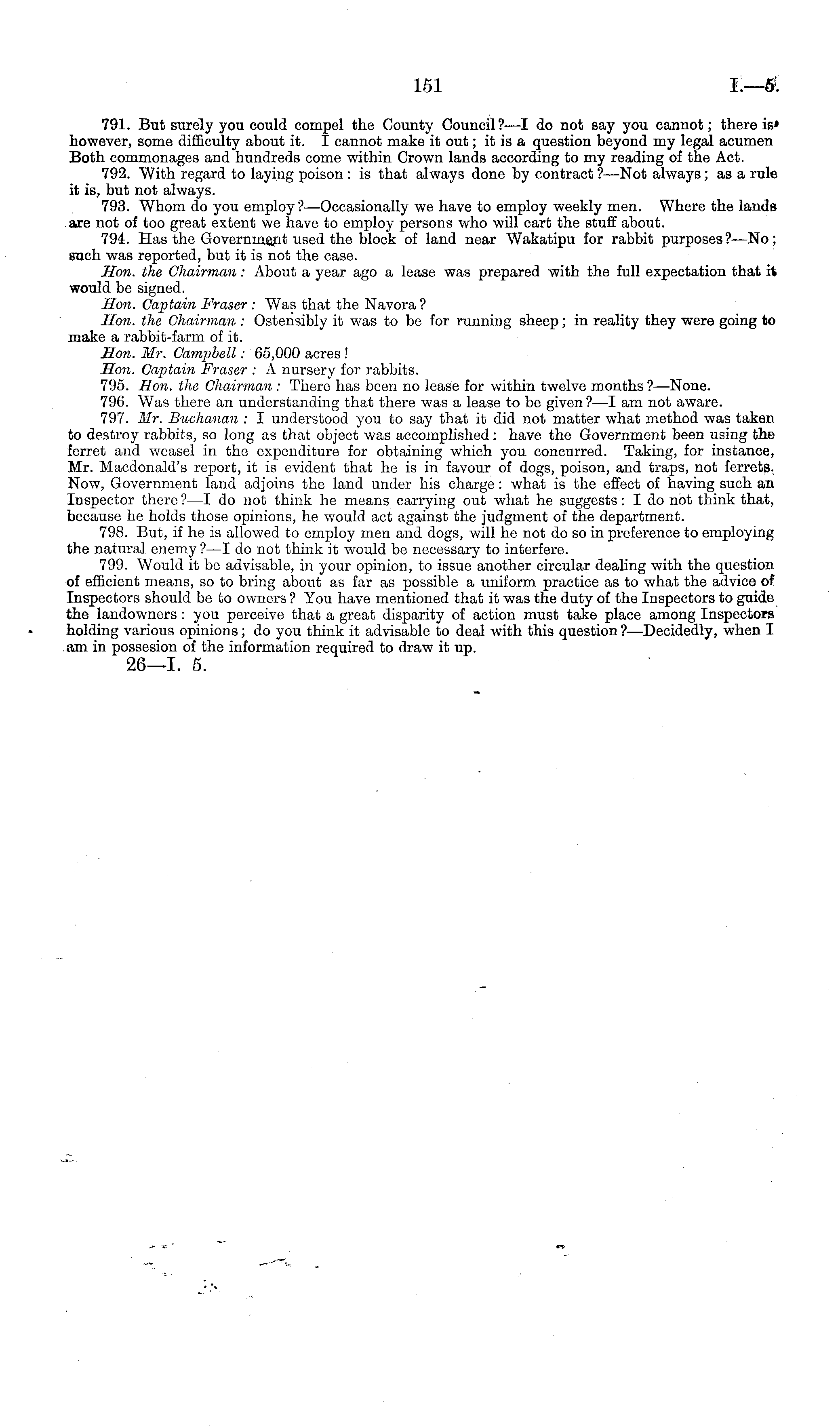 791. But surely you could compel the County Council?—l do not say you cannot; there is» however, some difficulty about it. I cannot make it out; it is a question beyond my legal acumen Both commonages and hundreds come within Crown lands according to my reading of the Act. 792. With regard to laying poison : is that always done by contract ?—Not always; as a rule it is, but not always. 793. Whom do you employ? —Occasionally we have to employ weekly men. Where the lands are not of too great extent we have to employ persons who will cart the stuff about. 794. Has the Government used the block of land near Wakatipu for rabbit purposes?—No; such was reported, but it is not the case. Hon. the Chairman: About a year ago a lease was prepared with the full expectation that it would be signed. Hon. Captain Fraser: Was that the Navora ? Hon. the Chairman : Ostensibly it was to be for running sheep; in reality they were going to make a rabbit-farm of it. Hon. Mr. Campbell: 65,000 acres! Hon. Captain Fraser : A nursery for rabbits. 795. Hon. the Chairman : There has been no lease for within twelve months ? —None. 796. Was there an understanding that there was a lease to be given?—l am not aware. 797. Mr. Buchanan : I understood you to say that it did not matter what method was taken to destroy rabbits, so long as that object was accomplished: have the Government been using the ferret and weasel in the expenditure for obtaining which you concurred. Taking, for instance, Mr. Macdonald's report, it is evident that he is in favour of dogs, poison, and traps, not ferrets. Now, Government land adjoins the land under his charge: what is the effect of having such an Inspector there?—l do not think he means carrying out what he suggests: I do not think that, because he holds those opinions, he would act against the judgment of the department. 798. But, if he is allowed to employ men and dogs, will he not do so in preference to employing the natural enemy ?—I do not think it would be necessary to interfere. 799. Would it be advisable, in your opinion, to issue another circular dealing with the question of efficient means, so to bring about as far as possible a uniform practice as to what the advice of Inspectors should be to owners ? You have mentioned that it was the duty of the Inspectors to guide the landowners : you perceive that a great disparity of action must take place among Inspectors holding various opinions; do you think it advisable to deal with this question ?—Decidedly, when I am in possesion of the information required to draw it up. 26—1. 5.