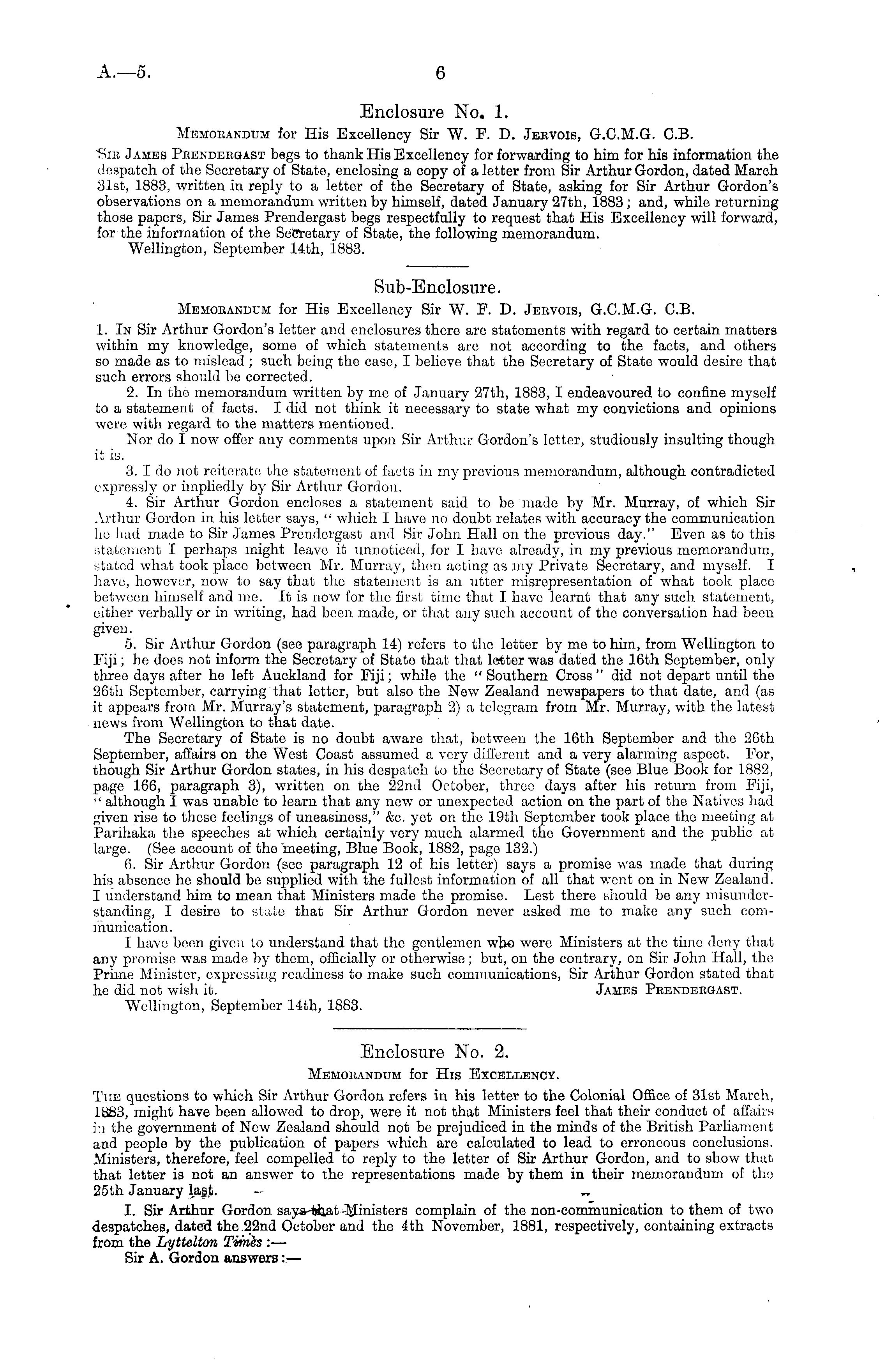 Sub-Enclosure. Memoeandum for His Excellency Sir W. F. D. Jeevois, G.G.M.G. C.B. 1. In Sir Arthur Gordon's letter and enclosures there are statements with regard to certain matters within my knowledge, some of which statements are not according to the facts, and others so made as to mislead ; such being the case, I believe that the Secretary of State would desire that such errors should bo corrected. 2. In the memorandum written by me of January 27th, 1883, I endeavoured to confine myself to a statement of facts. I did not think it necessary to state what my convictions and opinions were with regard to the matters mentioned. Nor do I now offer any comments upon Sir Arthur Gordon's letter, studiously insulting though it is. 3. I do not reiterate the statement of facts in my previous memorandum, although contradicted expressly or impliedly by Sir Arthur Gordon. 4. Sir Arthur Gordon encloses a statement said to be made by Mr. Murray, of which Sir Arthur Gordon in his letter says, " which I have no doubt relates with accuracy the communication ho had made to Sir James Prendorgast and Sir John Hall on the previous day." Even as to this statement I perhaps might leave it unnoticed, for I have already, in my previous memorandum, stated what took place between Mr. Murray, then acting as my Private Secretary, and myself. I have, however, now to say that the statement is an utter misrepresentation of what took place between himself and me. It is now for the first time that I have learnt that any such statement, either verbally or in writing, had been made, or that any such account of the conversation had been given. 5. Sir Arthur Gordon (see paragraph 14) refers to the letter by me to him, from Wellington to Fiji ; he does not inform the Secretary of State that that letter was dated the 16th September, only three days after he left Auckland for Fiji; while the " Southern Cross" did not depart until the 26th September, carrying "that letter, but also the New Zealand newspapers to that date, and (as it appears from Mr. Murray's statement, paragraph 2) a telegram from Mr. Murray, with the latest news from Wellington to that date. The Secretary of State is no doubt aware that, between the 16th September and the 26th September, affairs on the West Coast assumed a very different and a very alarming aspect. For, though Sir Arthur Gordon states, in his despatch to the Secretary of State (see Blue Book for 1882, page 166, paragraph 3), written on the 22nd October, three days after his return from Fiji, " although I was unable to learn that any new or unexpected action on the part of the Natives had given rise to these feelings of uneasiness," &c. yet on the 19th September took place the meeting at Parihaka the speeches at which certainly very much alarmed the Government and the public rot large. (See account of the meeting, Blue Book, 1882, page 132.) 6. Sir Arthur Gordon (see paragraph 12 of his letter) says a promise was made that during his absence ho should be supplied with the fullest information of all that went on in New Zealand. I understand him to mean that Ministers made the promise. Lest there should be any misunderstanding, I desire to state that Sir Arthur Gordon never asked me to make any such communication. I have been given to understand that the gentlemen who wore Ministers at the time deny that any promise was made by them, officially or otherwise; but, on the contrary, on Sir John Hall, the Prime Minister, expressing readiness to make such communications, Sir Arthur Gordon stated that he did not wish it. James Peendebgast. Wellington, September 14th, 1883.