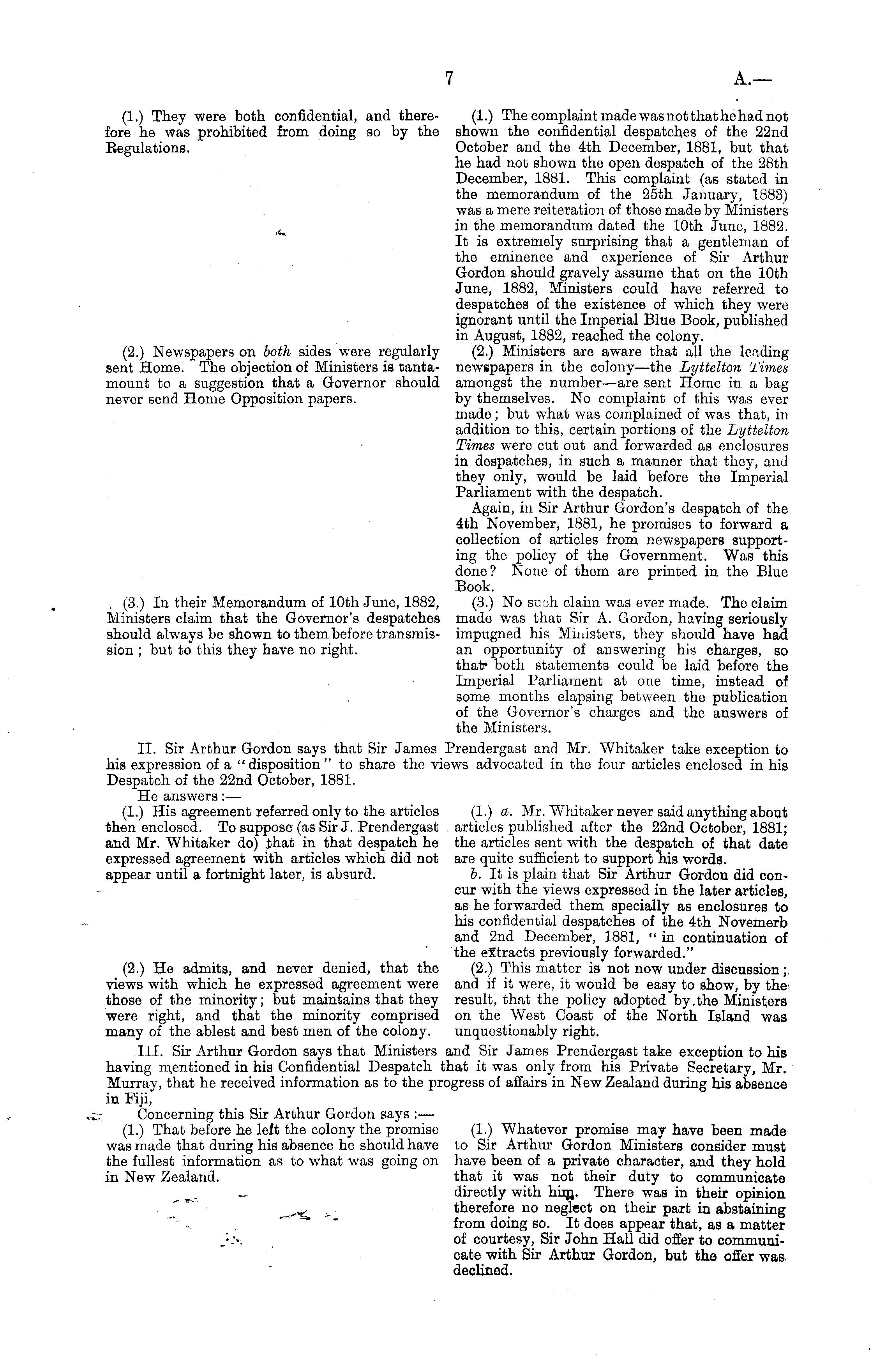 (1.) They were both confidential, and there- (1.) The complaint made was not that he had not fore he was prohibited from doing so by the shown the confidential despatches of the 22nd Eegulations. October and the 4th December, 1881, but that he had not shown the open despatch of the 28th December, 1881. This complaint (as stated in the memorandum of the 25th January, 1883) was a mere reiteration of those made by Ministers in the memorandum dated the 10th June, 1882. It is extremely surprising that a gentleman of the eminence and experience of Sir Arthur Gordon should gravely assume that on the 10th June, 1882, Ministers could have referred to despatches of the existence of which they were ignorant until the Imperial Blue Book, published in August, 1882, reached the colony. (2.) Newspapers on both sides were regularly (2.) Ministers are aware that all the loading sent Home. The objection of Ministers is tanta- newspapers in the colony—the Lyttelton Times mount to a suggestion that a Governor should amongst the number—are sent Home in a bag never send Home Opposition papers. by themselves. No complaint of this was ever made; but what was complained of was that, in addition to this, certain portions of the Lyttclton Times were cut out and forwarded as enclosures in despatches, in such a manner that they, and they only, would be laid before the Imperial Parliament with the despatch. Again, in Sir Arthur Gordon's despatch of the 4th November, 1881, he promises to forward a collection of articles from newspapers supporting the policy of the Government. Was this done? None of them are printed in the Blue Book. (3.) In their Memorandum of 10th Juno, 1882, (3.) No sr.ch claim was ever made. The claim Ministers claim that the Governor's despatches made was that Sir A. Gordon, having seriously should always be shown to them before transmis- impugned his Ministers, they should have had sion ; but to this they have no right. an opportunity of answering his charges, so that" both statements could be laid before the Imperial Parliament at one time, instead of some months elapsing between the publication of the Governor's charges and the answers of the Ministers. 11. Sir Arthur Gordon says that Sir James Prendergast and Mr. Whitaker take exception to his expression of a " disposition " to share the views advocated in the four articles enclosed in his Despatch of the 22nd October, 1881. He answers:— (1.) His agreement referred only to the articles (1.) a. Mr. Whitaker never said anything about then enclosed. To suppose (as Sir J. Prendergast articles published after the 22nd October, 1881; and Mr. Whitaker do) that in that despatch he the articles sent with the despatch of that date expressed agreement with articles which did not are quite sufficient to support his words, appear until a fortnight later, is absurd. b. It is plain that Sir Arthur Gordon did concur with the views expressed in the later articles, as he forwarded them specially as enclosures to his confidential despatches of the 4th Novemerb and 2nd December, 1881, " in continuation of the extracts previously forwarded." (2.) He admits, and never denied, that the (2.) This matter is not now under discussion; views with which he expressed agreement were and if it were, it would be easy to show, by the those of the minority; but maintains that they result, that the policy adopted by,the Ministers were right, and that the minority comprised on the West Coast of the North Island was many of the ablest and best men of the colony. unquestionably right. 111. Sir Arthur Gordon says that Ministers and Sir James Prendergast take exception to his having mentioned in his Confidential Despatch that it was only from his Private Secretary, Mr. Murray, that he received information as to the progress of affairs in New Zealand during his absence in Fiji, Concerning this Sir Arthur Gordon says : — (1.) That before he left the colony the promise (1.) Whatever promise may have been made was made that during his absence he should have to Sir Arthur Gordon Ministers consider must the fullest information as to what was going on have been of a private character, and they hold in New Zealand. that it was not their duty to communicate — directly with him,. There was in their opinion therefore no neglect on their part in abstaining from doing so. It does appear that, as a matter of courtesy, Sir John Hall did offer to communicate with Sir Arthur Gordon, but the offer was declined.