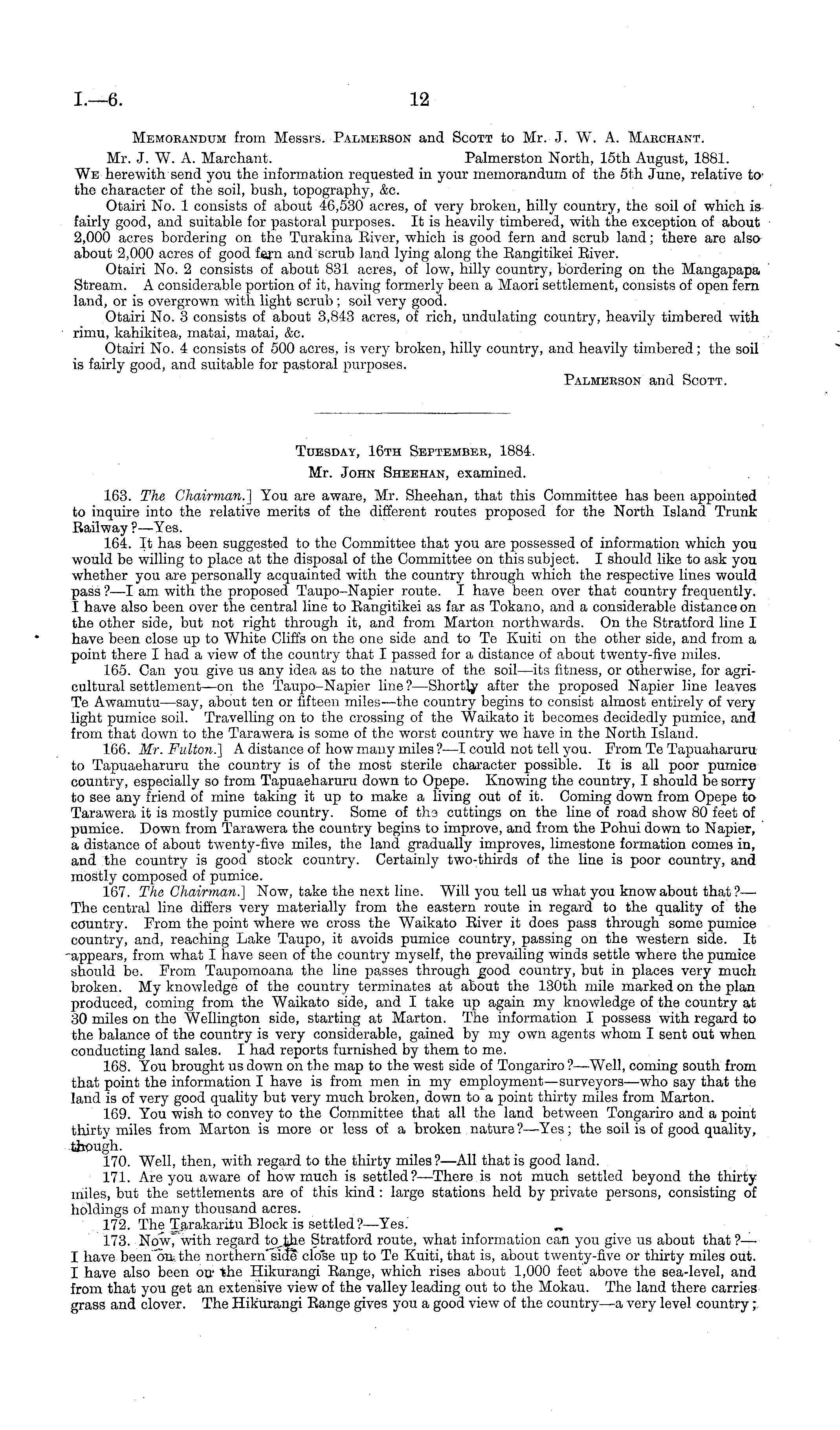 Tuesday, 16th September, 1884. Mr. John Sheehan, examined. 163. The Chairman.^ You are aware, Mr. Sheehan, that this Committee has been appointed to inquire into the relative merits of the different routes proposed for the North Island Trunk Railway ? —Yes. 164. It has been suggested to the Committee that you are possessed of information which you would be willing to place at the disposal of the Committee on this subject. I should like to ask you whether you are personally acquainted with the country through which the respective lines would pass ?—I am with the proposed Taupo-Napier route. I have been over that country frequently. I have also been over the central line to Rangitikei as far as Tokano, and a considerable distance on the other side, but not right through it, and from Marton northwards. On the Stratford line I have been close up to White Cliffs on the one side and to Te Kuiti on the other side, and from a point there I had a view of the country that I passed for a distance of about twenty-five miles. 165. Can you give us any idea as to the nature of the soil—its fitness, or otherwise, for agricultural settlement—on the Taupo-Napier line? —Shortly after the proposed Napier line leaves Te Awamutu—say, about ten or fifteen miles—the country begins to consist almost entirely of very light pumice soil. Travelling on to the crossing of the Waikato it becomes decidedly pumice, and from that down to the Tarawera is some of the worst country we have in the North Island. 166. Mr. Fulton.l A distance of how many miles ?—I could not tell you. Prom Te Tapuaharuru to Tapuaeharuru the country is of the most sterile character possible. It is all poor pumice country, especially so from Tapuaeharuru down to Opepe. Knowing the country, I should be sorry to see any friend of mine taking it up to make a living out of it. Coming down from Opepe to Tarawera it is mostly pumice country. Some of the cuttings on the line of road show 80 feet of pumice. Down from Tarawera the country begins to improve, and from the Pohui down to Napier, a distance of about twenty-five miles, the land, gradually improves, limestone formation cornea in, and the country is good stook country. Certainly two-thirds of the line is poor country, and mostly composed of pumice. 167. The Chairman.'] Now, take the next line. Will you tell us what you know about that?—■ The central line differs very materially from the eastern route in regard to the quality of the country. From the point where we cross the Waikato River it does pass through some pumice country, and, reaching Lake Taupo, it avoids pumice country, passing on the western side. It appears, from what I have seen of the country myself, the prevailing winds settle where the pumice should be. From Taupomoana the line passes through good country, but in places very much broken. My knowledge of the country terminates at about the 130 th mile marked on the plan produced, coming from the Waikato side, and I take up again my knowledge of the country at 30 miles on the Wellington side, starting at Marton. The information I possess with regard to the balance of the country is very considerable, gained by my own agents whom I sent out when conducting land sales. I had reports furnished by them to me. 168. You brought us down on the map to the west side of Tongariro ?—Well, coming south from that point the information I have is from men in my employment —surveyors —who say that the land is of very good quality but very much broken, down to a point thirty miles from Marton. 169. You wish to convey to the Committee that all the land between Tongariro and a point thirty miles from Marton is more or less of a broken nature ?—Yes; the soil is of good quality, though. 170. Well, then, with regard to the thirty miles?— All that is good land. 171. Are you aware of how much is settled?— There is not much settled beyond the thirty miles, but the settlements are of this kind : large stations held by private persons, consisting of holdings of many thousand acres. 172. The Tarakaritu Block is settled? —Yes.' 173. Nowj with regard to the Stratford route, what information can you give us about that ? — I have been on the northern' side close up to Te Kuiti, that is, about twenty-five or thirty miles out. I have also been on the Hikurangi Range, which rises about 1,000 feet above the sea-level, and from that you get an extensive view of the valley leading out to the Mokau. The land there carries grass and clover. The Hikurangi Range gives you a good view of the country—a very level country ;
