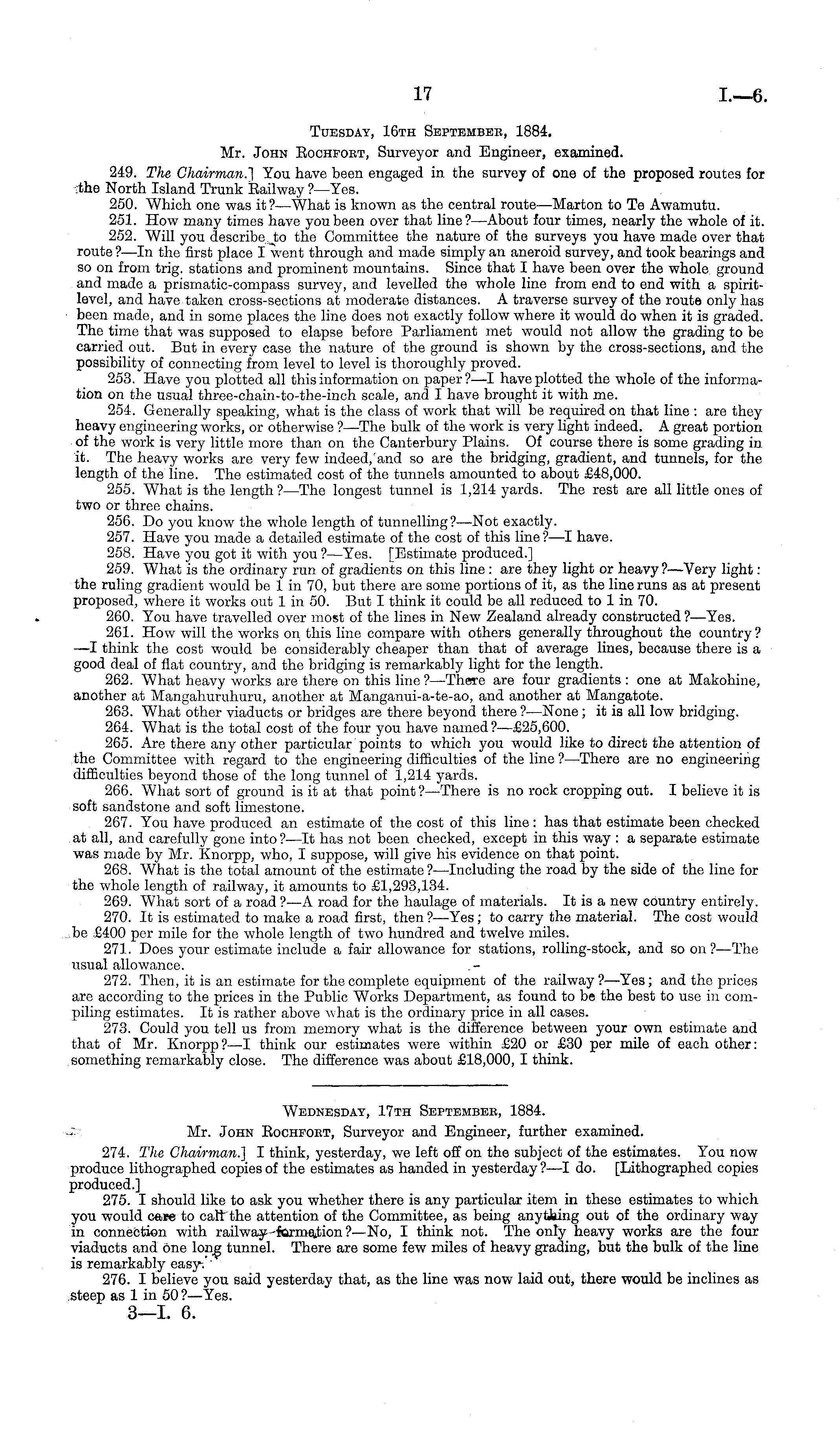 Wednesday, 17th Septembee, 1884. Mr. John Bochfoet, Surveyor and Engineer, further examined. 274. The Chairman.] I think, yesterday, we left off on the subject of the estimates. You now produce lithographed copies of the estimates as handed in yesterday?—l do. [Lithographed copies produced.] 275. I should like to ask you whether there is any particular item in these estimates to which you would care to call the attention of the Committee, as being anything out of the ordinary way in connection with railway formation? —No, I think not. The only heavy works are the four viaducts and one long tunnel. There are some few miles of heavy grading, but the bulk of the line is remarkably easy*.' 276. I believe you said yesterday that, as the line was now laid out, there would be inclines as steep as 1 in 50 ?—Yes. 3—l. 6.