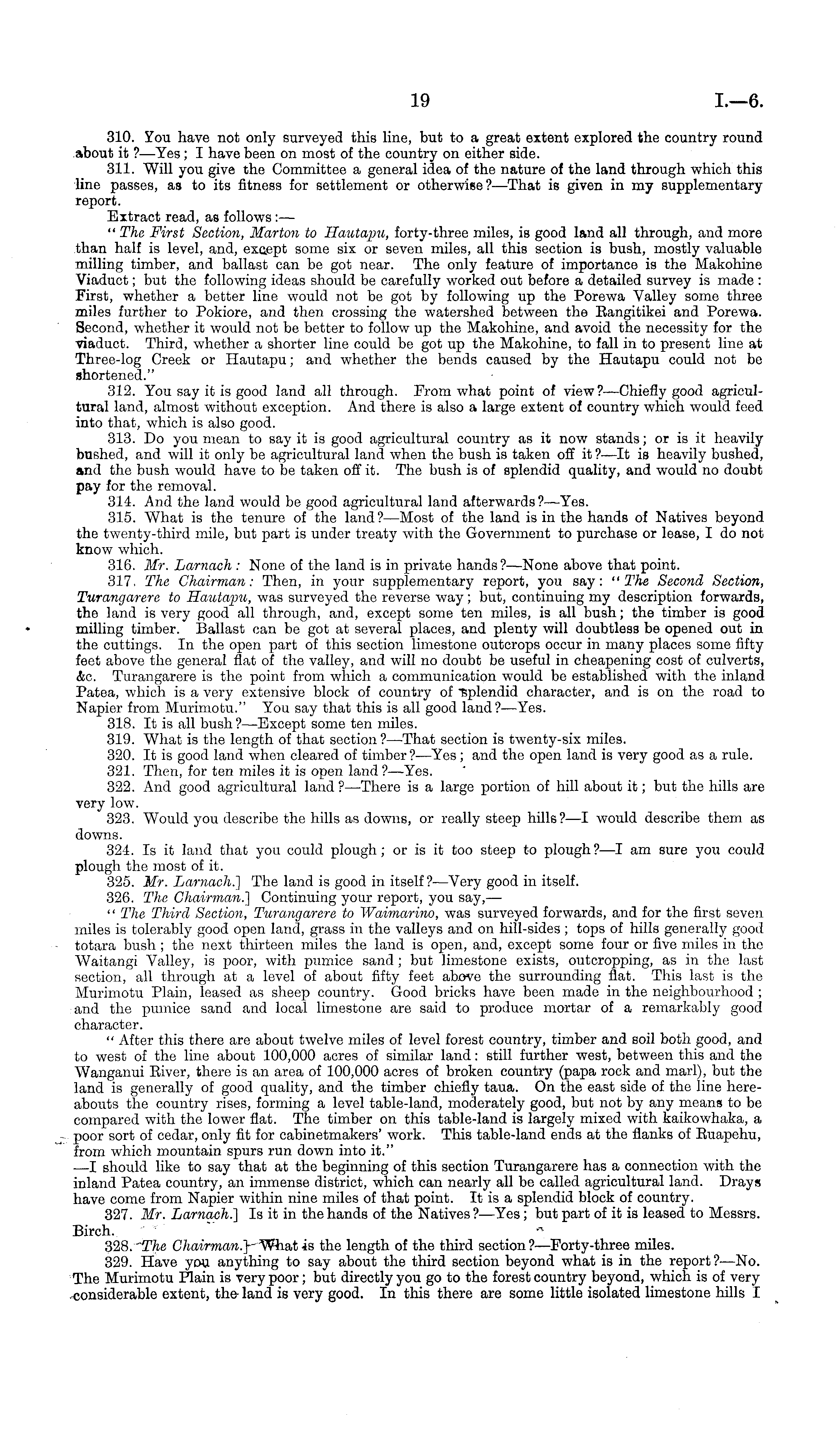310. You have not only surveyed this line, but to a great extent explored the country round about it ?—Yes; I have been on most of the country on either side. 311. Will you give the Committee a general idea of the nature of the land through which this line passes, as to its fitness for settlement or otherwise?— That is given in my supplementary report. Extract read, as follows :— " The First Section, Marton to Hautapu, forty-three miles, is good land all through, and more than half is level, and, except some six or seven miles, all this section is bush, mostly valuable milling timber, and ballast can be got near. The only feature of importance is the Makohine Viaduct; but the following ideas should be carefully worked out before a detailed survey is made : First, whether a better line would not be got by following up the Porewa Valley some three miles further to Pokiore, and then crossing the watershed between the Eangitikei and Porewa. Second, whether it would not bo better to follow up the Makohine, and avoid the necessity for the viaduct. Third, whether a shorter line could be got up the Makohine, to fall in to present lino at Three-log Creek or Hautapu; and whether the bends caused by the Hautapu could not be shortened." 312. You say it is good land all through. Prom what point of view?— Chiefly good agricultural land, almost without exception. And there is also a large extent of country which would feed into that, which is also good. 313. Do you mean to say it is good agricultural country as it now stands; or is it heavily bushed, and will it only be agricultural land when the bush is taken off it ?—lt is heavily bushed, and the bush would have to be taken off it. The bush is of splendid quality, and would no doubt pay for the removal. 314. And the land would be good agricultural land afterwards?— Yes. 315. What is the tenure of the land?— Most of the land is in the hands of Natives beyond the twenty-third mile, but part is under treaty with the Government to purchase or lease, I do not know which. 316. Mr. Larnach : None of the land is in private hands?— None above that point. 317. The Chairman: Then, in your supplementary report, you say: "The Second Section, Turangarere to Hautapu, was surveyed the reverse way; but, continuing my description forwards, the land is very good all through, and, except some ten miles, is all bush; the timber is good milling timber. Ballast can be got at several places, and plenty will doubtless be opened out in the cuttings. In the open part of this section limestone outcrops occur in many places some fifty feet above the general flat of the valley, and will no doubt be useful in cheapening cost of culverts, &c. Turangarere is the point from which a communication would be established with the inland Patea, which is a very extensive block of country of 'splendid character, and is on the road to Napier from Murimotu." You say that this is all good land? —Yes. 318. It is all bush ? —Except some ten miles. 319. What is the length of that section ?—That section is twenty-six miles. 320. It is good land when cleared of timber ? —Yes; and the open land is very good as a rule. 321. Then, for ten miles it is open land ?—Yes. 322. And good agricultural land?— There is a large portion of hill about it; but the hills are very low. 323. Would you describe the hills as downs, or really steep hills?—l would describe them as downs. 324. Is it land that you could plough; or is it too steep to plough?—l am sure you could plough the most of it. 325. Mr. Larnach.] The land is good in itself?— Very good in itself. 326. The, Chairman.'] Continuing your report, you say, — " The Third Section, Turangarare to Waimarino, was surveyed forwards, and for the first seven miles is tolerably good open land, grass in the valleys and on hill-sides ; tops of hills generally good totara bush ; the next thirteen miles the land is open, and, except some four or five miles in the Waitangi Valley, is poor, with pumice sand; but limestone exists, outcropping, as in the last section, all through at a level of about fifty feet above the surrounding flat. This last is the Murimotu Plain, leased as sheep country. Good bricks have been made in the neighbourhood ; and the pumice sand and local limestone are said to produce mortar of a remarkably good character. " After this there are about twelve miles of level forest country, timber and soil both good, and to west of the line about 100,000 acres of similar land: still further west, between this and the Wanganui Eiver, there is an area of 100,000 acres of broken country (papa rock and marl), but the land is generally of good quality, and the timber chiefly taua. On the east side of the line hereabouts the country rises, forming a level table-land, moderately good, but not by any means to be compared with the lower flat. The timber on this table-land is largely mixed with kaikowhaka, a poor sort of cedar, only fit for cabinetmakers' work. This table-land ends at the flanks of Euapehu, from which mountain spurs run down into it." —I should like to say that at the beginning of this section Turangarere has a connection with the inland Patea country, an immense district, which can nearly all be called agricultural land. Drays have come from Napier within nine miles of that point. It is a splendid block of country. 327. Mr. Larnach.] Is it in the hands of the Natives ?—Yes; but part of it is leased to Messrs. Birch. 328. The Chairman.} What is the length of the third section ?—Forty-three miles. 329. Have you anything to say about the third section beyond what is in the report?— No. The Murimotu Plain is very poor; but directly you go to the forest country beyond, which, is of very considerable extent, the land is very good. In this there are some little isolated limestone hills I