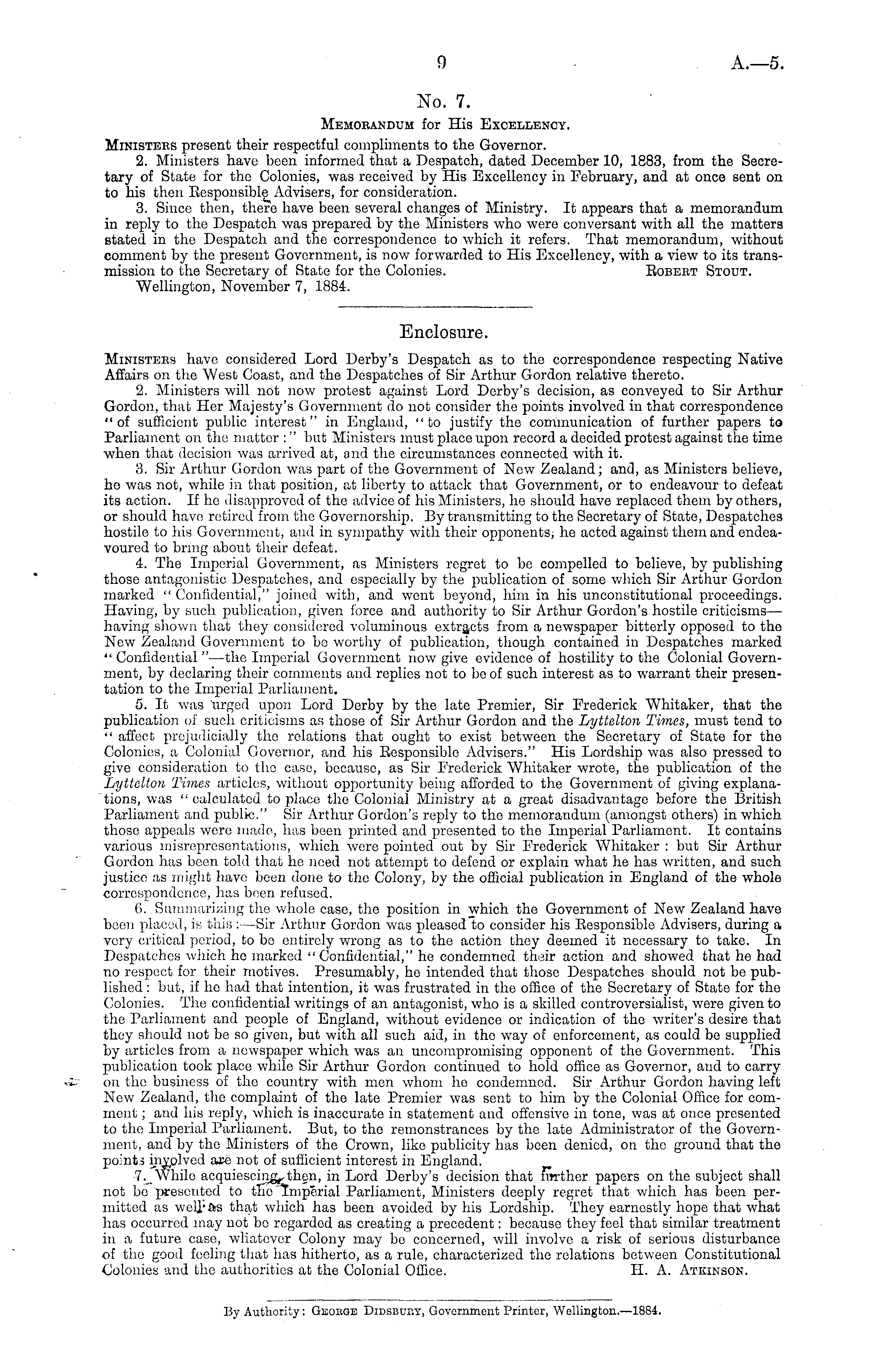 No. 7. Memoeandum for His Excellency. Ministers present their respectful compliments to the Governor. 2. Ministers have been informed that a Despatch, dated December 10, 1883, from the Secretary of State for tho Colonies, was received by His Excellency in February, and at once sent on to his then liosponsible Advisers, for consideration. 3. Since then, there have been several changes of Ministry. It appears that a memorandum in reply to the Despatch was prepared by the Ministers who were conversant with all the matters stated in the Despatch and the correspondence to which it refers. That memorandum, without comment by the present Government, is now forwarded to His Excellency, with a view to its transmission to the Secretary of State for tho Colonies. Eobeut Stout. Wellington, November 7, 1884.