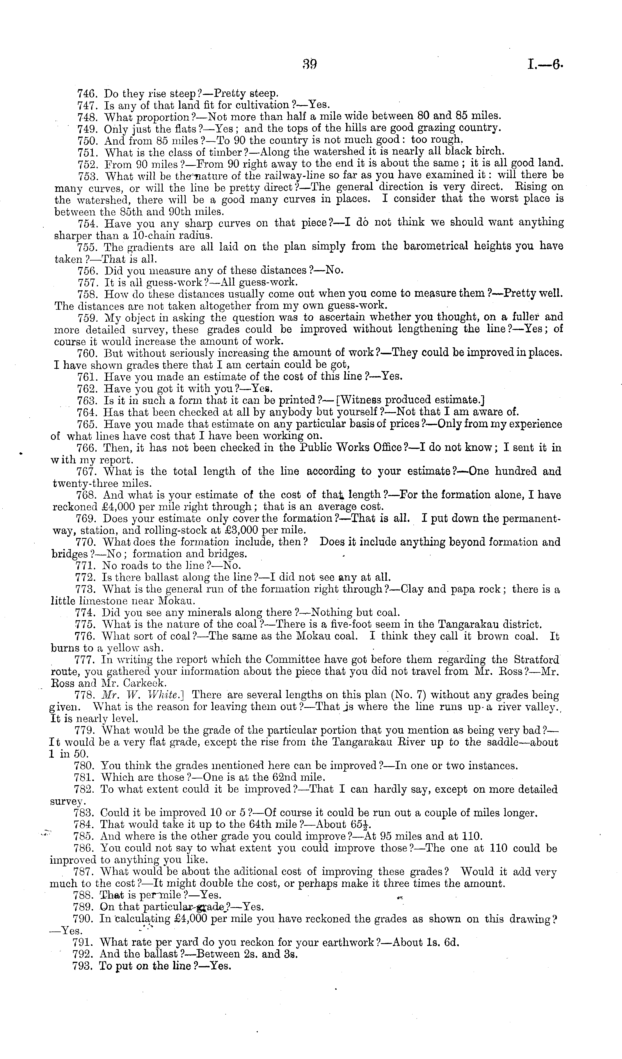746. Do they rise steep?— Pretty steep. 747. Is any of that land fit for cultivation ?—Yes. 748. "What proportion? —Not more than half a mile wide between 80 and 85 miles. ' 749. Only just the flats ?—Yes ; and the tops of the hills are good grazing country. 750. And from 85 miles ?—To 90 the country is not much good : too rough. 751. What is the class of timber ?—Along the watershed it is nearly all black birch. 752. From 90 miles ? —From 90 right away to the end it is about the same ; it is all good land. 753. What will be the^nature of the railway-line so far as you have examined it: will there be many curves, or will the line be pretty direct ?—The general direction is very direct. Eising on the watershed, there will be a good many curves in places. I consider that the worst place is between the 85th and 90th miles. 754. Have you any sharp curves on that piece?—l do not think wo should want anything sharper than a 10-cham radius. 755. The gradients are all laid on the plan simply from the barometrical heights you have taken ?—That is all. 756. Did you measure any of these distances ?—No. 757. It is all guess-work?— All guess-work. 758. How do these distances usually come out when you come to measure them ?—Pretty well. The distances are not taken altogether from my own guess-work. 759. My object in asking the question was to ascertain whether you thought, on a fuller and more detailed survey, these grades could be improved without lengthening the line ?—Yes; of course it would increase the amount of work. 760. But without seriously increasing the amount of work ?—They could be improved in places. I have shown grades there that I am certain could be got, 761. Have you made an estimate of the cost of this line ? —Yes. 762. Have you got it with you?— Yes. 763. Is it in such a form that it can be printed ? — [Witness produced estimate.] 764. Has that been checked at all by anybody but yourself ?—Not that I am aware of. 765. Have you made that estimate on any particular basis of prices ?—Only from my experience of what lines have cost that I have been working on. 766. Then, it has not been checked in the Public Works Office ?—I do not know; I sent it in with my report. 767. What is the total length of the line according to your estimate ?—One hundred and twenty-three miles. 768. And what is your estimate of the cost of that length ?—For the formation alone, I have reckoned £4,000 per mile right through; that is an average cost. 769. Does your estimate only cover the formation?— That is all. I put down the permanentway, station, and rolling-stock at £3,000 per mile. 770. What does the formation include, then ? Does it include anything beyond formation and bridges ? —No ; formation and bridges. 771. No roads to the line ?—No. 772. Is there ballast along the line? —I did not see any at all. 773. What is the general run of the formation right through?— Clay and papa rock; there is a little limestone near Mokau. 774. Did you see any minerals along there ?—Nothing but coal. 775. What is the nature of the coal ?—There is a five-foot seem in the Tangarakau district. 776. What sort of coal ? —The same as the Mokau coal. I think they call it brown coal. It burns to a yellow ash. 777. In writing the report which the Committee have got before them regarding the Stratford route, you gathered your information about the piece that you did not travel from Mr. Boss?— Mr. Boss and Mr. Carkeek. 778. Mr. W. White.] There are several lengths on this plan (No. 7) without any grades being given. What is the reason for leaving them out ? —That js where the line runs up- a river valley., It is nearly level. 779. What would be the grade of the particular portion that you mention as being very bad ? — 11 would be a very flat grade, except the rise from the Tangarakau Biver up to the saddle—about 1 in 50. 780. You think the grades mentioned here can be improved ?—ln one or two instances. 781. Which are those ?—One is at the 62nd mile. 782. To what extent could it be improved ? —That I can hardly say, except on more detailed survey. 783. Could it be improved 10 or 5 ? —Of course it could be run out a couple of miles longer. 784. That would take it up to the 64th mile ?—About 65£. 785. And where is the other grade you could improve ? —At 95 miles and at 110. 786. You could not say to what extent you could improve those?— The one at 110 could be improved to anything you like. 787. What would be about the aditional cost of improving these grades? Would it add very much to the cost? —It might double the cost, or perhaps make it three times the amount. 788. That is permile ?—Yes. 789. On that particular grade?— Yes. 790. In calculating £4,000 per mile you have reckoned the grades as shown on this drawing ? —Yes. 791. What rate per yard do you reckon for your earthwork ?—About Is. 6d. 792. And the ballast ?—Between 2s. and 3s. 793. To put on the line ?—Yes.