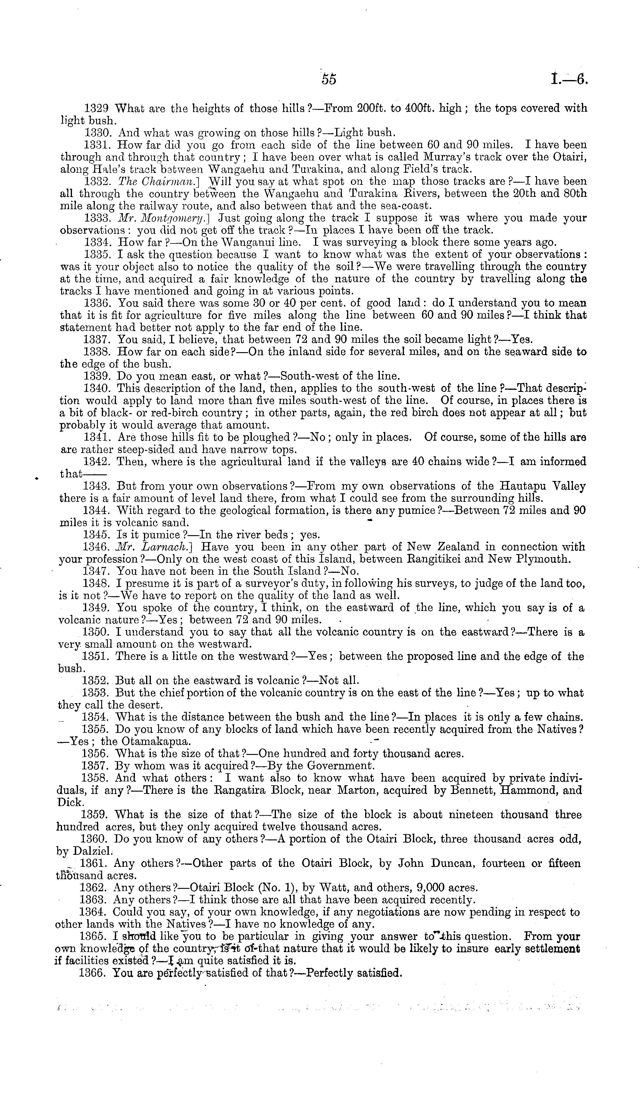 1329 What are the heights of those hills ?—From 200 ft. to 400 ft. high ; the tops covered with light bush. 1330. And what was growing on those hills ?—Light bush. 1331. How far did you go from each side of the line between 60 and 90 miles. I have been through and through that country; I have been over what is called Murray's track over the Otairi, along Hole's track bstween Wangaehu and Turakina, and along Field's track. 1332. The Chairman.'] Will you say at what spot on the map those tracks are ?—I have been all through the country between the Wangaehu and Turakina Eivers, between the 20th and 80th mile along the railway route, and also between that and the sea-coast. 1333. Mr. Montgomery .] Just going along the track I suppose it was where you made your observations : you did not get off the track ? —ln places I have been off the track. 1334. How far ? —On the Wanganui line. I was surveying a block there some years ago. 1335. I ask the question because I want to know what was the extent of your observations : was it your object also to notice the quality of the soil ?—We were travelling through the country at the time, and acquired a fair knowledge of the nature of the country by travelling along the tracks I have mentioned and going in at various pomts. 1336. You said there was some 30 or 40 per cent, of good land : do I understand you to mean that it is fit for agriculture for five miles along the line between 60 and 90 miles ?—I think that statement had better not apply to the far end of the line. 1337. You said, I believe, that between 72 and 90 miles the soil became light ?—Yes. 1338. How far on each side?—On the inland side for several miles, and on the seaward side to the edge of the bush. 1339. Do you mean east, or what ? —South-west of the line. 1340. This description of the land, then, applies to the south-west of the line ?—That description would apply to land more than five miles south-west of the line. Of course, in places there is a bit of black- or red-birch country; in other parts, again, the red birch does not appear at all; but probably it would average that amount. 1341. Are those hills fit to be ploughed ?— No ; only in places. Of course, some of the hills are are rather steep-sided and have narrow tops. 1342. Then, where is the agricultural land if the valleys are 40 chains wide?—l am informed that 1343. But from your own observations ? —From my own observations of the Hautapu Valley there is a fair amount of level land there, from what I could see from the surrounding hills. 1344. With regard to the geological formation, is there any pumice ?—Between 72 miles and 90 miles it is volcanic sand. 1345. Is it pumice ?—ln the river beds ; yes. 1346. Mr. Larnach.) Have you been in any other part of New Zealand in connection with your profession?— Only on the west coast of this Island, between Eangitikei and New Plymouth. 1347. You have not been in the South Island ?—No. 1348. I presume it is part of a surveyor's duty, in following his surveys, to Judge of the land too, is it not ?—We have to report on the quality of the land as well. 1349. You spoke of the country, I think, on the eastward of the line, which you say is of a volcanic nature ?—-Yes; between 72 and 90 miles. 1350. I understand you to say that all the volcanic country is on the eastward ?—There is a very small amount on the westward. 1351. There is a little on the westward?— Yes; between the proposed line and the edge of the bush. 1352. But all on the eastward is volcanic ? —Not all. 1353. But the chief portion of the volcanic country is on the east of the line ?—Yes; up to what they call the desert. 1354. What is the distance between the bush and the line ?—ln places it is only a few chains. 1355. Do you know of any blocks of land which have been recently acquired from the Natives ? —Yes ; the Otamakapua. 1356. What is the size of that?— One hundred and forty thousand acres. 1357. By whom was it acquired?—By the Government. 1358. And what others : I want also to know what have been acquired by private individuals, if any ? —There is the Eangatira Block, near Marton, acquired by Bennett, Hammond, and Dick. 1359. What is the size of that ?—The size of the block is about nineteen thousand three hundred acres, but they only acquired twelve thousand acres. 1360. Do you know of any others ? —A portion of the Otairi Block, three thousand acres odd, by Dalziel. 1361. Any others?— Other parts of the Otairi Block, by John Duncan, fourteen or fifteen thousand acres. 1362. Any others ?—Otairi Block (No. 1), by Watt, and others, 9,000 acres. 1363. Any others?—l think those are all that have been acquired recently. 1364. Could you say, of your own knowledge, if any negotiations are now pending in respect to other lands with the Natives ? —I have no knowledge of any. 1365. I should like you to be particular in giving your answer to"this question. From your own knowledge of the country, is it of that nature that it would be likely to insure early settlement if facilities existed ?—I -am quite satisfied it is. 1366. You are perfectly satisfied of that?— Perfectly satisfied.