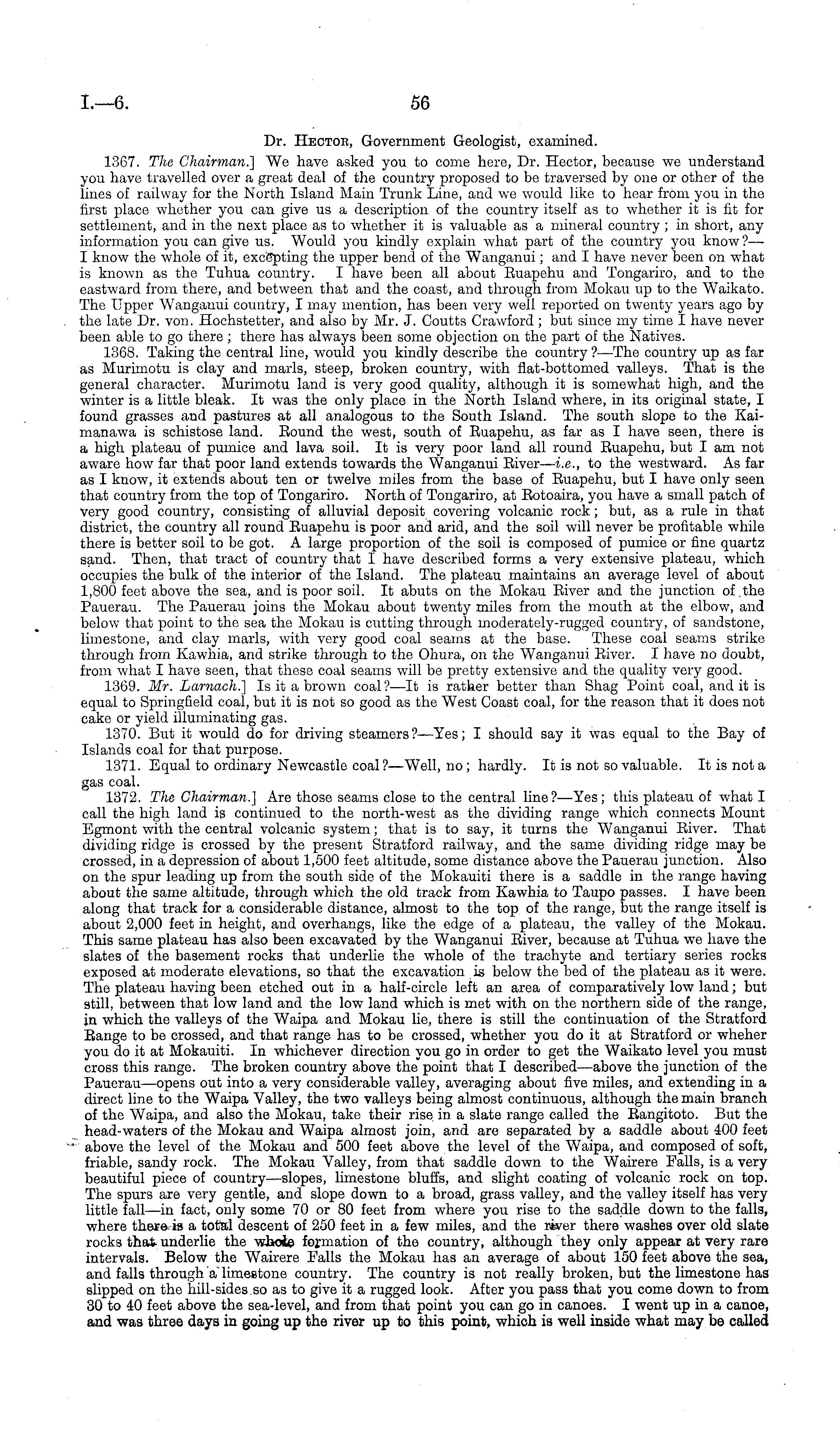 Dr. Hector, Government Geologist, examined. 1367. The Chairman.'] We have asked you to come here, Dr. Hector, because we understand you have travelled over a great deal of the country proposed to be traversed by one or other of the lines of railway for the North Island Main Trunk Line, and we would like to hear from you in the first place whether you can give us a description of the country itself as to whether it is fit for settlement, and in the next place as to whether it is valuable as a mineral country ; in short, any information you can give us. Would you kindly explain what part of the country you know?—I know the whole of it, excepting the upper bend of the Wanganui; and I have never been on what is known as the Tuhua country. I have been all about Euapehu and Tongariro, and to the eastward from there, and between that and the coast, and through from Mokau up to the Waikato. The Upper Wanganui country, I may mention, has been very well reported on twenty years ago by the late Dr. yon. Hochstetter, and also by Mr. J. Coutts Crawford; but since my time I have never been able to go there ; there has always been some objection on the part of the Natives. 1368. Taking the central line, would you kindly describe the country ?—The country up as far as Murimotu is clay and marls, steep, broken country, with flat-bottomed valleys. That is the general character. Murimotu land is very good quality, although it is somewhat high, and the winter is a little bleak. It was the only place in the North Island where, in its original state, I found grasses and pastures at all analogous to the South Island. The south slope to the Kaimanawa is schistose land. Round the west, south of Euapehu, as far as I have seen, there is a high plateau of pumice and lava soil. It is very poor land all round Euapehu, but lam not aware how far that poor land extends towards the Wanganui Eiver— i.e., to the westward. As far as I know, it extends about ten or twelve miles from the base of Euapehu, but I have only seen that country from the top of Tongariro. North of Tongariro, at Eotoaira, you have a small patch of very good country, consisting of alluvial deposit covering volcanic rock; but, as a rule in that district, the country all round Euapehu is poor and arid, and the soil will never be profitable while there is better soil to be got. A large proportion of the soil is composed of pumice or fine quartz sand. Then, that tract of country that I have described forms a very extensive plateau, which occupies the bulk of the interior of the Island. The plateau maintains an average level of about 1,800 feet above the sea, and is poor soil. It abuts on the Mokau Eiver and the junction of .the Pauerau. The Pauerau joins the Mokau about twenty miles from the mouth at the elbow, and below that point to the sea the Mokau is cutting through moderately-rugged country, of sandstone, limestone, and clay marls, with very good coal seams at the base. These coal seams strike through from Kawhia, and strike through to the Ohura, on the Wanganui Eiver. I have no doubt, from what I have seen, that these coal seams will be pretty extensive and the quality very good. 1369. Mr. Larnach.] Is it a brown coal?—lt is rather better than Shag Point coal, and it is equal to Springfield coal, but it is not so good as the West Coast coal, for the reason that it does not cake or yield illuminating gas. 1370. But it would do for driving steamers ?—Yes; I should say it was equal to the Bay of Islands coal for that purpose. 1371. Equal to ordinary Newcastle coal?— Well, no; hardly. It is not so valuable. It is not a gas coal. 1372. The Chairman.] Are those seams close to the central line?— Yes ; this plateau of what I call the high land is continued to the north-west as the dividing range which connects Mount Egmont with the central volcanic system; that is to say, it turns the Wanganui Eiver. That dividing ridge is crossed by the present Stratford railway, and the same dividing ridge may be crossed, in a depression of about 1,500 feet altitude, some distance above the Pauerau junction. Also on the spur leading up from the south side of the Mokauiti there is a saddle in the range having about the same altitude, through which the old track from Kawhia to Taupo passes. I have been along that track for a considerable distance, almost to the top of the range, but the range itself is about 2,000 feet in height, and overhangs, like the edge of a plateau, the valley of the Mokau. This same plateau has also been excavated by the Wanganui Eiver, because at Tuhua we have the slates of the basement rocks that underlie the whole of the trachyte and tertiary series rocks exposed at moderate elevations, so that the excavation is below the bed of the plateau as it were. The plateau having been etched out in a half-circle left an area of comparatively low land; but still, between that low land and the low land which is met with on the northern side of the range, jn which the valleys of the Waipa and Mokau lie, there is still the continuation of the Stratford Eange to be crossed, and that range has to be crossed, whether you do it at Stratford or wheher you do it at Mokauiti. In whichever direction you go in order to get the Waikato level you must cross this range. The broken country above the point that I described—above the junction of the Pauerau —opens out into a very considerable valley, averaging about five miles, and extending in a direct line to the Waipa Valley, the two valleys being almost continuous, although the main branch of the Waipa, and also the Mokau, take their rise in a slate range called the Eangitoto. But the head-waters of the Mokau and Waipa almost join, and are separated by a saddle about 400 feet above the level of the Mokau and 500 feet above the level of the Waipa, and composed of soft, friable, sandy rock. The Mokau Valley, from that saddle down to the Wairere Falls, is a very beautiful piece of country—slopes, limesto