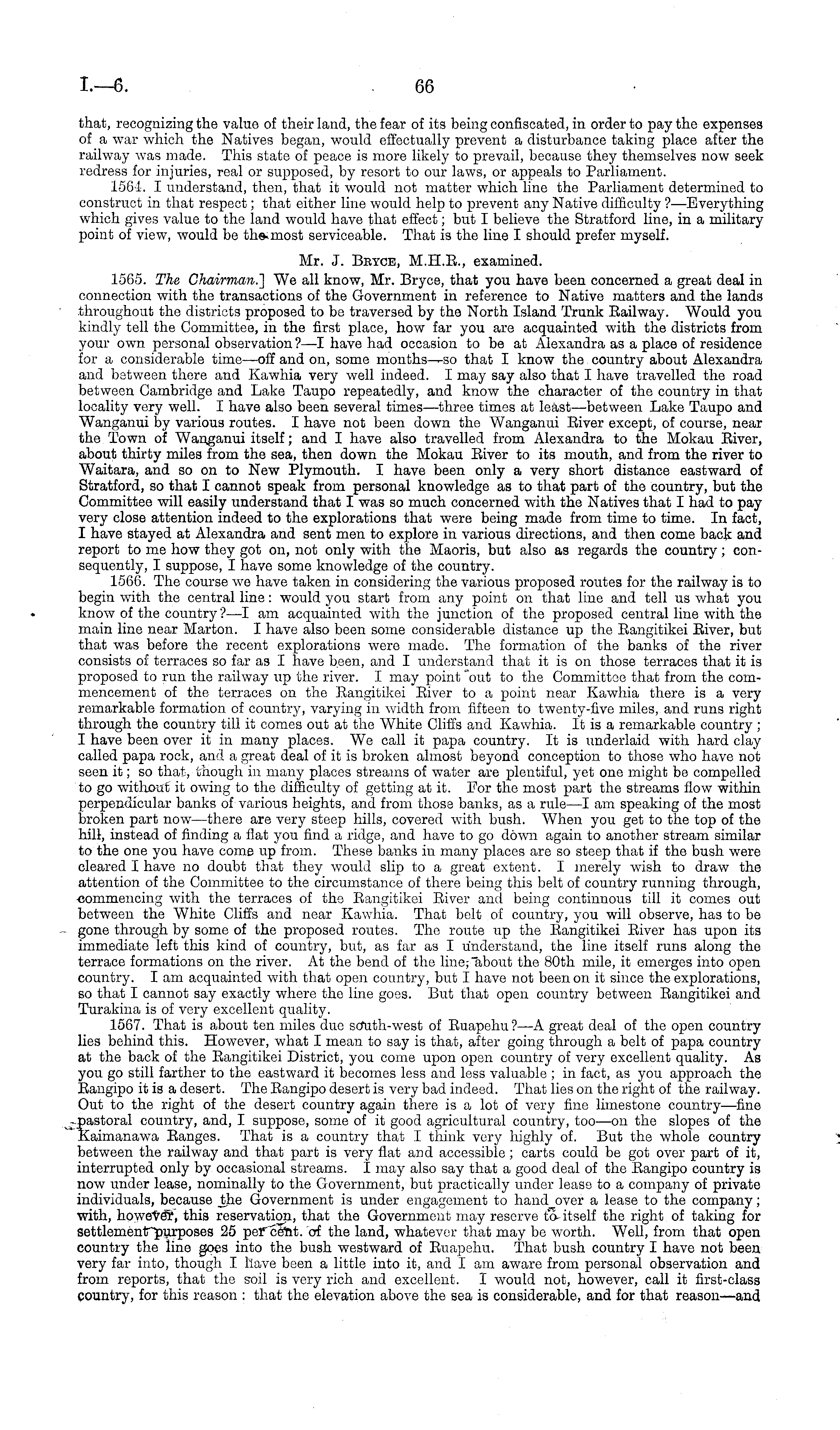 that, recognizing the value of their land, the fear of its being confiscated, in order to pay the expenses of a war which the Natives began, would effectually prevent a disturbance taking place after the railway was made. This state of peace is more likely to prevail, because they themselves now seek redress for injuries, real or supposed, by resort to our laws, or appeals to Parliament. 1564. I understand, then, that it would not matter which line the Parliament determined to construct in that respect; that either line would help to prevent any Native difficulty ?—Everything which gives value to the land would have that effect; but I believe the Stratford line, in a military point of view, would be th& most serviceable. That is the line I should prefer myself. Mr. J. Brtge, M.H.8., examined. 1565. The Chairman.] We all know, Mr. Bryce, that you have been concerned a great deal in connection with the transactions of the Government in reference to Native matters and the lands throughout the districts proposed to be traversed by the North Island Trunk Eailway. Would you kindly tell the Committee, in the first place, how far you are acquainted with the districts from your own personal observation ? —I have had occasion to be at Alexandra as a place of residence for a considerable time—off and on, some months—so that I know the country about Alexandra and between there and Kawhia very well indeed. I may say also that I have travelled the road between Cambridge and Lake Taupo repeatedly, and know the character of the country in that locality very well. I have also been several times—three times at least—between Lake Taupo and Wanganui by various routes. I have not been down the Wanganui Eiver except, of course, near the Town of Wanganui itself; and I have also travelled from Alexandra to the Mokau Eiver, about thirty miles from the sea, then down the Mokau Eiver to its mouth, and from the river to Waitara, and so on to New Plymouth. I have been only a very short distance eastward of Stratford, so that I cannot speak from personal knowledge as to that part of the country, but the Committee will easily understand that I was so much concerned with the Natives that I had to pay very close attention indeed to the explorations that were being made from time to time. In fact, I have stayed at Alexandra and sent men to explore in various directions, and then come back and report to me how they got on, not only with the Maoris, but also as regards the country; consequently, I suppose, I have some knowledge of the country. 1566. The course we have taken in considering the various proposed routes for the railway is to begin with the central line : would you start from any point on that line and tell us what you know of the country ?—I am acquainted with the junction of the proposed central line with the main line near Marton. I have also been some considerable distance up the Eangitikei Eiver, but that was before the recent explorations were made. The formation of the banks of the river consists of terraces so far as I have been, and I understand that it is on those terraces that it is proposed to run the railway up the river. I may point out to tho Committee that from the commencement of the terraces on the Eangitikei Eiver to a point near Kawhia there is a very remarkable formation of country, varying in width from fifteen to twenty-five miles, and runs right through the country till it comes out at the White Cliffs and Kawhia. It is a remarkable country ; I have been over it in many places. We call it papa country. It is underlaid with hard clay called papa rock, and a great deal of it is broken almost beyond conception to those who have not seen it; so that, though in many places streams of water are plentiful, yet one might be compelled to go without it owing to the difficulty of getting at it. For the most part the streams flow within perpendicular banks of various heights, and from those banks, as a rule—l am speaking of the most broken part now—there are very steep hills, covered with bush. When you get to the top of the hill, instead of finding a fiat you find a ridge, and have to go down again to another stream similar to the one you have come up from. These banks in many places are so steep that if the bush were cleared I have no doubt that they would slip to a great extent. I merely wish to draw the attention of the Committee to the circumstance of there being this belt of country running through, commencing with the terraces of the Eangitikei Eiver and being continnous till it comes out between the White Cliffs and near Kawhia. That belt of country, you will observe, has to be gone through by some of the proposed routes. The route up the Eangitikei Eiver has upon its immediate left this kind of country, but, as far as I understand, the line itself runs along the terrace formations on the river. At tho bend of the line; "about the 80th mile, it emerges into open country. lam acquainted with that open country, but I have not been on it since the explorations, so that I cannot say exactly where the line goes. But that open country between Eangitikei and Turakina is of very excellent quality. 1567. That is about ten miles due sduth-west of Euapehu?—A great deal of the open country lies behind this. However, what I mean to say is that, after going through a belt of papa country at the back of the Eangitikei District, you come upon open country of very excellent quality. As you go still farther to the eastward it becomes less and less valuable ; in fact, as you approach the Eangipo it is a desert. The Eangipo desert is very bad indeed. That lies on the right of the railway. Out to the right of the desert country again there is a lot of very fine limestone country—fine pastoral country, and, I suppose, some of it good agricultural country, too —on the slopes of the Kaimanawa Eanges. That is a country that I think very highly of. But the whole country between the railway and