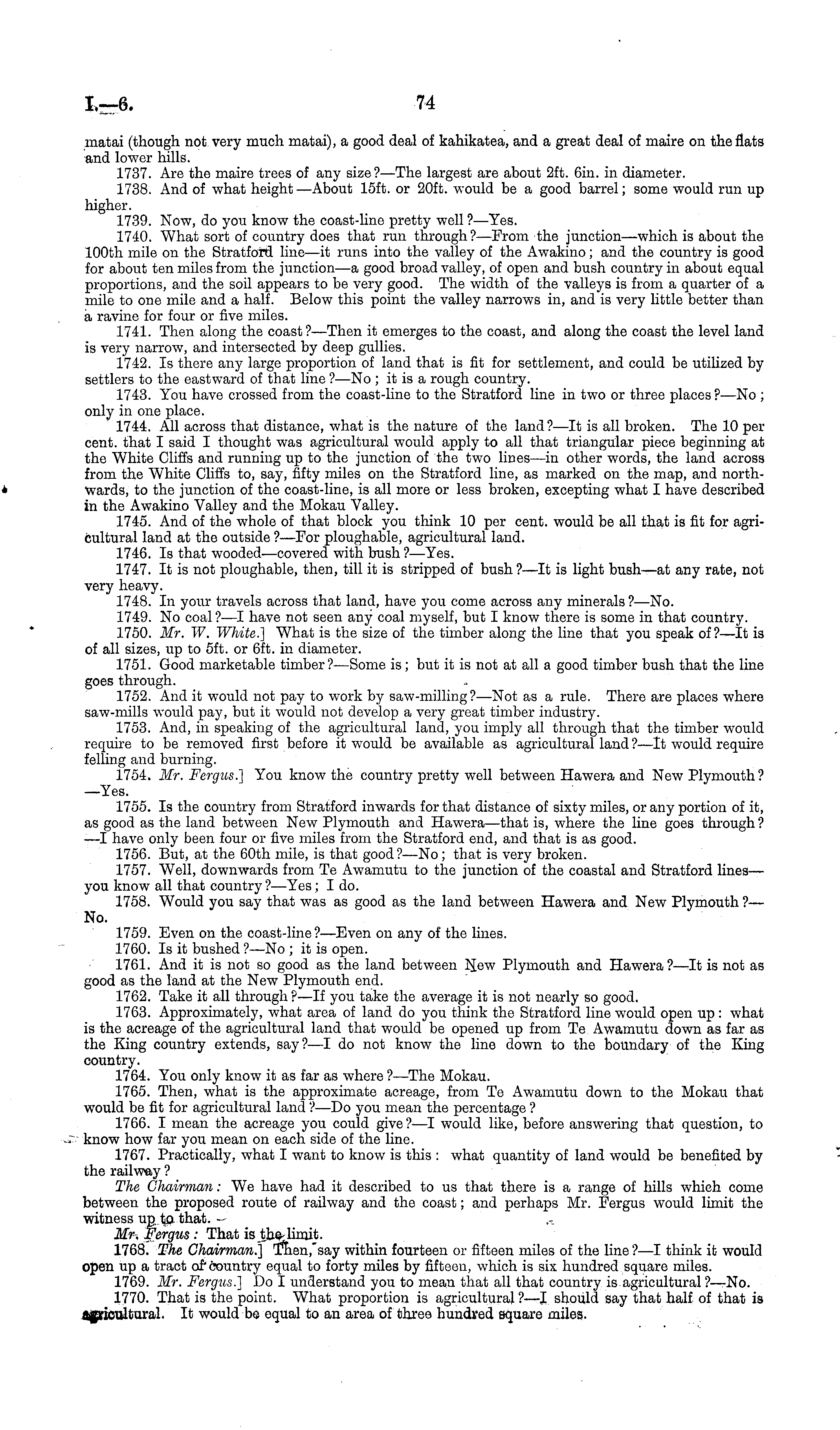 matai (though not very much matai), a good deal of kahikatea, and a great deal of maire on the flats and lower hills. 1737. Are the maire trees of any size?— The largest are about 2ft. 6in. in diameter. 1738. And of what height —About 15ft. or 20ft. would be a good barrel; some would run up higher. 1739. Now, do you know the coast-line pretty well ?—Yes. 1740. What sort of country does that run through?— Prom the junction—which is about the 100 th mile on the Stratford line—it runs into the valley of the Awakino; and the country is good for about ten miles from the junction—a good broad valley, of open and bush country in about equal proportions, and the soil appears to be very good. The width of the valleys is from a quarter of a mile to one mile and a half. Below this point the valley narrows in, and is very little better than a ravine for four or five miles. 1741. Then along the coast?— Then it emerges to the coast, and along the coast the level land is very narrow, and intersected by deep gullies. 1742. Is there any large proportion of land that is fit for settlement, and could be utilized by settlers to the eastward of that line ?—No ; it is a rough country. 1743. You have crossed from the coast-line to the Stratford line in two or three places ? —No ; only in one place. 1744. All across that distance, what is the nature of the land?—lt is all broken. The 10 per cent, that I said I thought was agricultural would apply to all that triangular piece beginning at the White Cliffs and running up to the junction of the two lines—in other words, the land across from the White Cliffs to, say, fifty miles on the Stratford line, as marked on the map, and northwards, to the junction of the coast-line, is all more or less broken, excepting what I have described in the Awakino Valley and the Mokau Valley. 1745. And of the whole of that block you think 10 per cent, would be all that is fit for agricultural land at the outside ?—For ploughable, agricultural land. 1746. Is that wooded—covered with bush ?—Yes. 1747. It is not ploughable, then, till it is stripped of bush ?—lt is light bush—at any rate, not very heavy. 1748. In your travels across that land, have you come across any minerals ?—No. 1749. No coal ? —I have not seen any coal myself, but I know there is some in that country. 1750. Mr. W. White.] What is the size of the timber along the line that you speak of?—lt is of all sizes, up to sft. or 6ft. in diameter. 1751. Good marketable timber?— Some is; but it is not at all a good timber bush that the line goes through. 1752. And it would not pay to work by saw-milling ?—Not as a rule. There are places where saw-mills would pay, but it would not develop a very great timber industry. 1753. And, in speaking of the agricultural land, you imply all through that the timber would require to be removed first before it would be available as agricultural land ?—lt would require felling and burning. 1754. Mr. Fergus.'] You know the country pretty well between Hawera and New Plymouth? —Yes. 1755. Is the country from Stratford inwards for that distance of sixty miles, or any portion of it, as good as the land between New Plymouth and Hawera—that is, where the line goes through? •—I have only been four or five miles from the Stratford end, and that is as good. 1756. But, at the 60th mile, is that good?—No ; that is very broken. 1757. Well, downwards from Te Awamutu to the junction of the coastal and Stratford lines— you know all that country?— Yes; I do. 1758. Would you say that was as good as the land between Hawera and New Plymouth ?— No. 1759. Even on the coast-line?— Even on any of the lines. 1760. Is it bushed ?—No ;it is open. 1761. And it is not so good as the land between N_ew Plymouth and Hawera?—lt is not as good as the land at the New Plymouth end. 1762. Take it all through ?—lf you take the average it is not nearly so good. 1763. Approximately, what area of land do you think the Stratford line would open up : what is the acreage of the agricultural land that would be opened up from Te Awamutu down as far as the King country extends, say?—l do not know the line down to the boundary of the King country. 1764. You only know it as far as where ?—The Mokau. 1765. Then, what is the approximate acreage, from Te Awamutu down to the Mokau that would be fit for agricultural land ?—Do you mean the percentage ? 1766. I mean the acreage you could give?—l would like, before answering that question, to know how far you mean on each side of the line. 1767. Practically, what I want to know is this : what quantity of land would be benefited by the railway ? The Chairman: We have had it described to us that there is a range of hills which come between the proposed route of railway and the coast; and perhaps Mr. Fergus would limit the witness up to that. Mr. Fergus: That is the limit. 1768. The Chairman.] Then, say within fourteen or fifteen miles of the line ?—I think it would open up a tract of country equal to forty miles by fifteen, which is six hundred square miles. 1769. Mr. Fergus.] Do I understand you to mean that all that country is agricultural ?—No. 1770. That is the point. What proportion is agricultural ?—I should say that half of that is agricultural. It would be equal to an area of three hundred square miles.